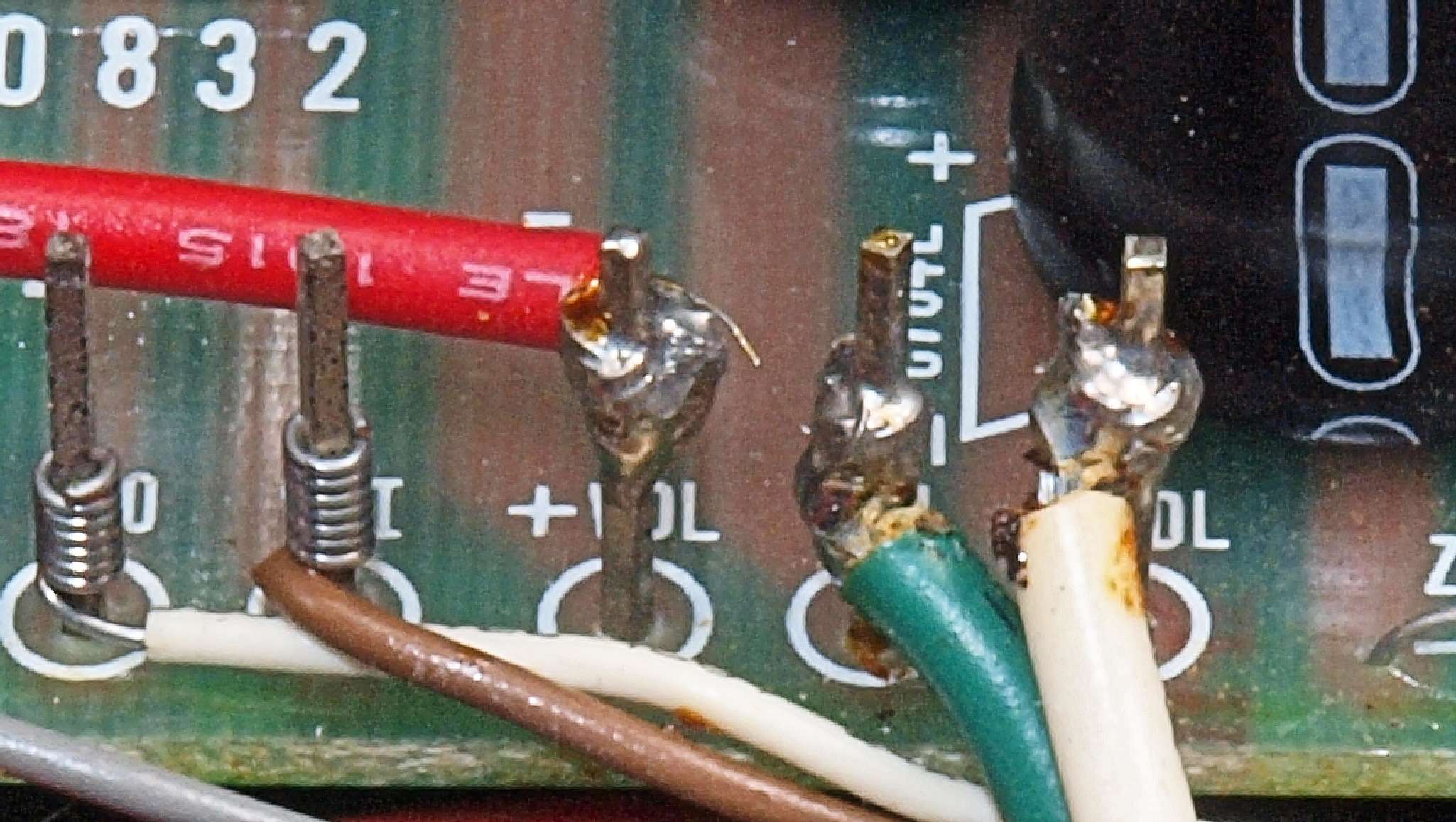 | C91. 修理前 電源ケーブル取り付け部。電源コードが細いのと、交換されている。 |
