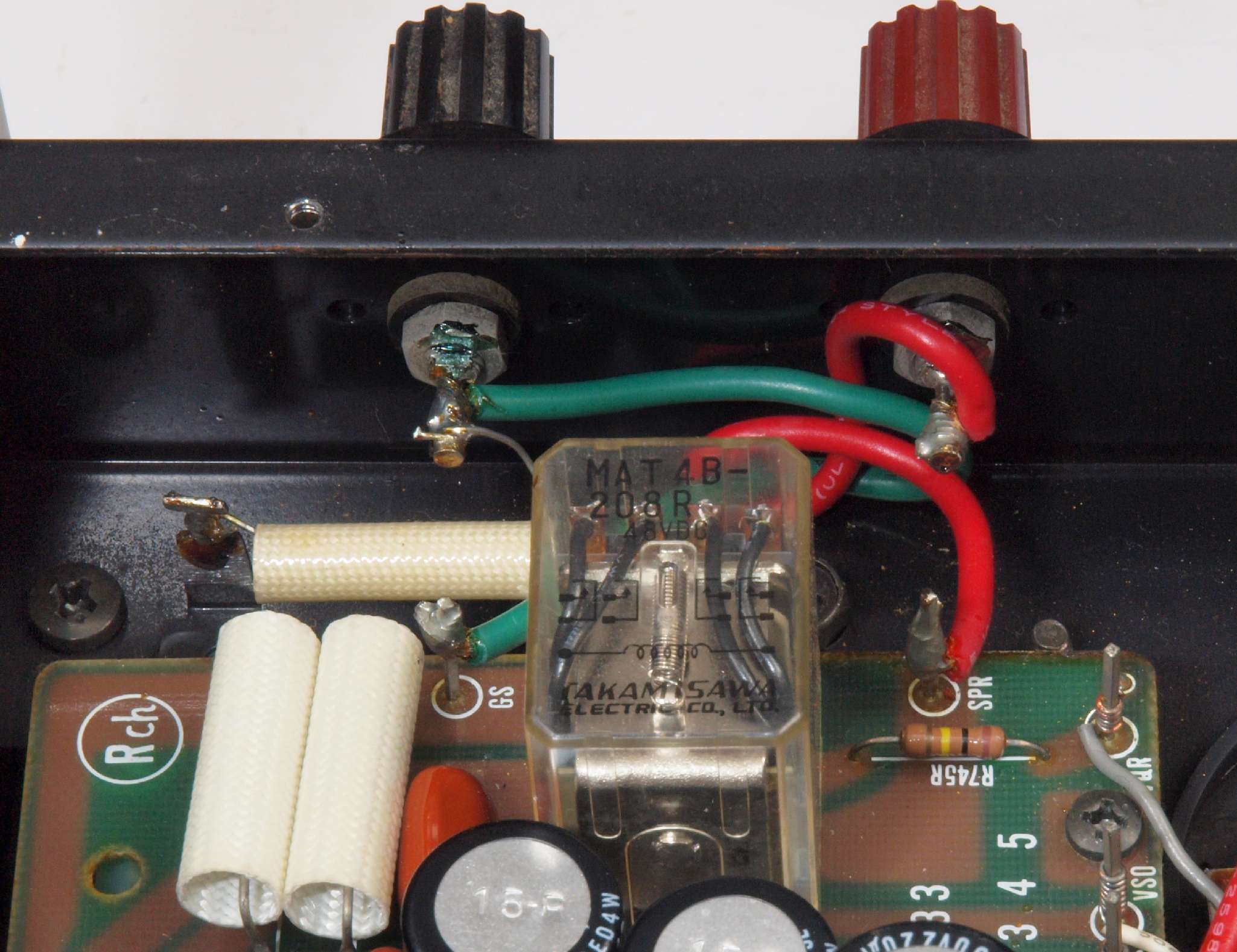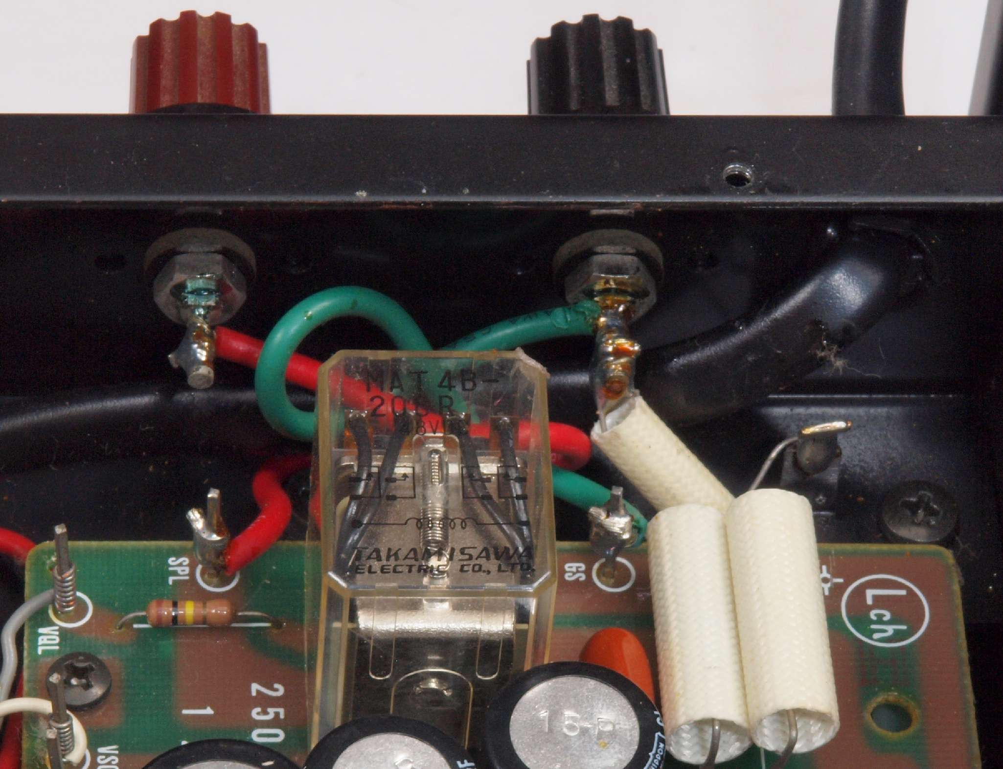 | C76. 修理後 R−SP端子裏配線。 WBTのネジ止めを生かし、ネジ止め接続+半田接続のW配線にした。理由はこちら |