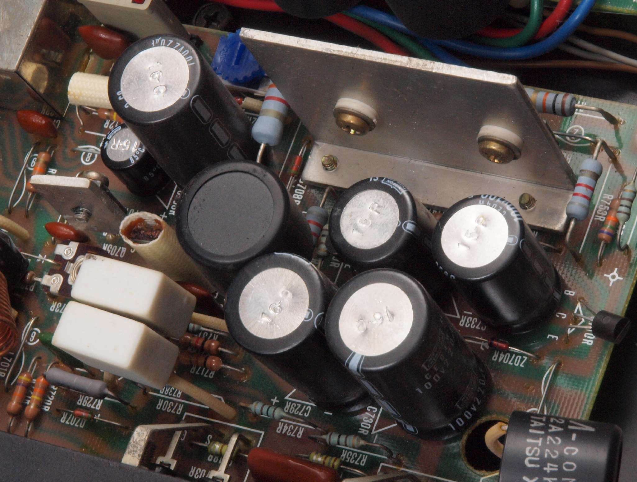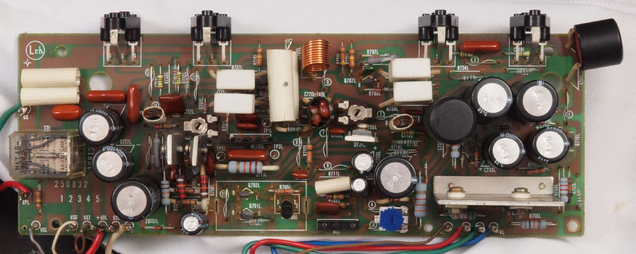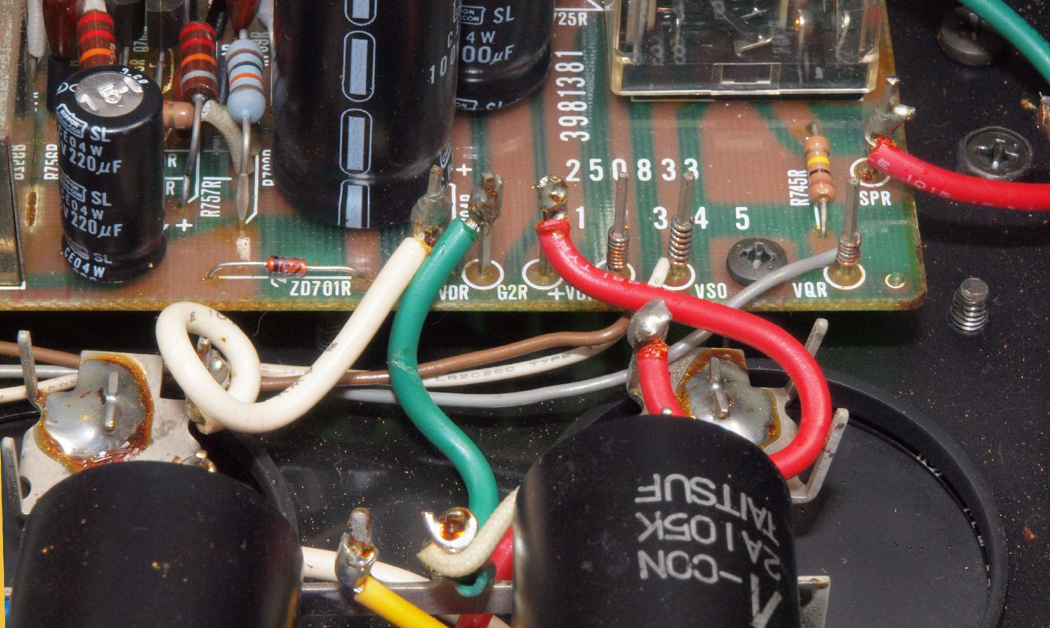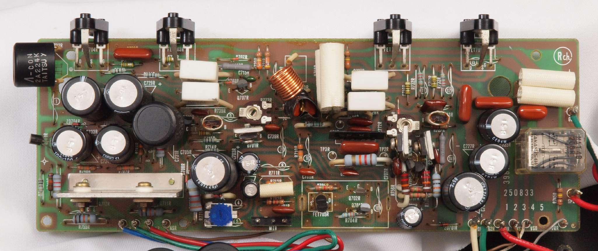 | A34. 点検中 R側ドライブ基板の電解コンデンサー類、頭のビニールの剥けは少ない! |