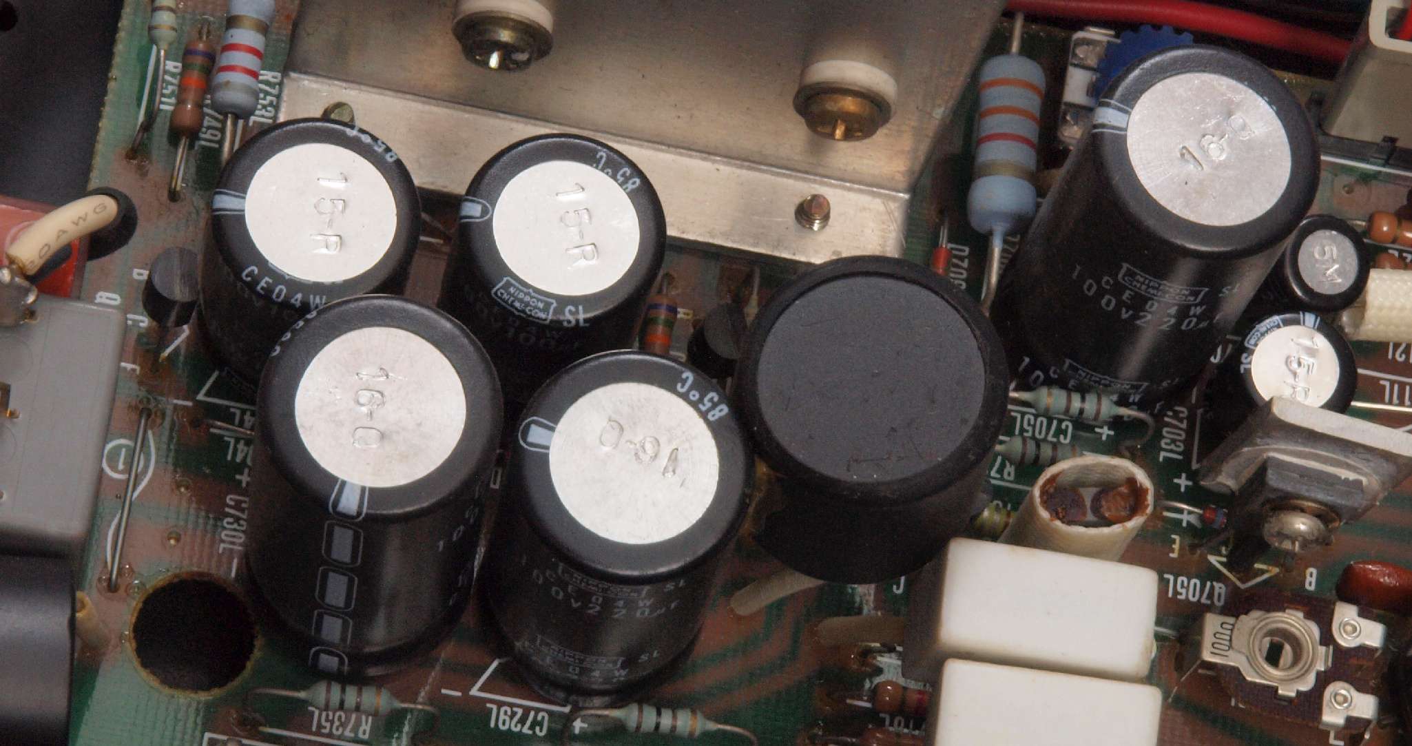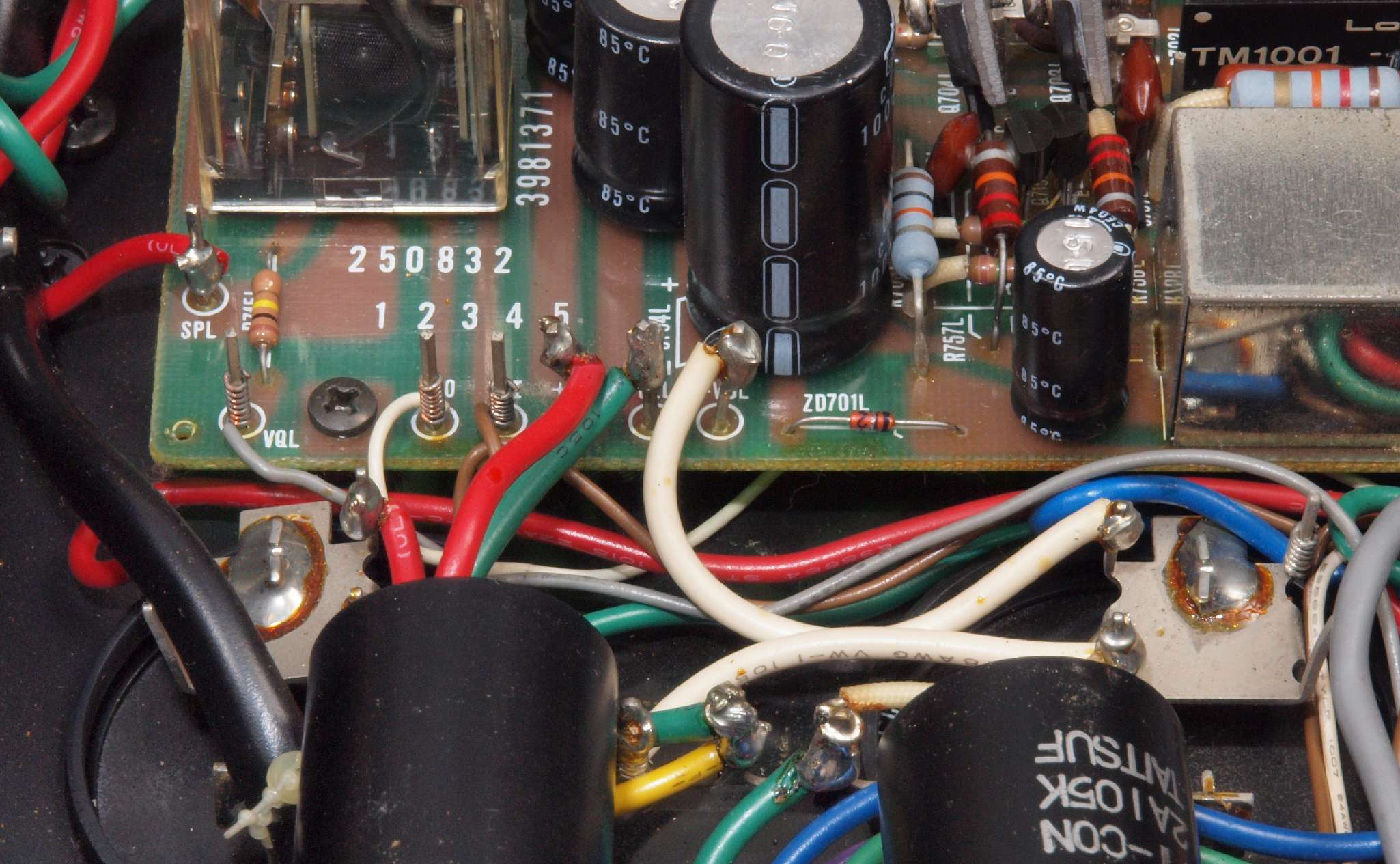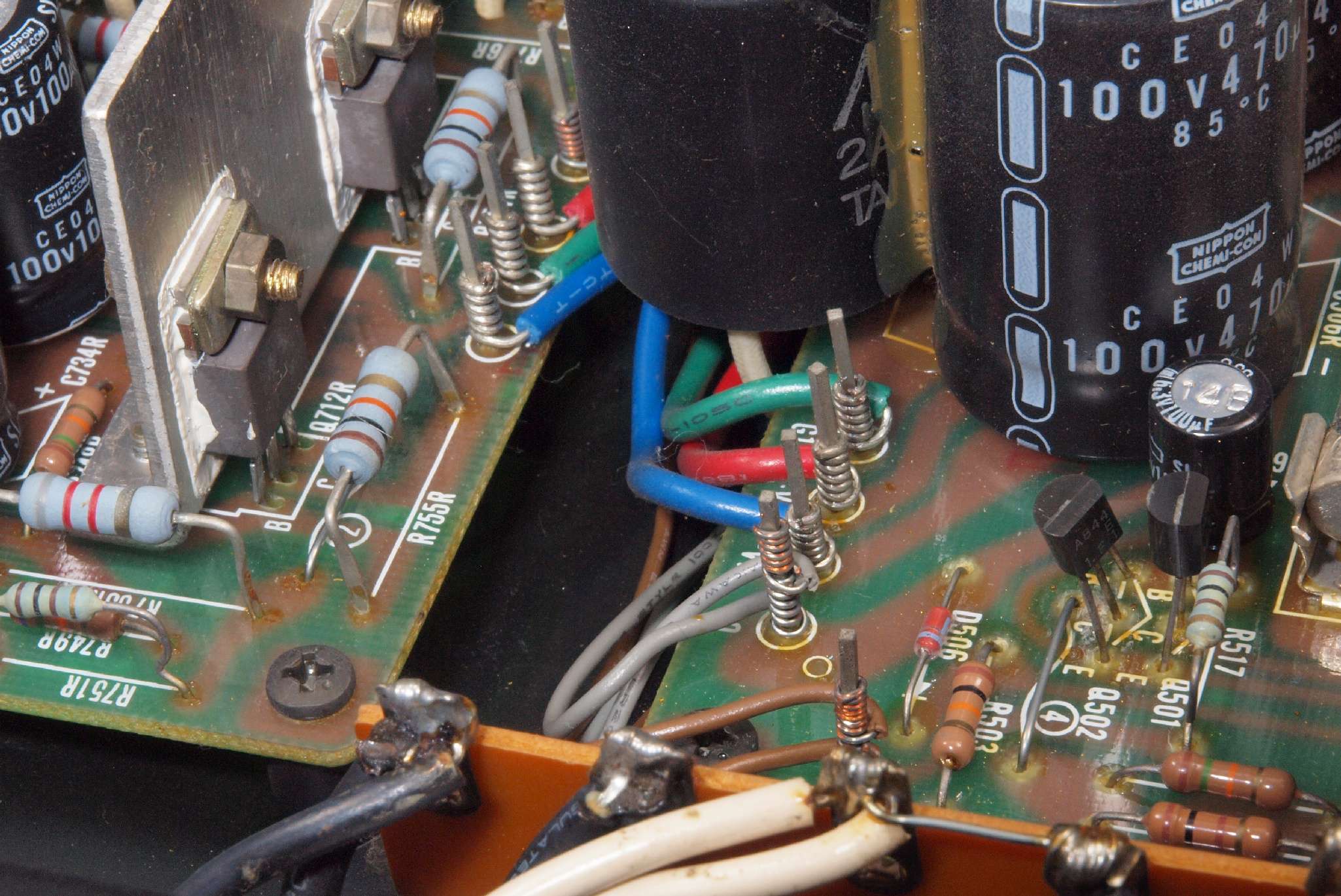 | A34. 点検中 R側ドライブ基板の電解コンデンサー類、頭のビニールの剥けは少ない! |