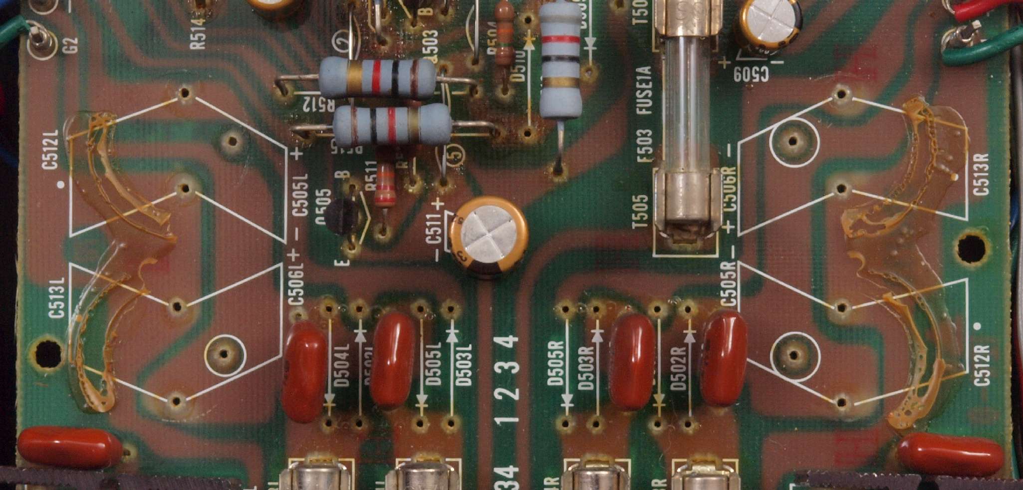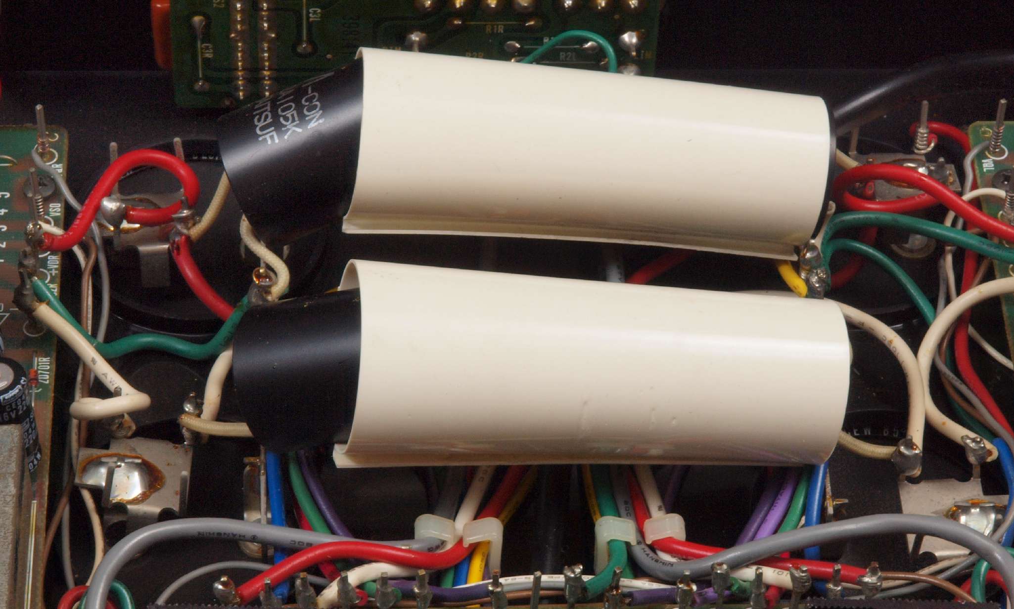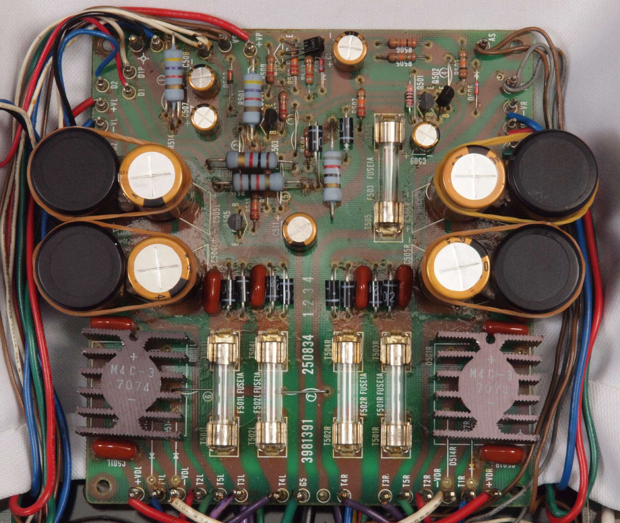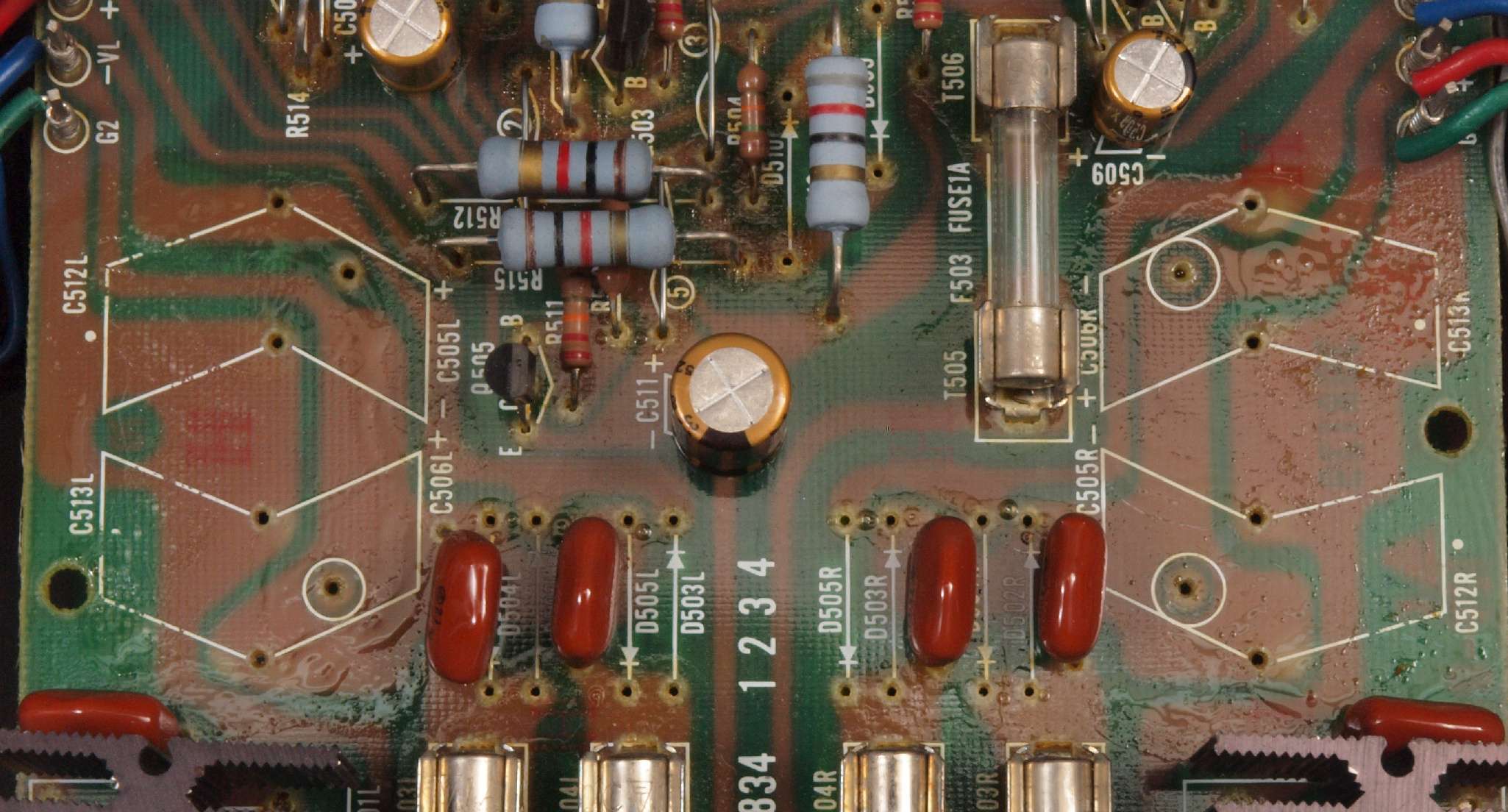 | A34. 点検中 R側ドライブ基板の電解コンデンサー類、頭のビニールの剥けは少ない! |