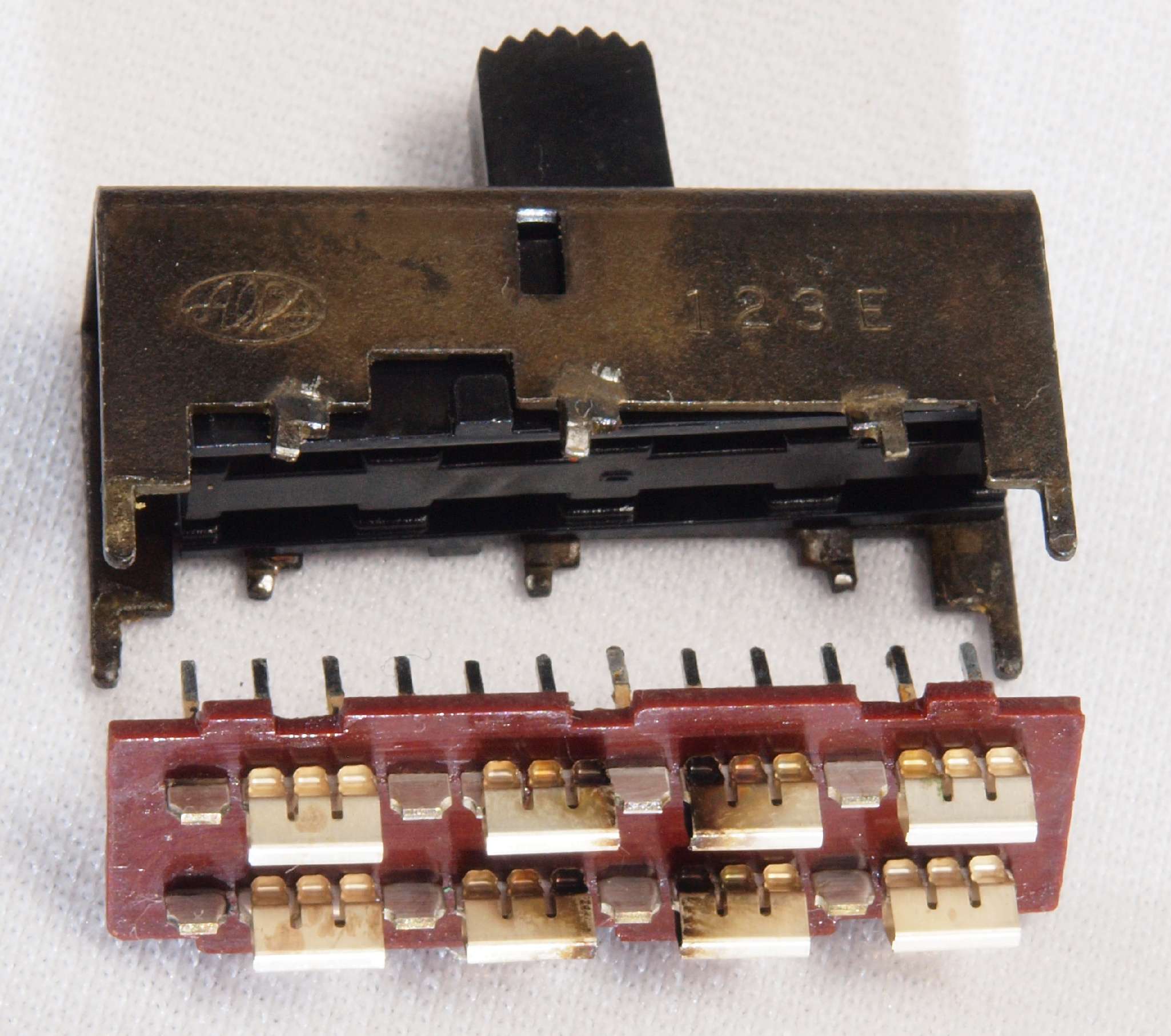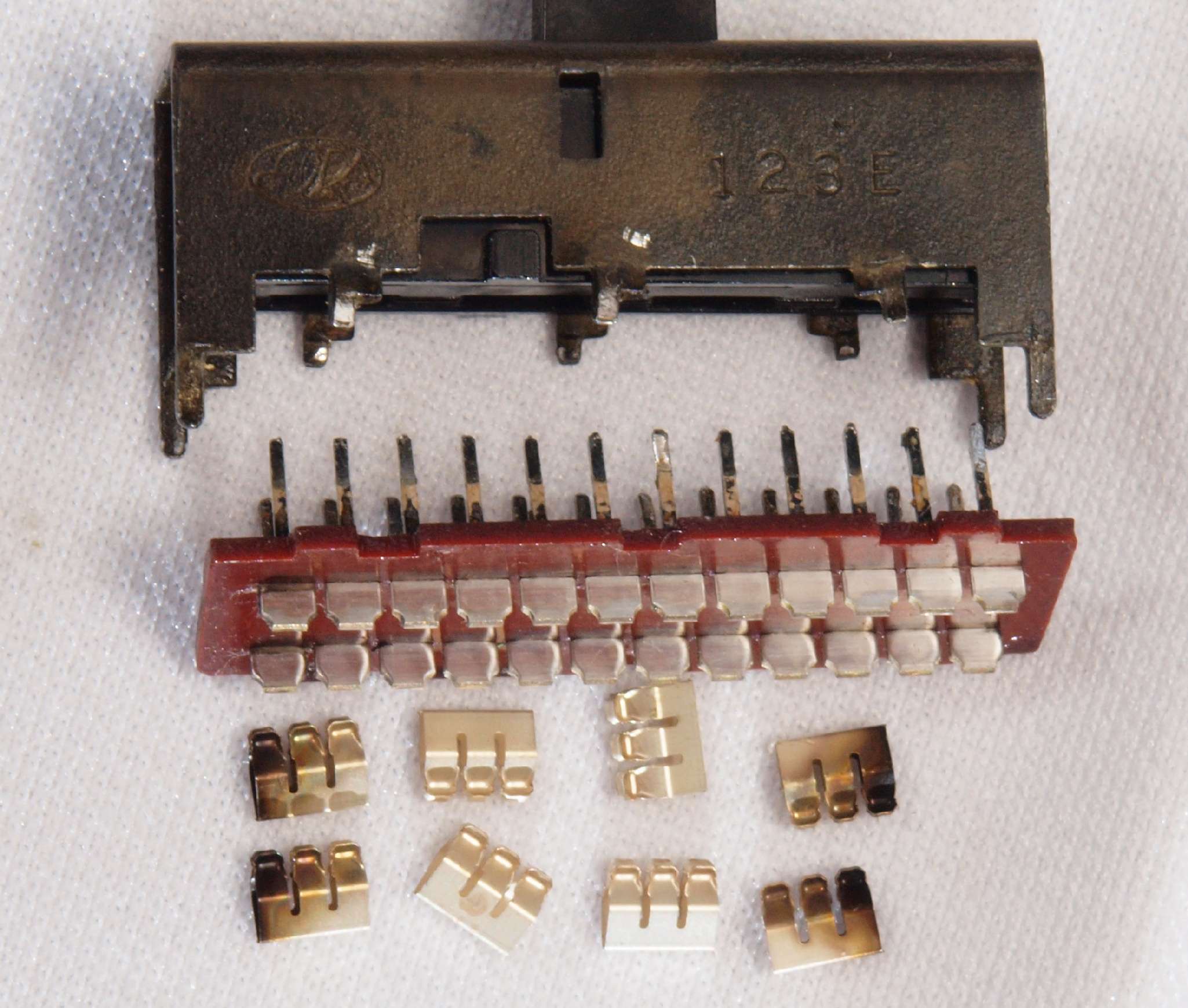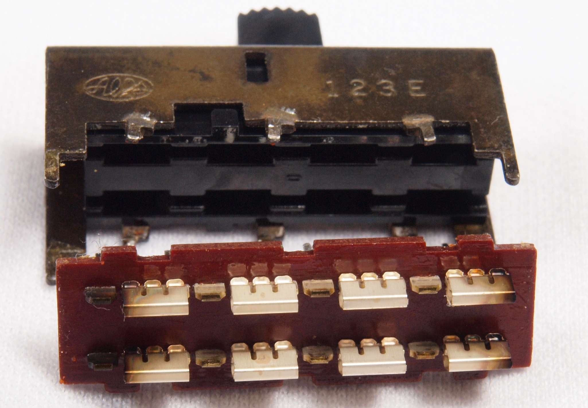 | C6C. 修理後 RCA端子基板の切り換えSW分解。使用するのは端の1回路のみ、内側の綺麗な接触子と交換して組む。 |