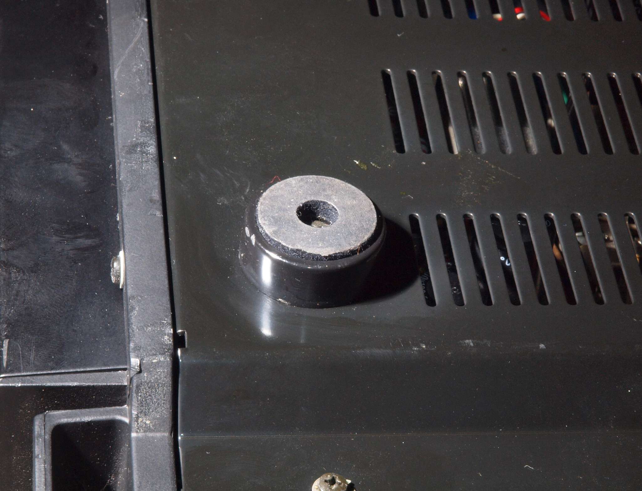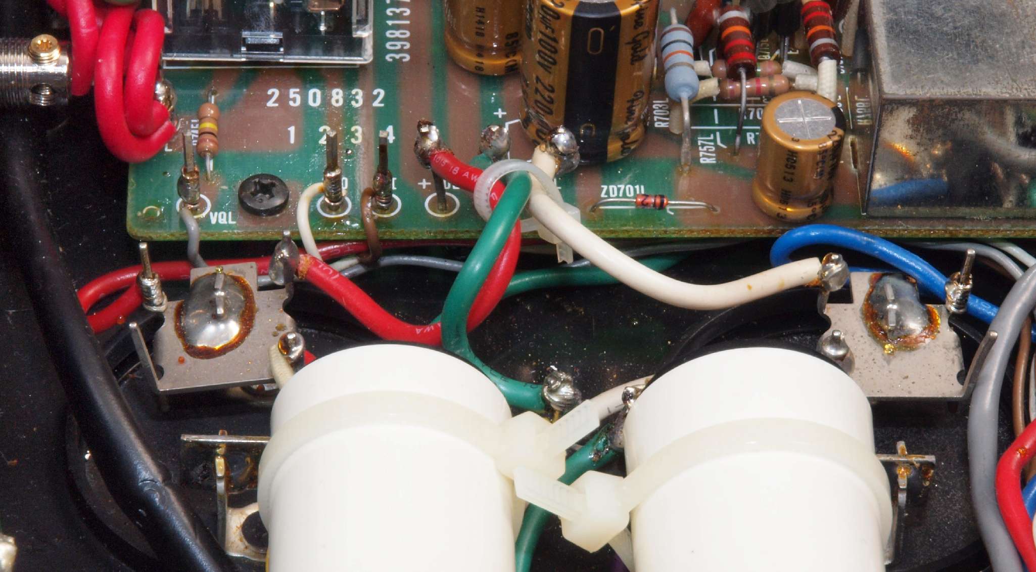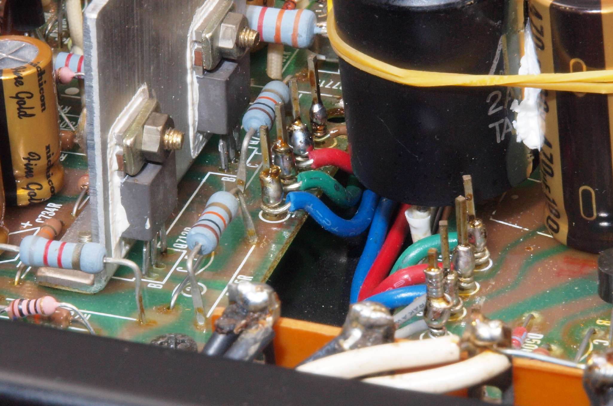 | A. 修理前の状況。 画像をクリックすると、大きく(横幅2050ドット)表示されます。 A11. 点検中 前から見る。右側電源トランスの塗装に浮き(ケースの錆の為)あり。 |
