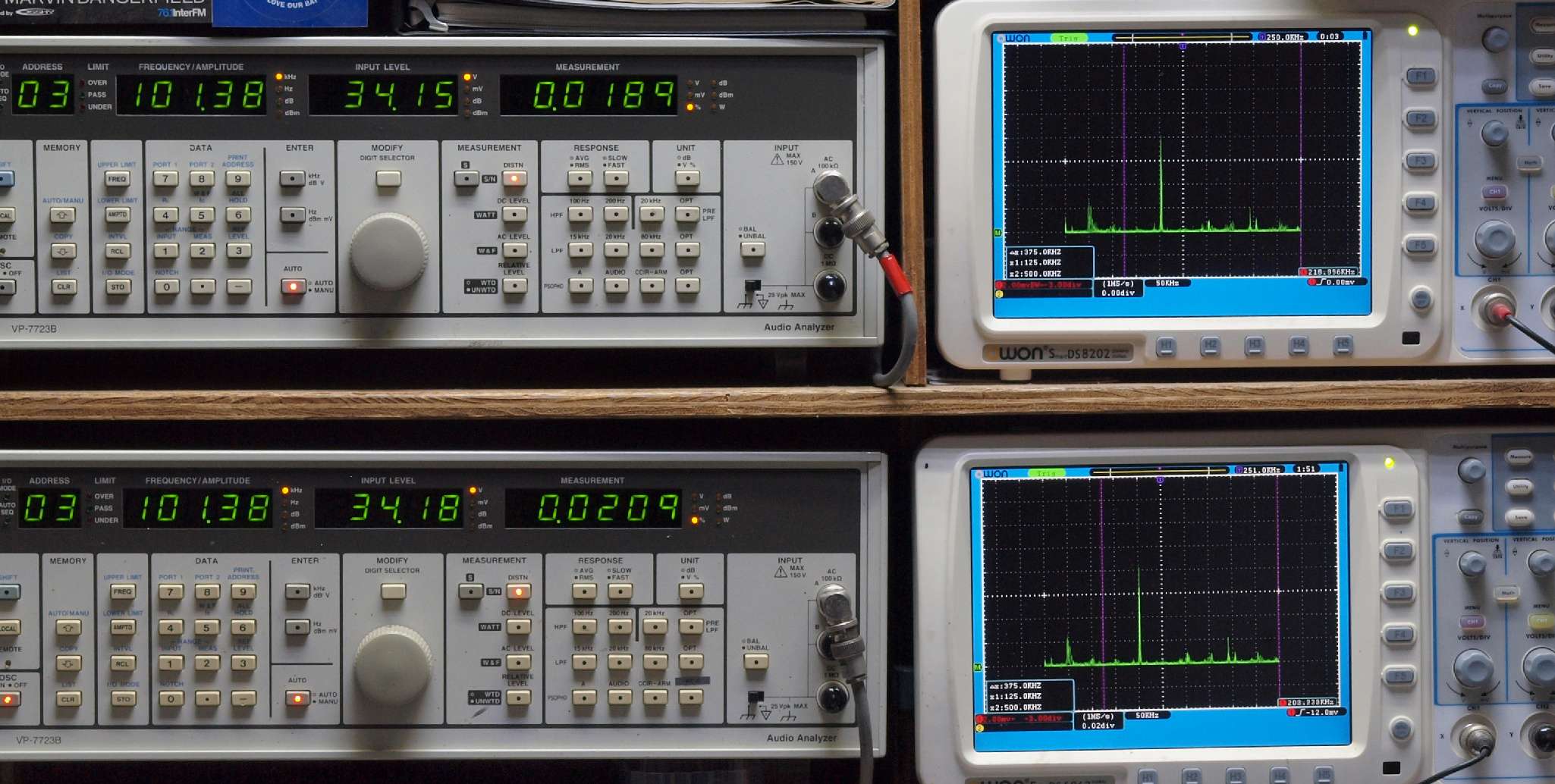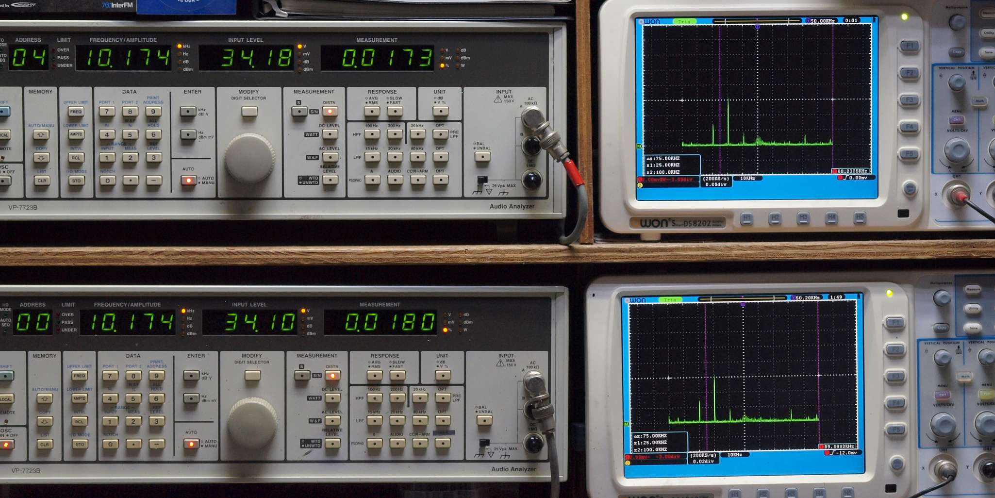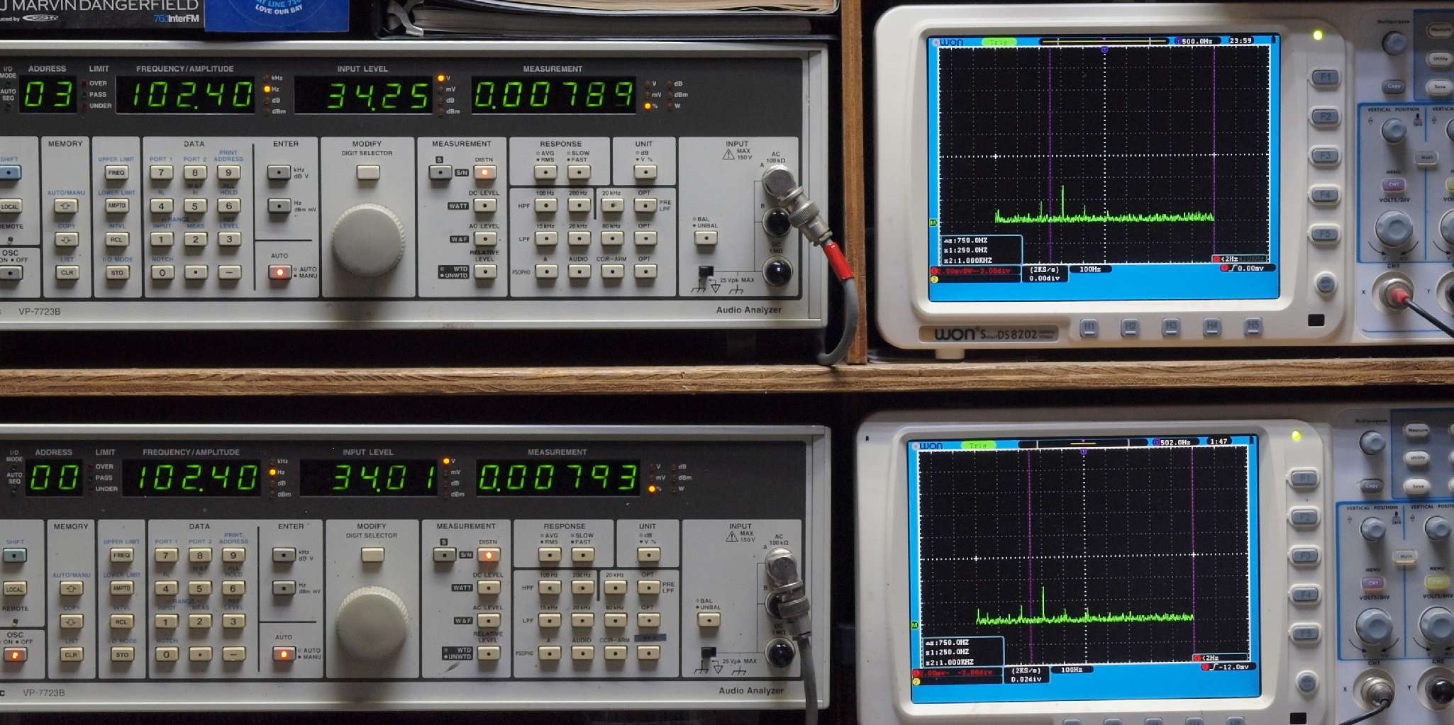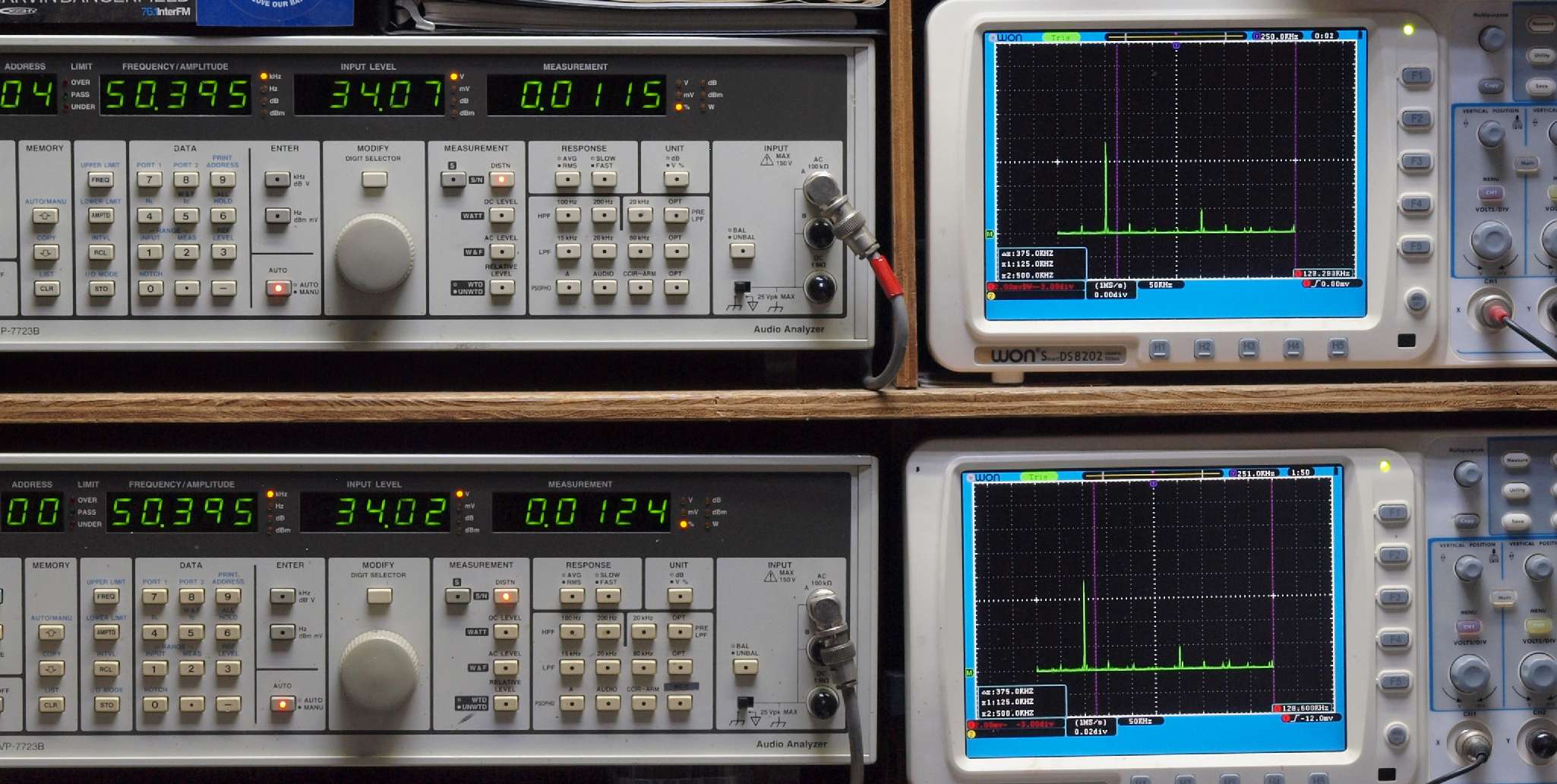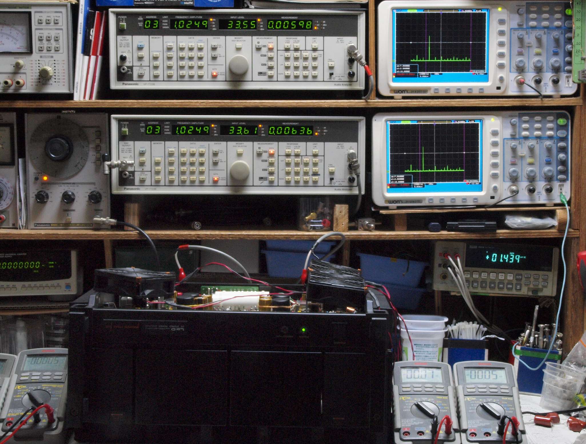 | E. 測定・調整。 画像をクリックすると、大きく(横幅2050ドット)表示されます。 E1. 出力・歪み率測定・調整 「見方」。 上段中 右側SP出力を「Audio Analyzer Panasonic VP−7723B」により測定。 表示LED、 左端=メモリーNo、 中左=周波数測定、 中右=出力電圧測定、 右端=歪み率測定。 上段右端 VP−7723Bの基本波除去出力を「owon SDS8202(200MHZ)」で「FFT分析」表示。 下段中 左側SP出力を「Audio Analyzer Panasonic VP−7723B」により測定。 表示LED、 左端=メモリーNo、 中左=周波数測定、 中右=出力電圧測定、 右端=歪み率測定。 下段右端 VP−7723Bの基本波除去出力を「owon SDS6062(200MHZ)」で「FFT分析」表示。 下段左端 オーディオ発振器 VP−7201A より50Hz〜100kHzの信号を出し(歪み率=約0.003%)、ATT+分配器を通し、AMPに入力。 よって、ダイアル設定出力レベルより低くなります。測定機器の仕様や整備の様子はこちら、「VP−7723B」「VP−7201A」。 FFT画面の見方はこちら。 |