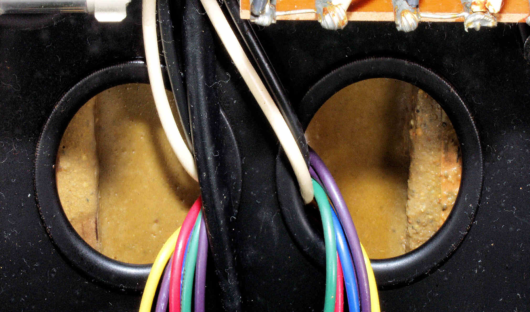 | A2B. 点検中 右側電源トランスの詰め物、変色していない。 よって、高熱による巻き線の短絡や温度フューズの溶断では無く、大電流による温度フューズの溶断と推測される? |