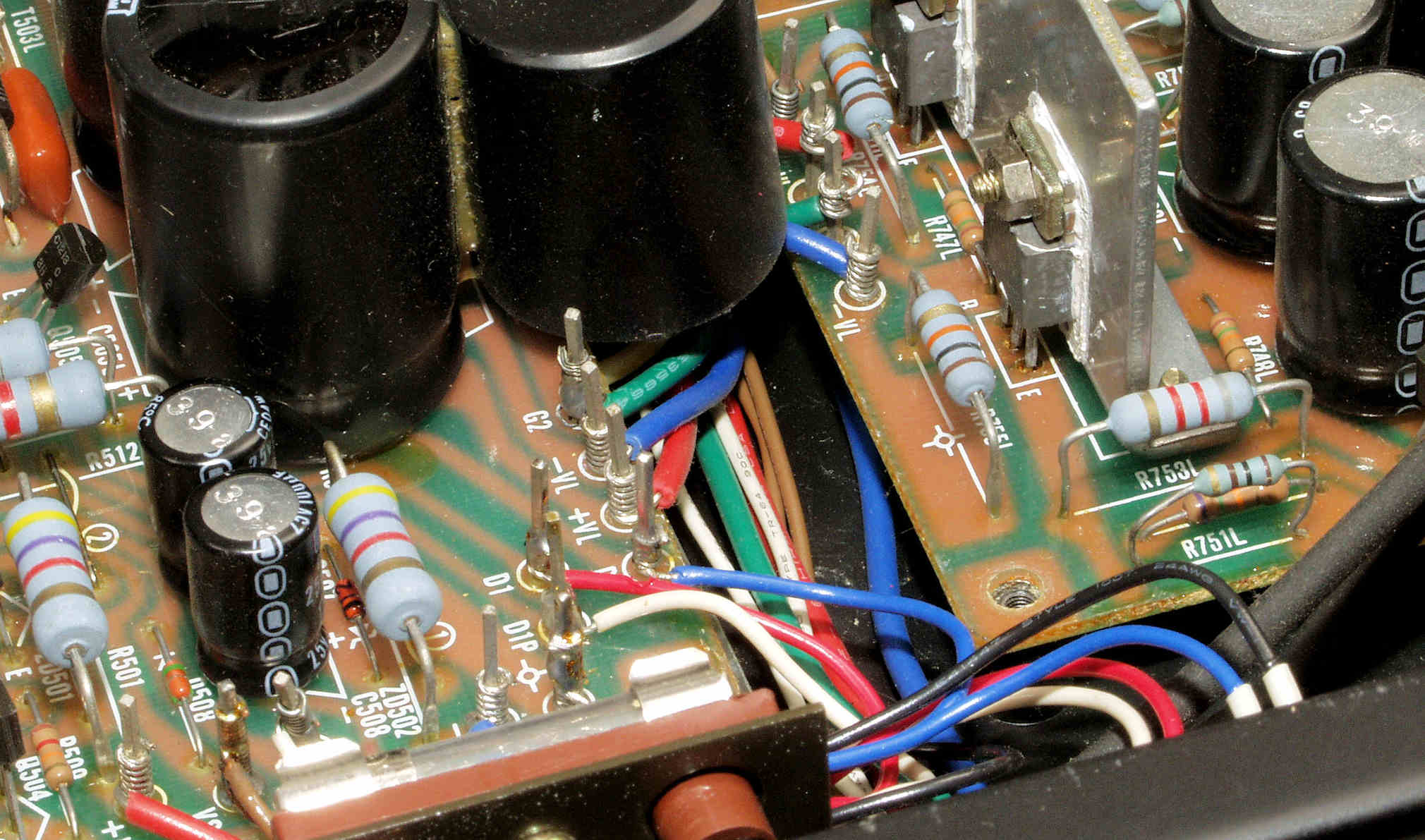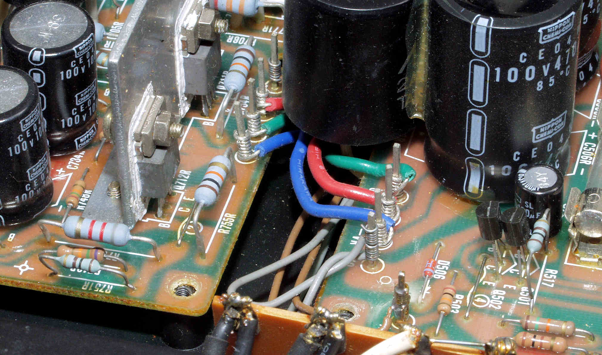 | C63. 修理後 入力RCA端子基板。上の入力カプリングコンデンサー比較。 同じ容量ですが、技術進歩で小型になる。 これにより高域特性が良くなる。逆に大型を使用すると高域が落ち、低域から中域が伸びた様に感じる。 HMA−9500mkUの様に高域までの再生を売り物にしている機器は、大型フイルムコンデンサー使用は不可。 |