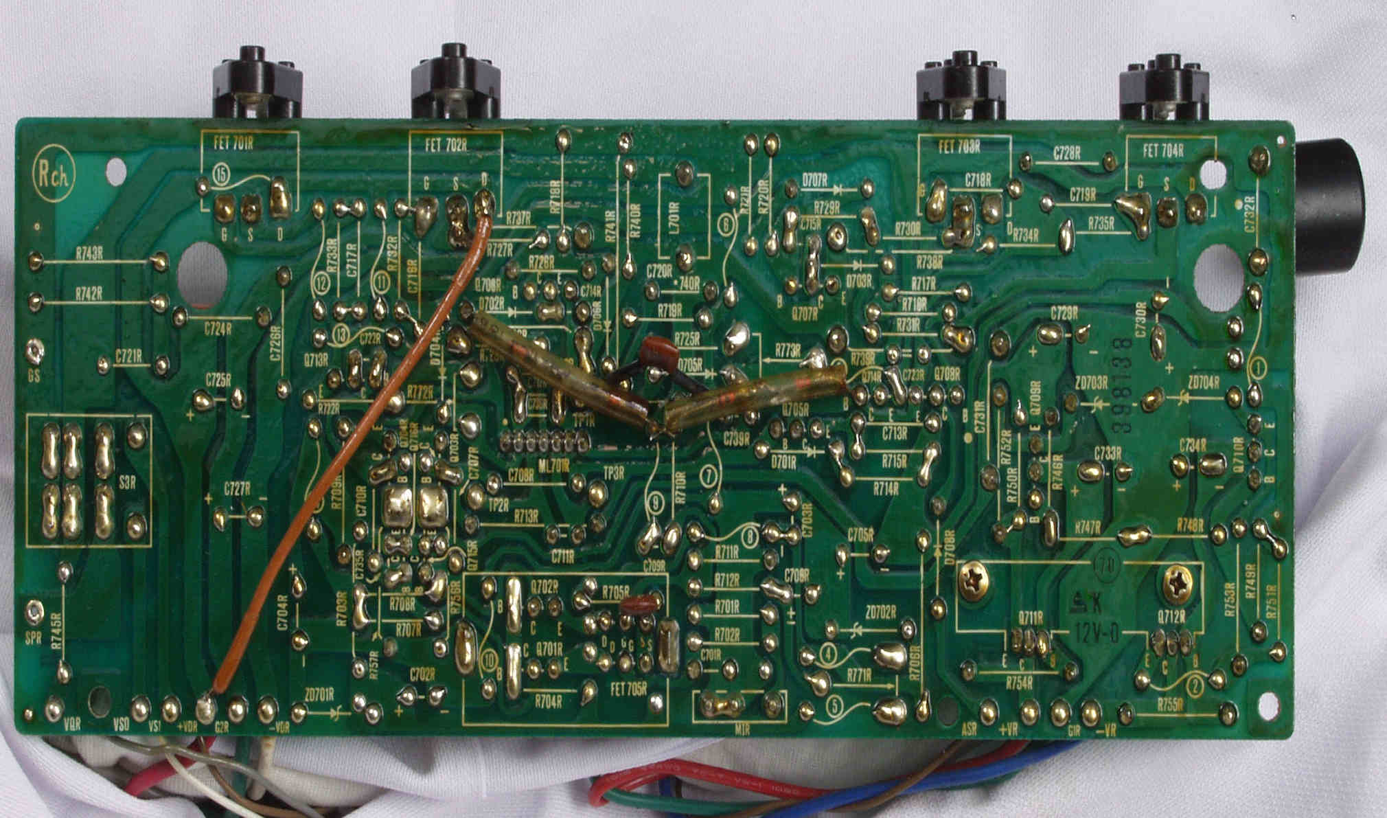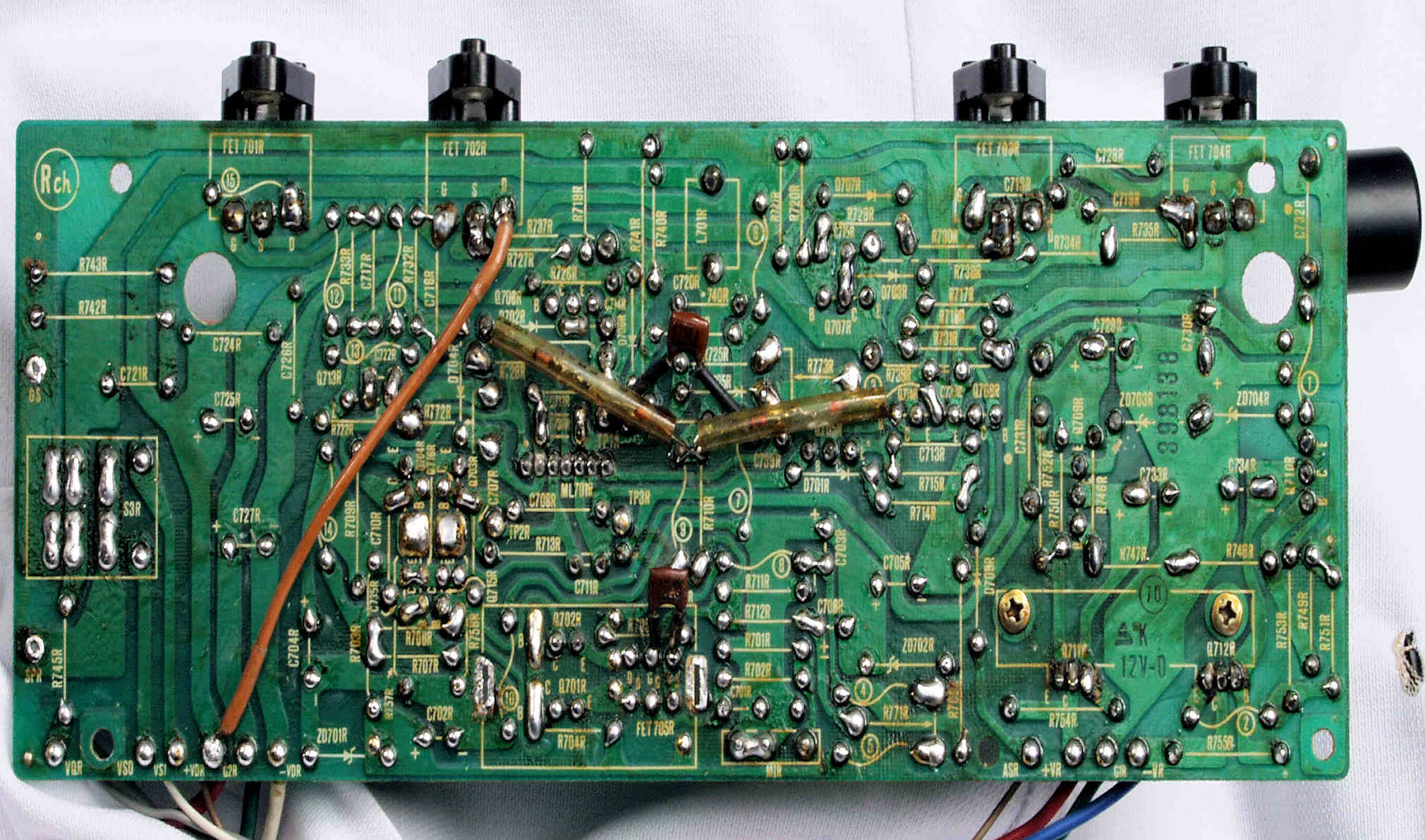 | C14. 修理(半田補正)後 R側ドライブ基板裏 半田を全部やり直す。 普通はこれで完成。 |