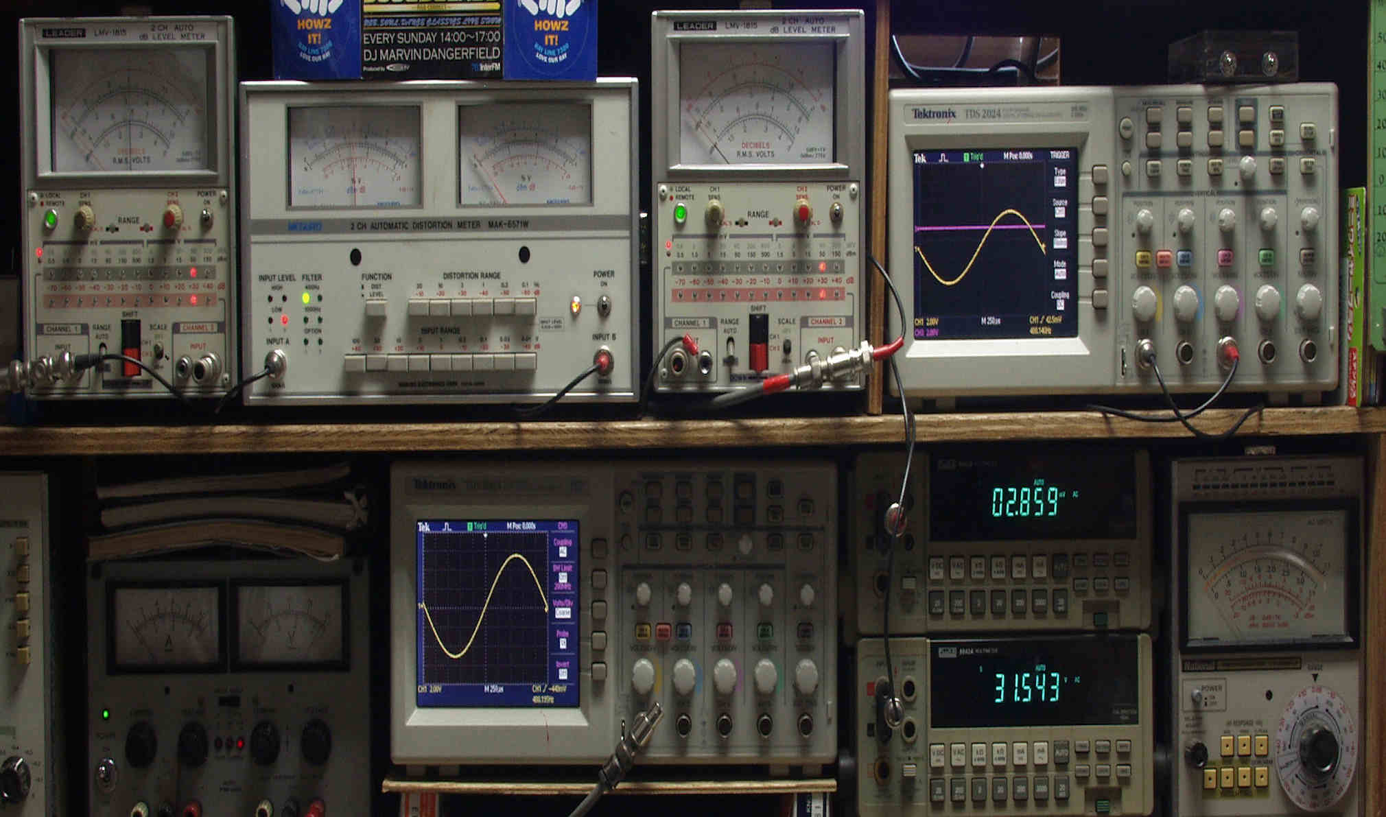| AE. 調整・測定 AE1. 出力・歪み率測定。 「見方」。 下段左端 オーディオ発振器より400HZ・1KHZの信号を出し(歪み率=約0.003%)これをAMPに入力し、出力を測定。 下段中央 オシロ=入力波形(オーディオ発振器のTTLレベル表示)。 上段左端 交流電圧計=L側出力電圧測定、黒針のみ使用。 上段中左 歪み率計=出力の歪み率測定 左メータ=L出力、右メータ=R出力。 上段中右 交流電圧計=R側出力電圧測定、赤針のみ使用。 上段右端 オシロ=出力波形表示、 赤表示=R出力、黄色表示=L出力。(交流電圧が5V以上の場合1/10のATTが入ります)。 下段中右上 デジタル電圧計=R出力電圧測定。 下段中右下 デジタル電圧計=L出力電圧測定。 |