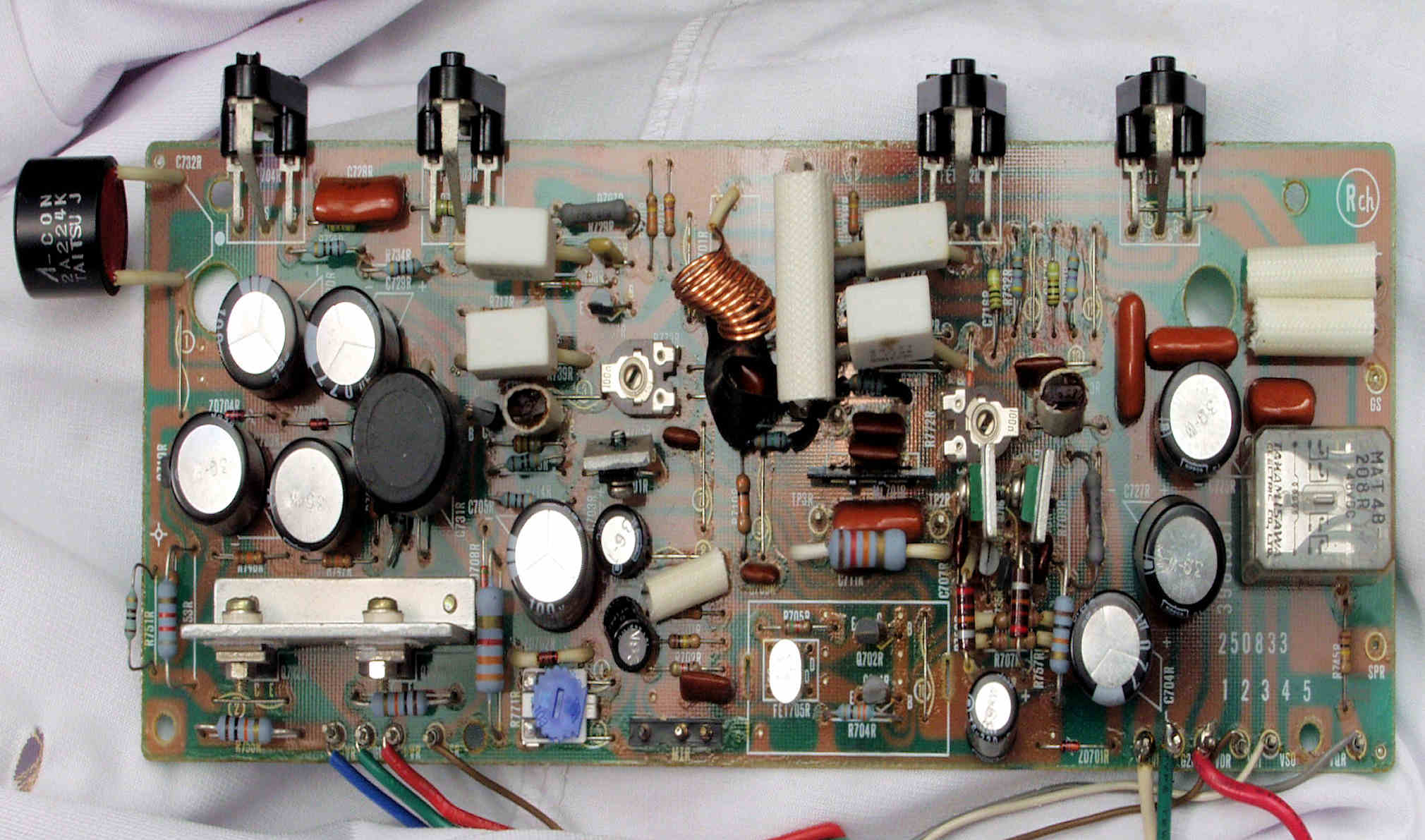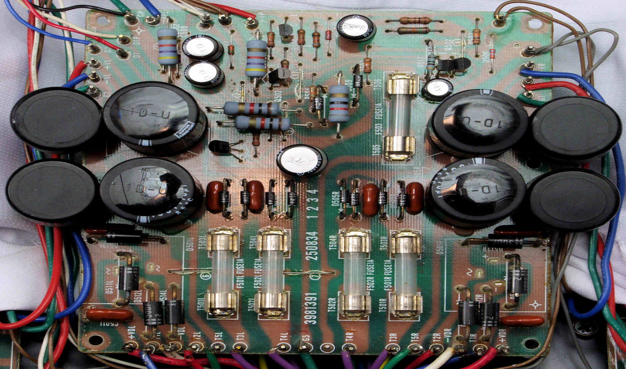 | C52. 修理後 電源基板 フューズ入り抵抗全部、電解コンデンサー9個、整流ダイオード10個、ヒューズ交換、 輪ゴムは接着材が固まるまで使用 |
