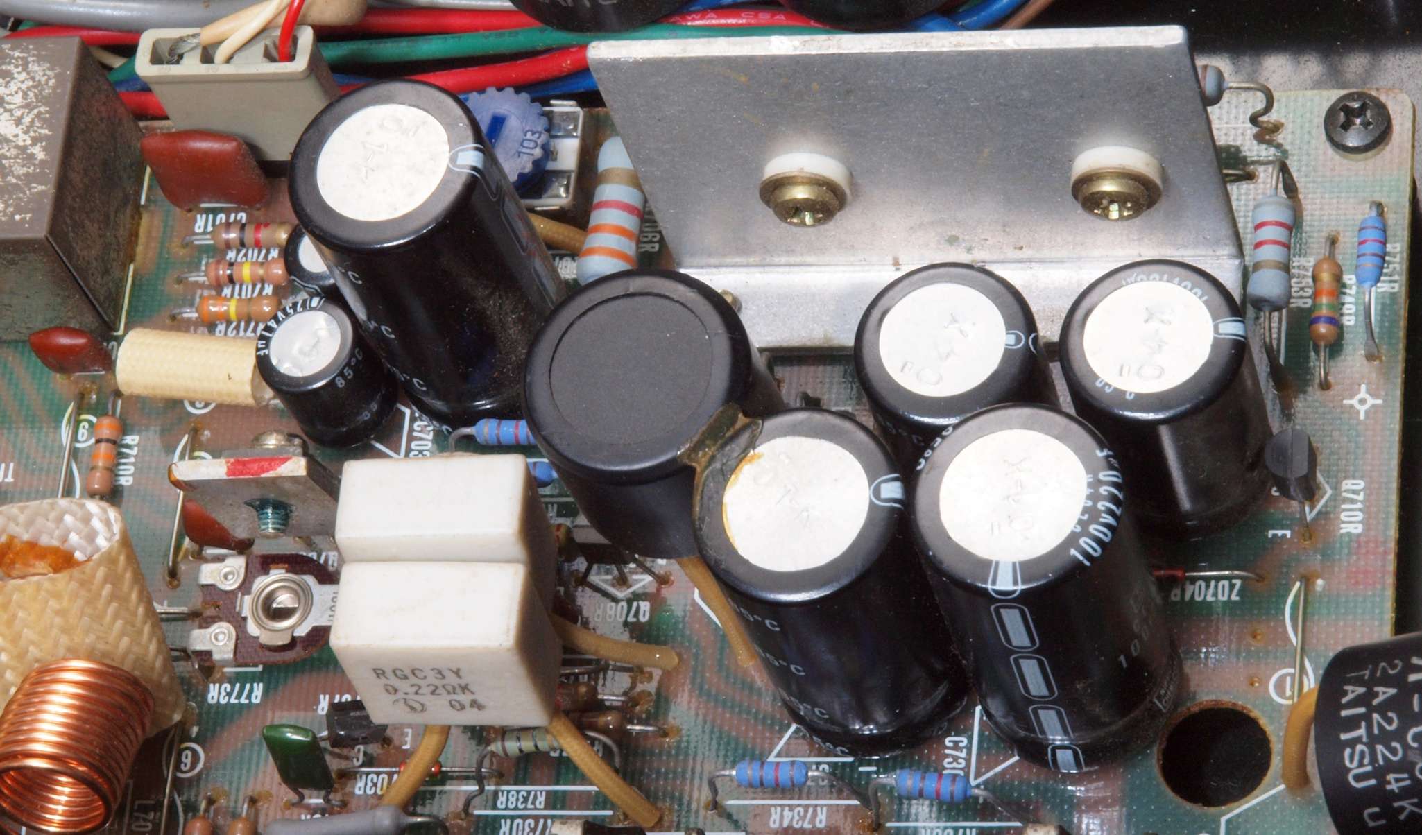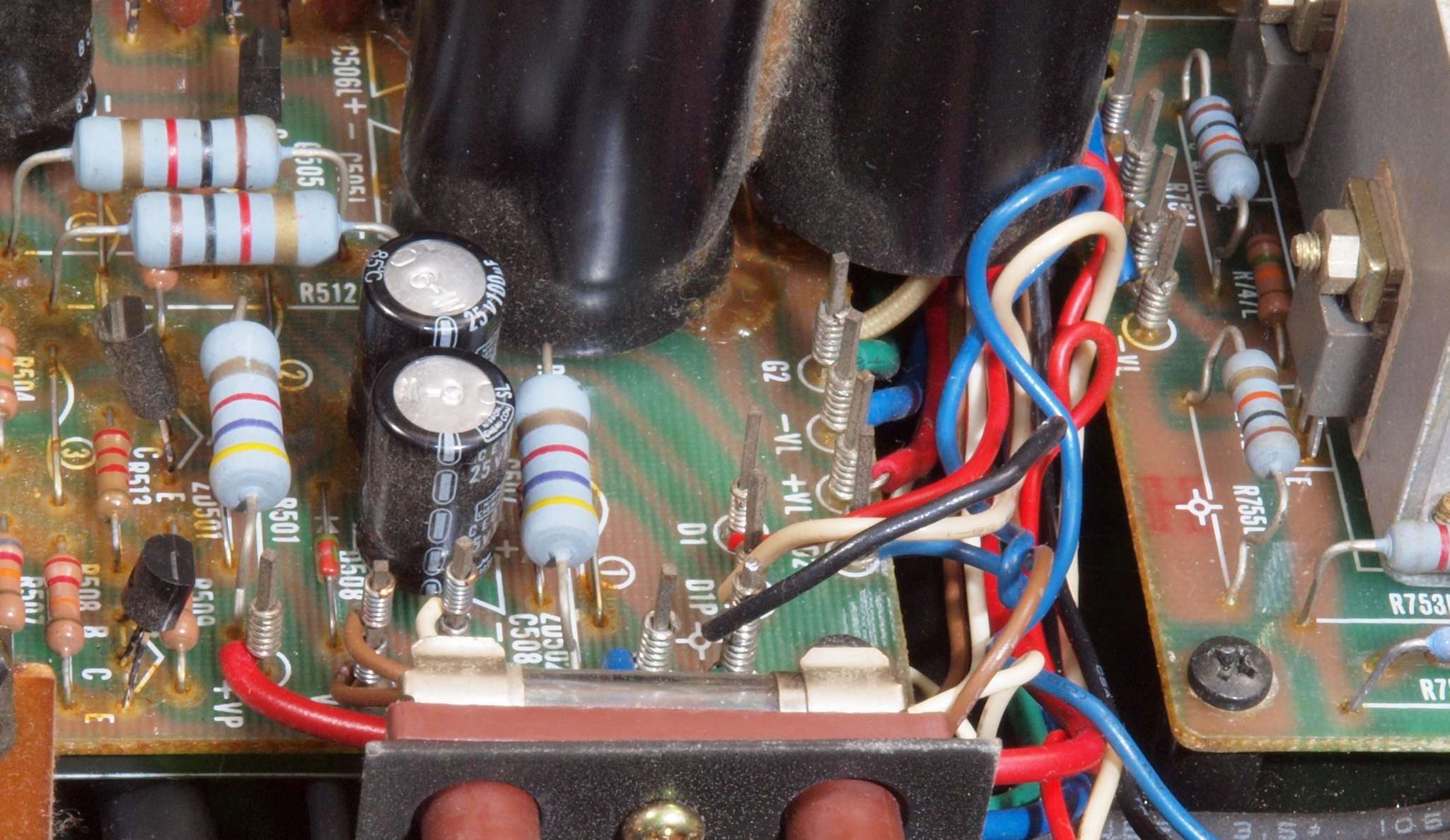 | C51. 修理前 電源基板。 入手難のヒューズ入り抵抗が全て普通の抵抗に交換されている。 |