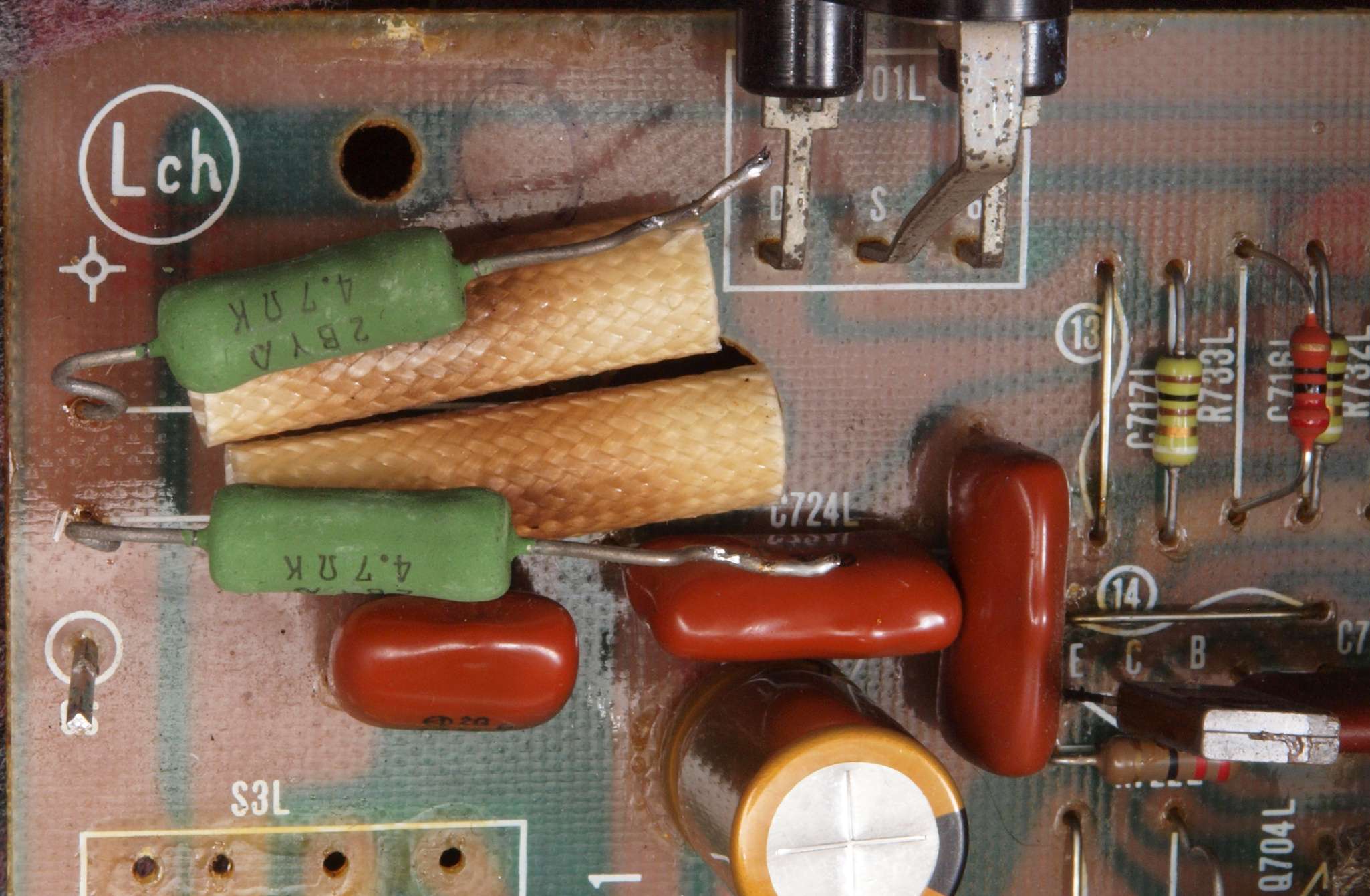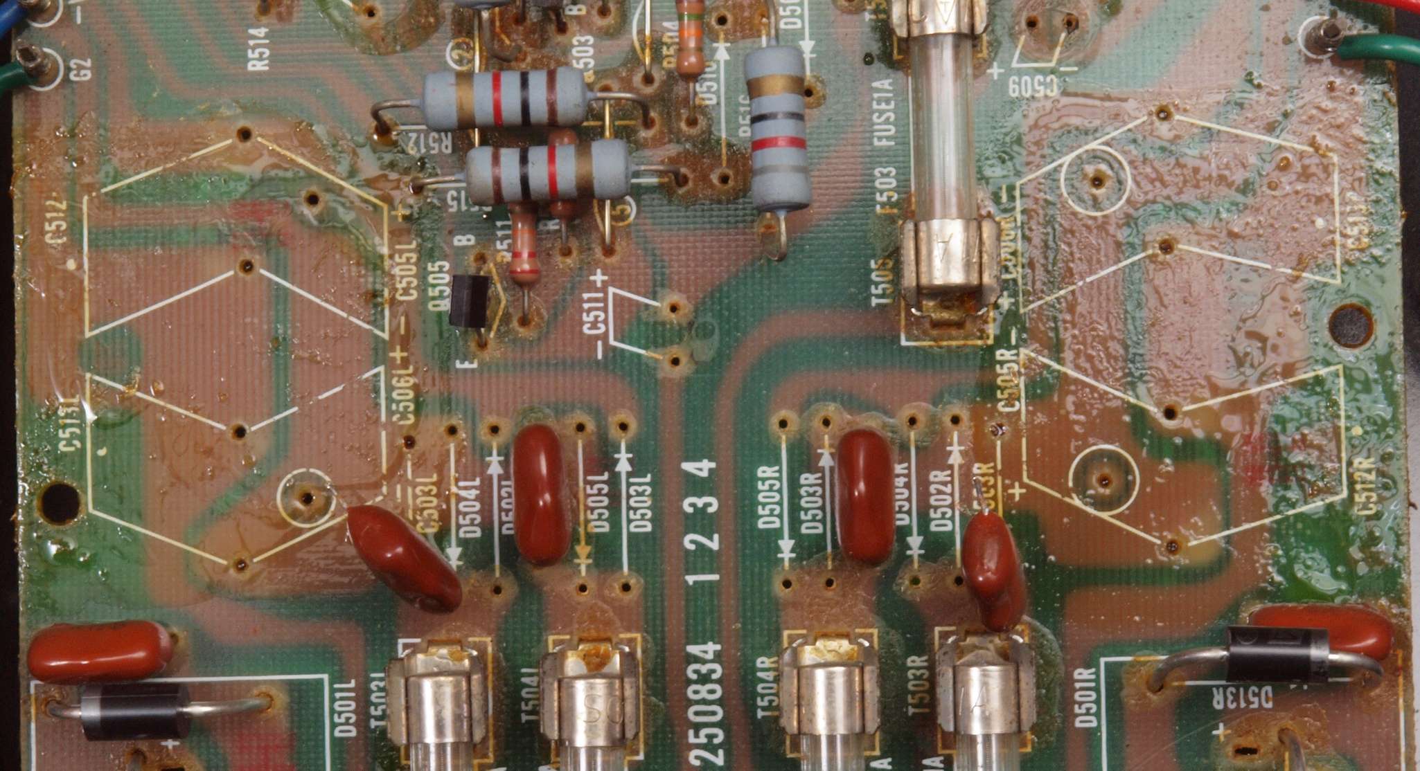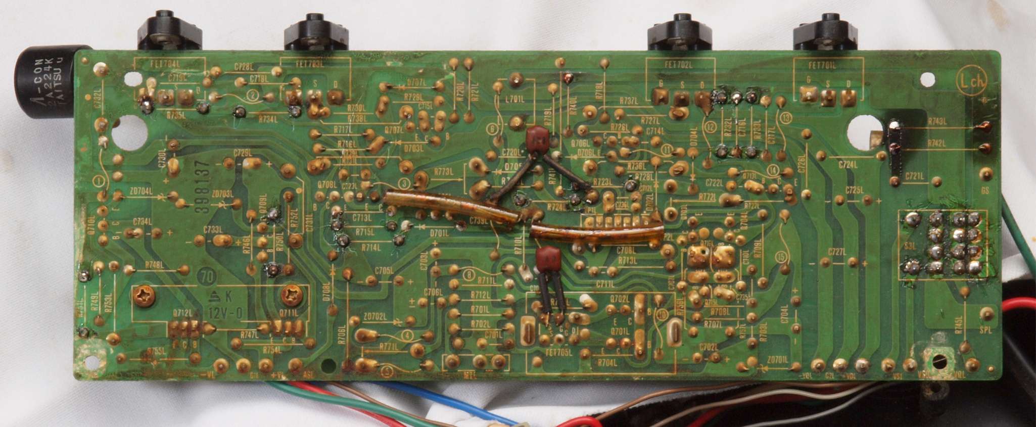 | C21. 修理前 L側ドライブ基板。 入手難のヒューズ入り抵抗が全て普通の抵抗に交換されている。 |