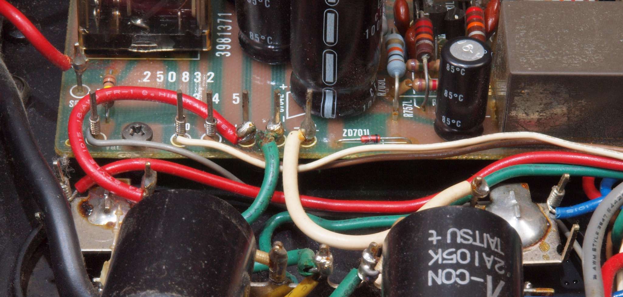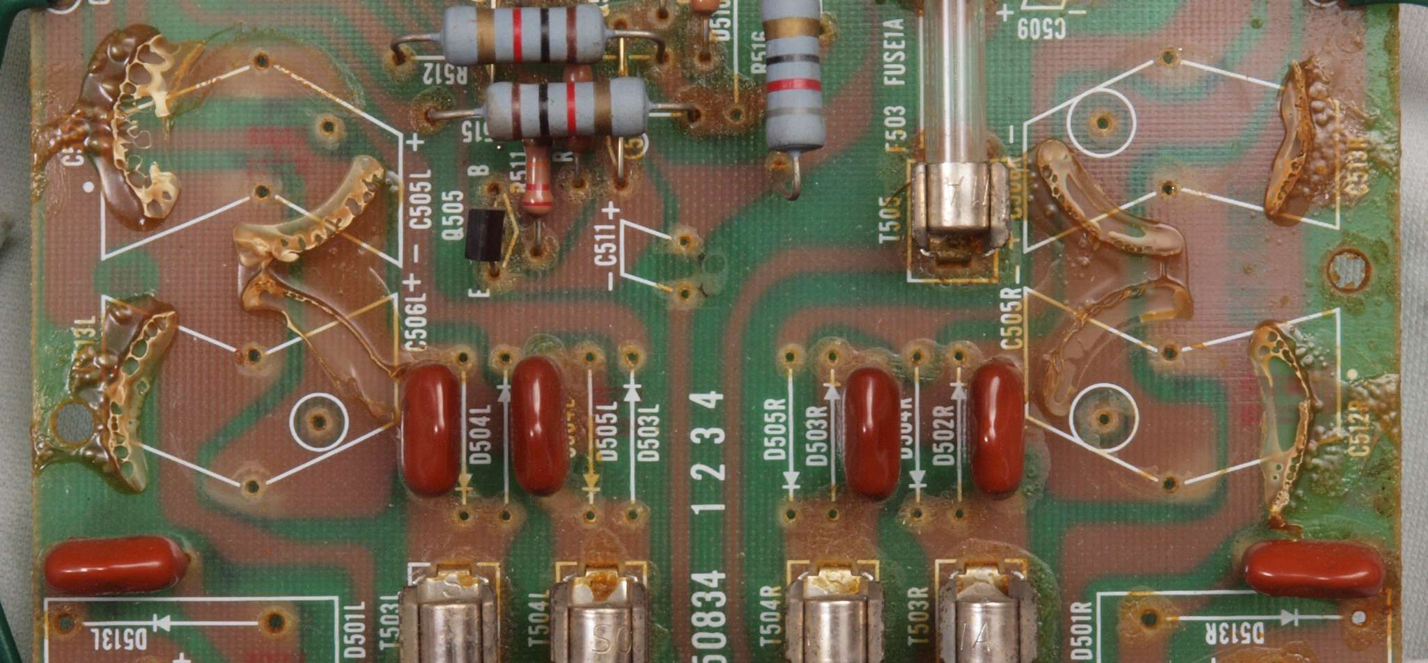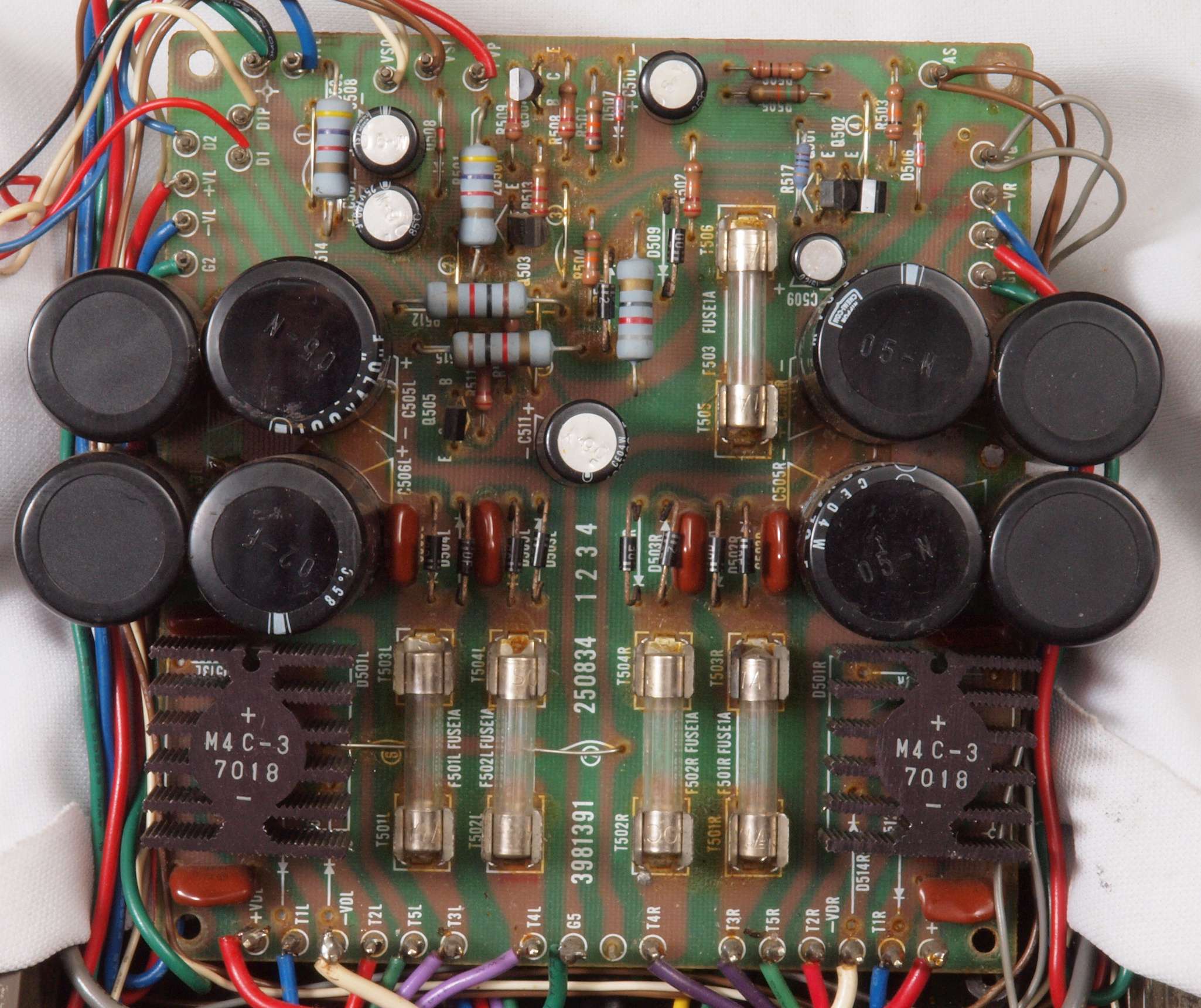 | C21. 修理前 L側ドライブ基板。 入手難のヒューズ入り抵抗が全て普通の抵抗に交換されている。 |