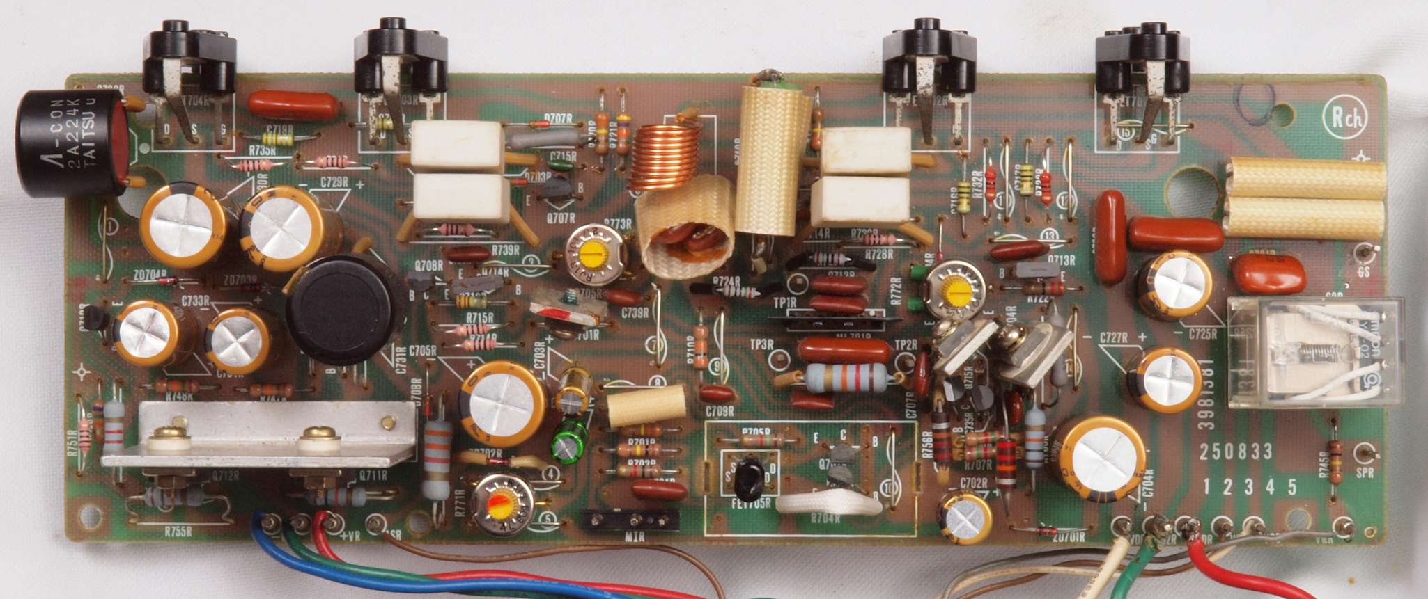 | C12. 修理後 R側ドライブ基板。 初段FET(電界効果トランジスター)、バランス・バイアス調整用半固定VR3個、SP接続リレー交換 ヒューズ入り抵抗全部、電解コンデンサー11個、足黒TR(トランジスター)1個交換。 |