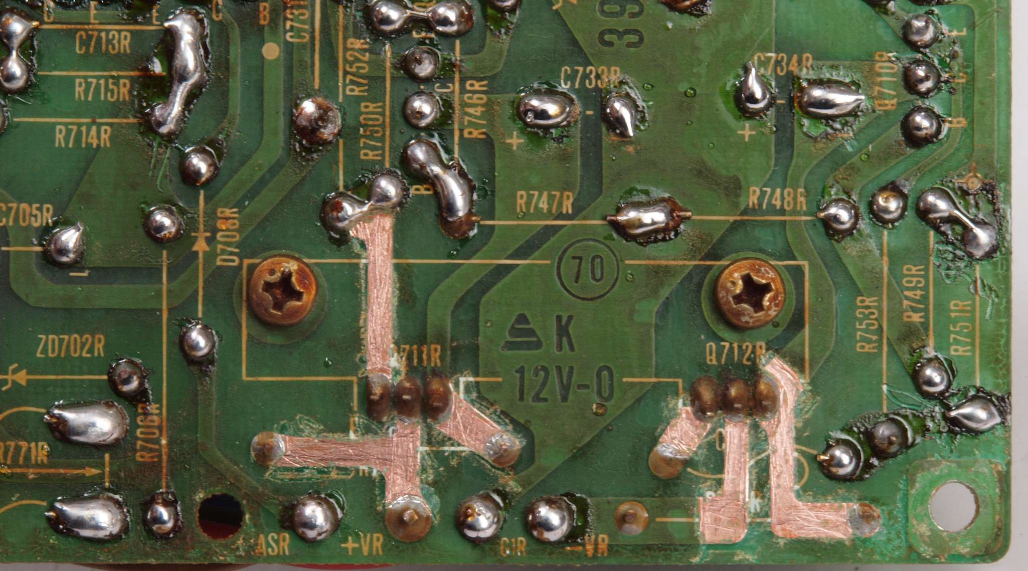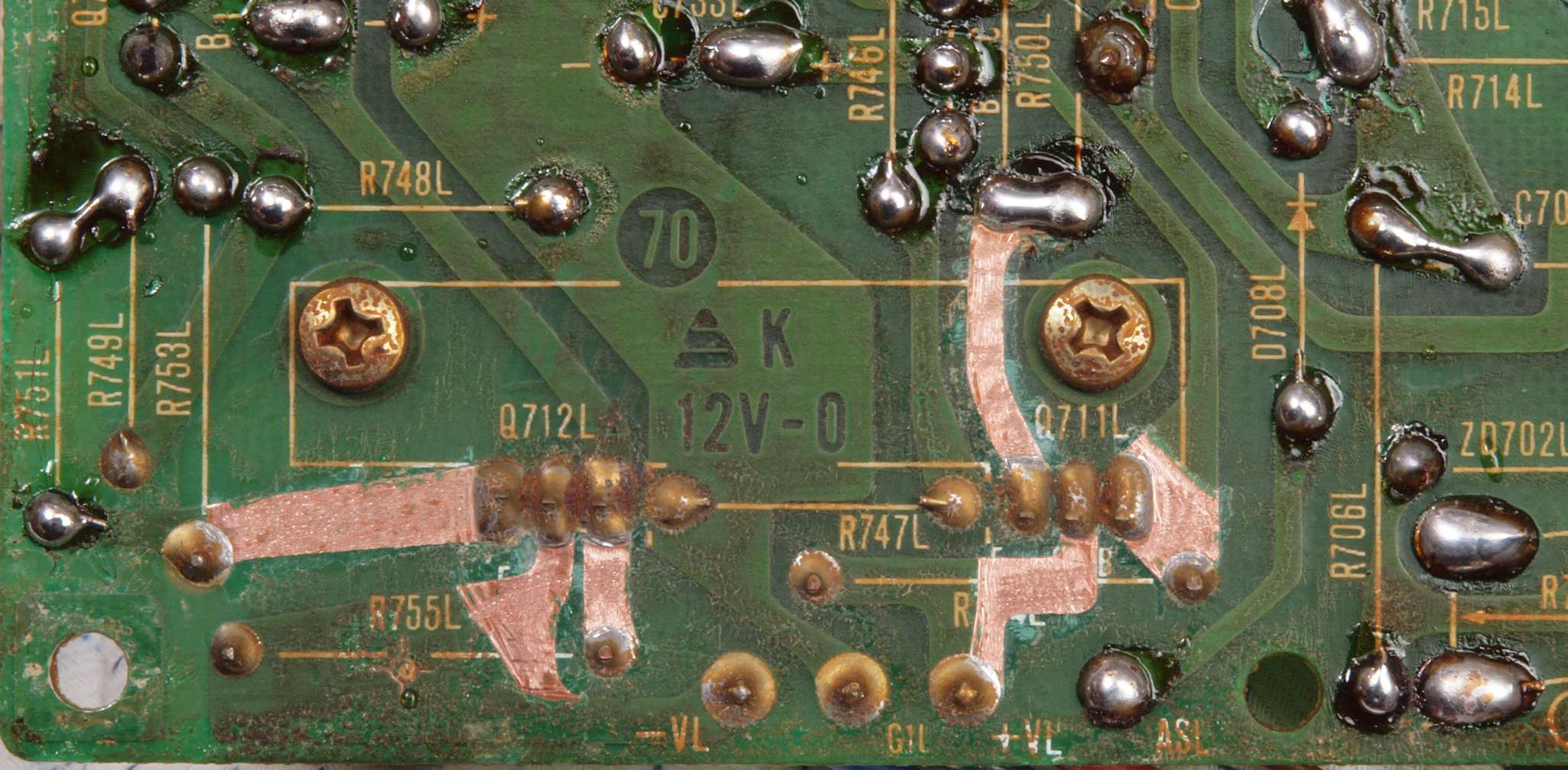 | C14. 修理中 R側ドライブ基板裏 定電圧TR(トランジスター)の足の銅箔を広げる。 |