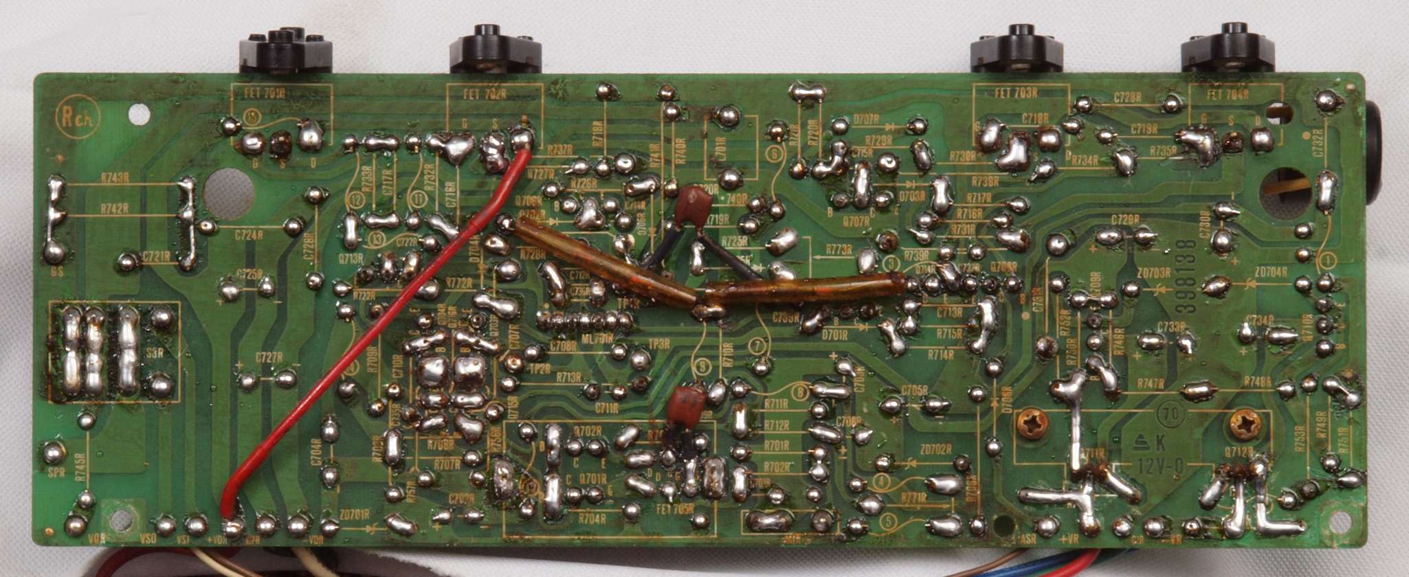 | C6A. 修理(半田補正)後 RCA端子基板裏 半田を全部やり直す フイルムコンデンサー2個増設 |