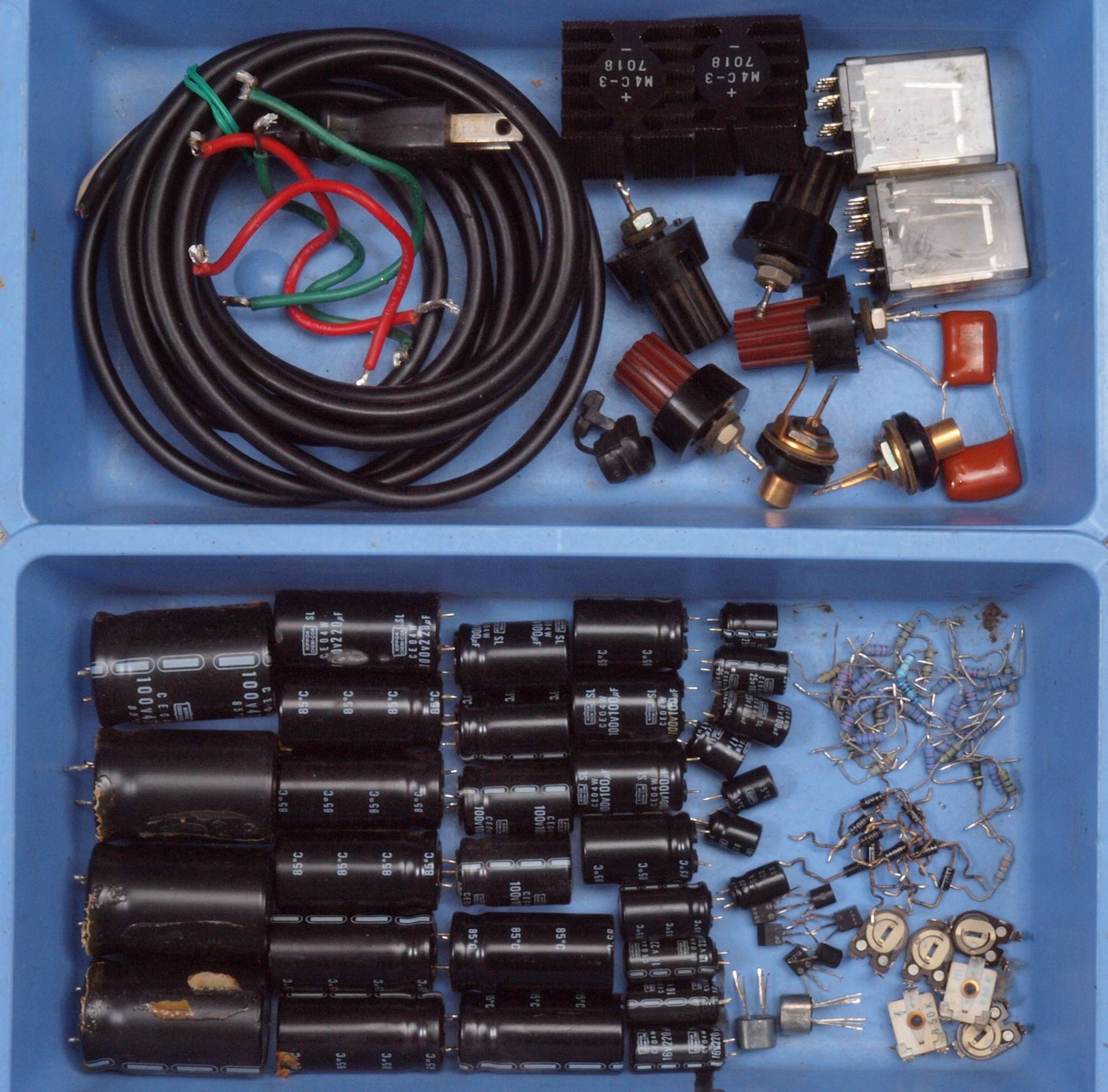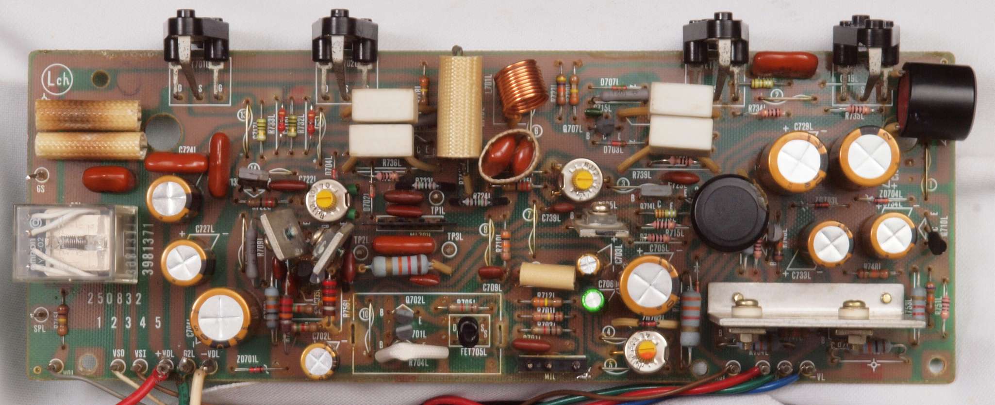 | C22. 修理後 L側ドライブ基板。 初段FET(電界効果トランジスター)、バランス/バイアス調整用半固定VR3個、SP接続リレー交換 ヒューズ入り抵抗全部、電解コンデンサー11個、足黒TR(トランジスター)1個交換。 |
