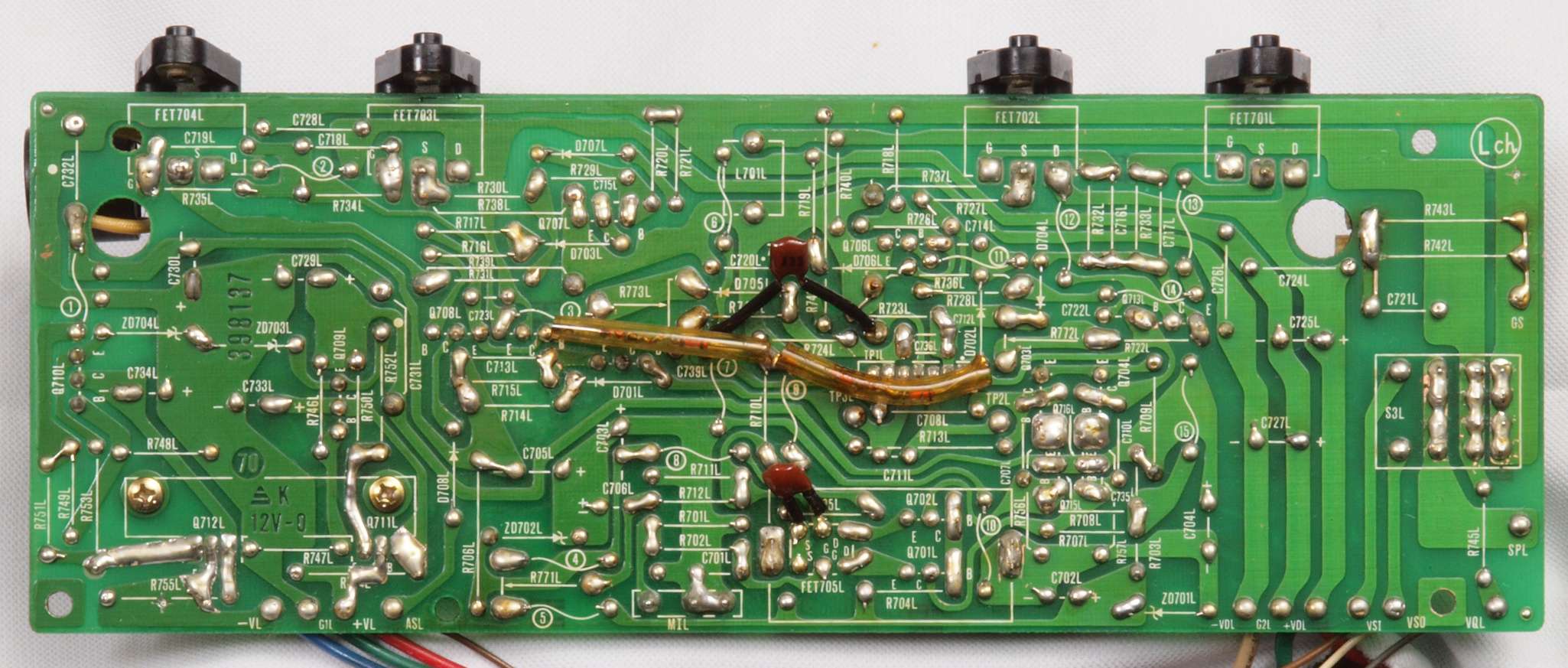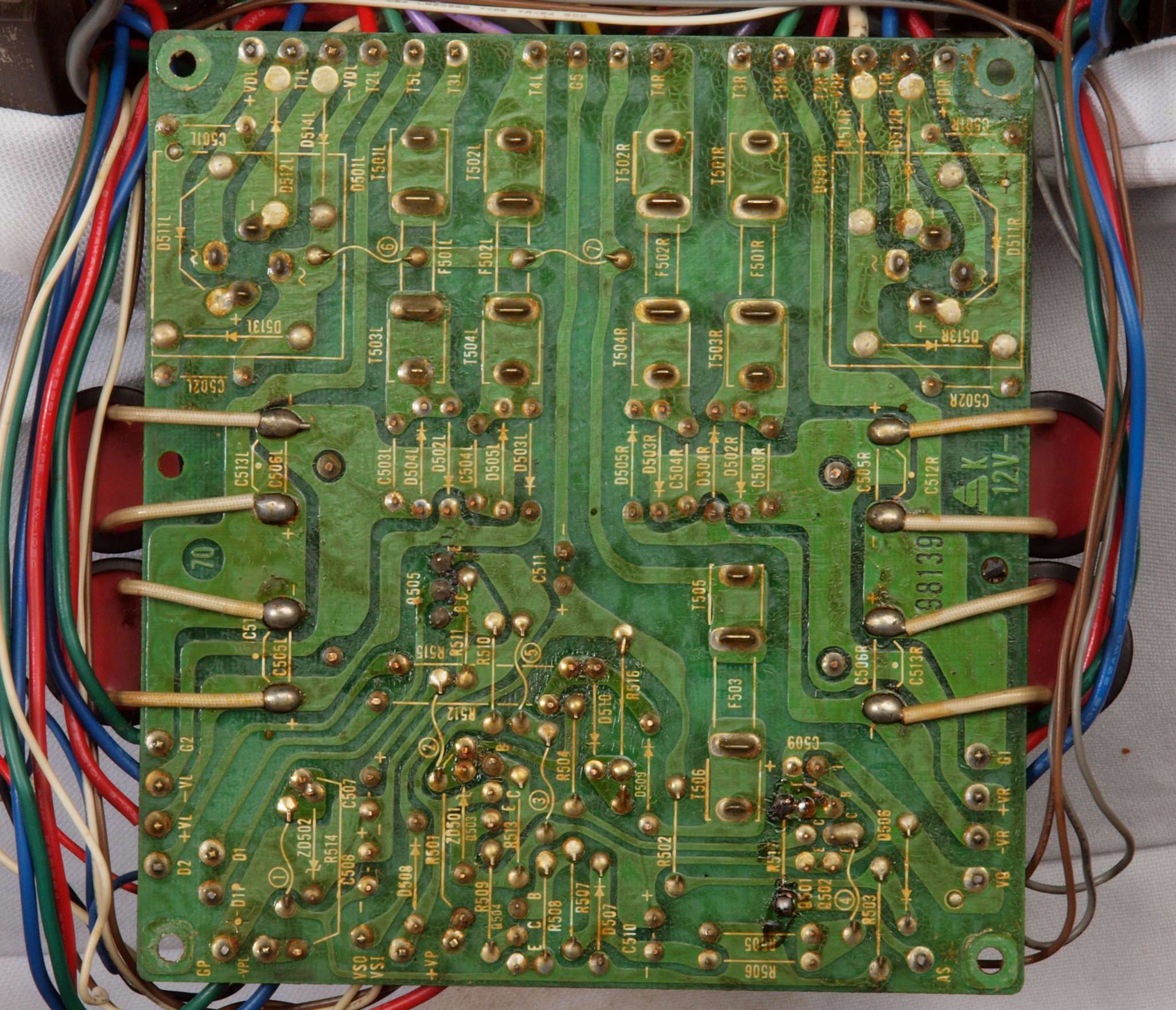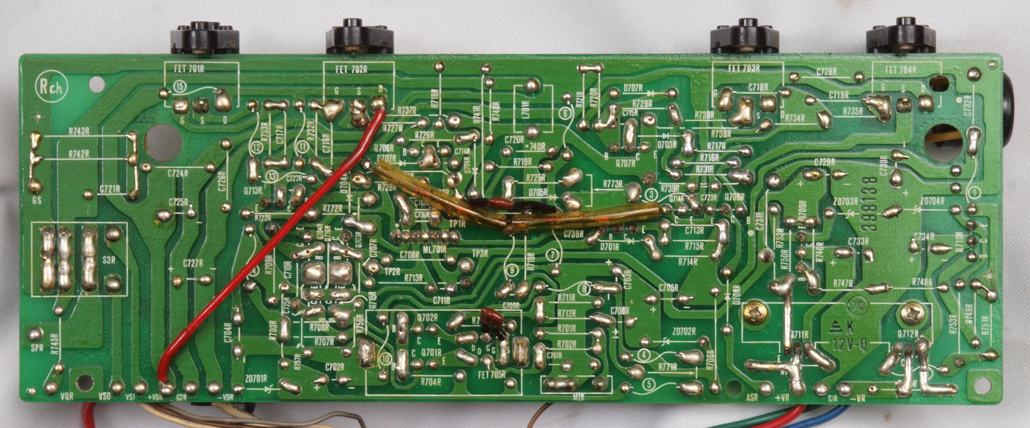 | C. 修理状況。 画像をクリックすると、大きく(横幅2050ドット)表示されます。 C11. 修理前 R側ドライブ基板。 入手難のヒューズ入り抵抗が全て普通の抵抗に交換されている。 |