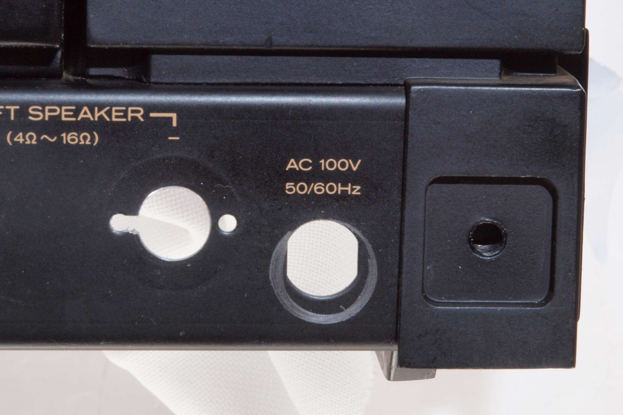 | C92. 修理中 電源ケーブル取り付け部穴加工前。 SP接続端子との距離を取る為に、下右方向へ広げる為、昔ながらのヤスリで削る。 |