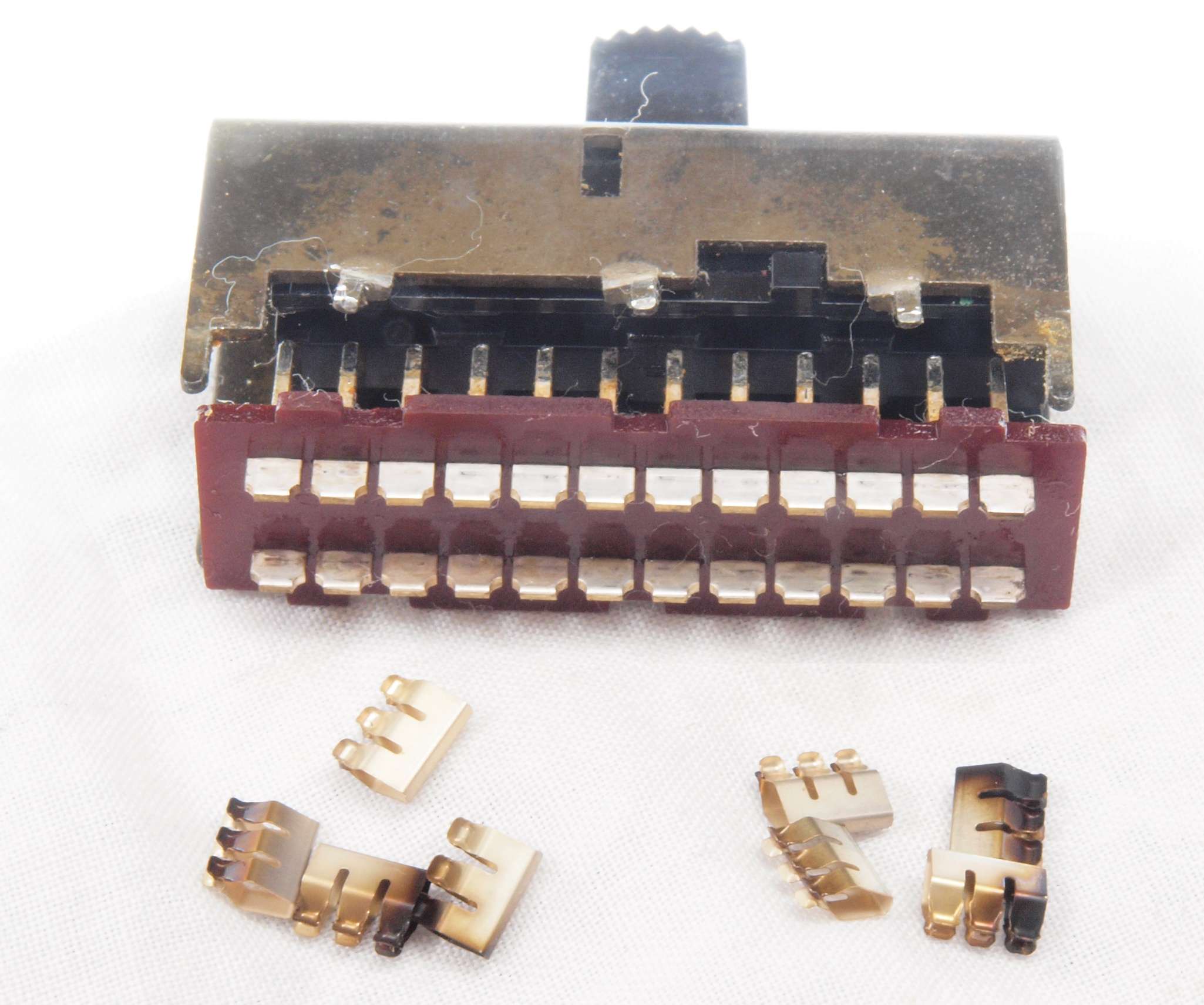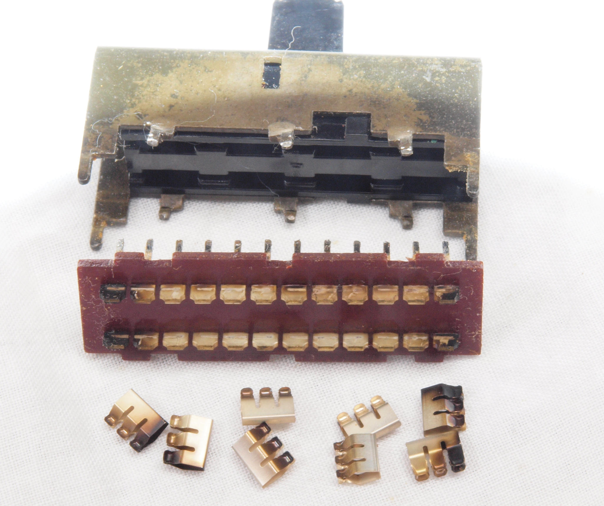 | C6E. 修理中 RCA端子基板の切り換えSW分解。端子を洗浄する。 使用するのは端の1回路のみ、内側の綺麗な接触子と交換して組む。 |