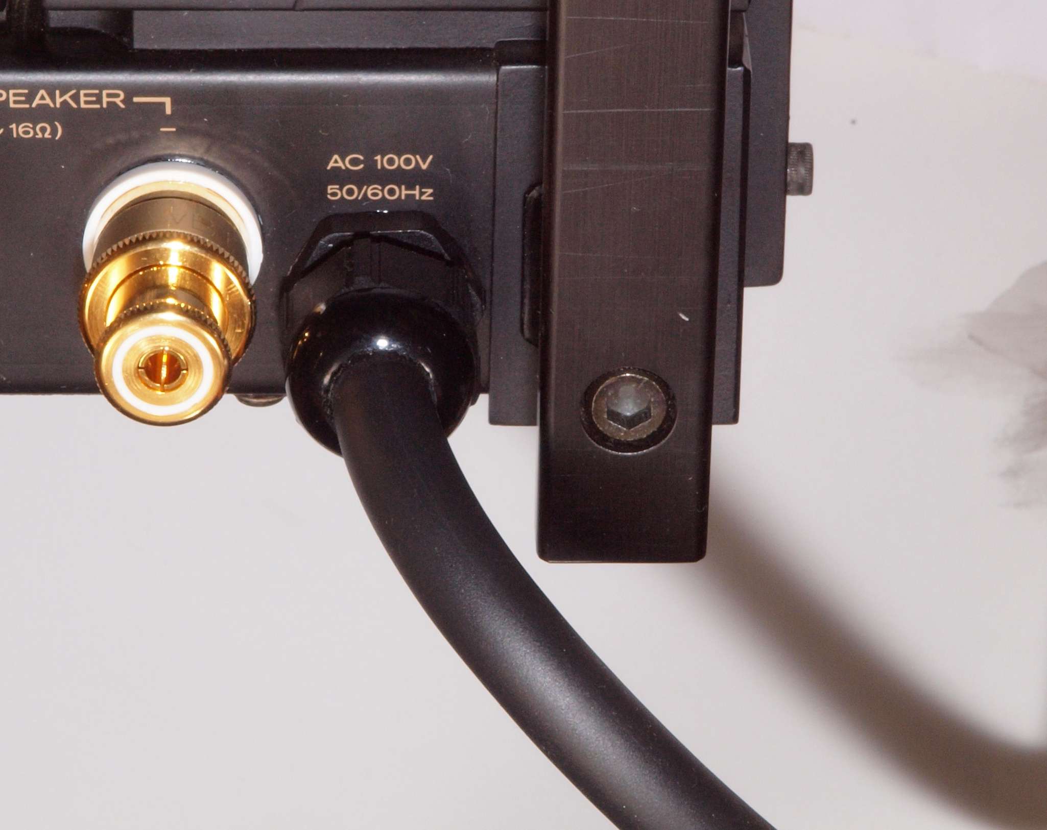 | C99. 修理中 3Pプラグにケーブル取り付。 差し込み固定が一般ですが、時計方向に巻き付けると良い。 上のK線=巻き付いた端側、 下の白線=挿入した側。止めビスは未締結です。 これで差し込み固定の3倍位接触面積が増し、接触抵抗が低くなる。 |