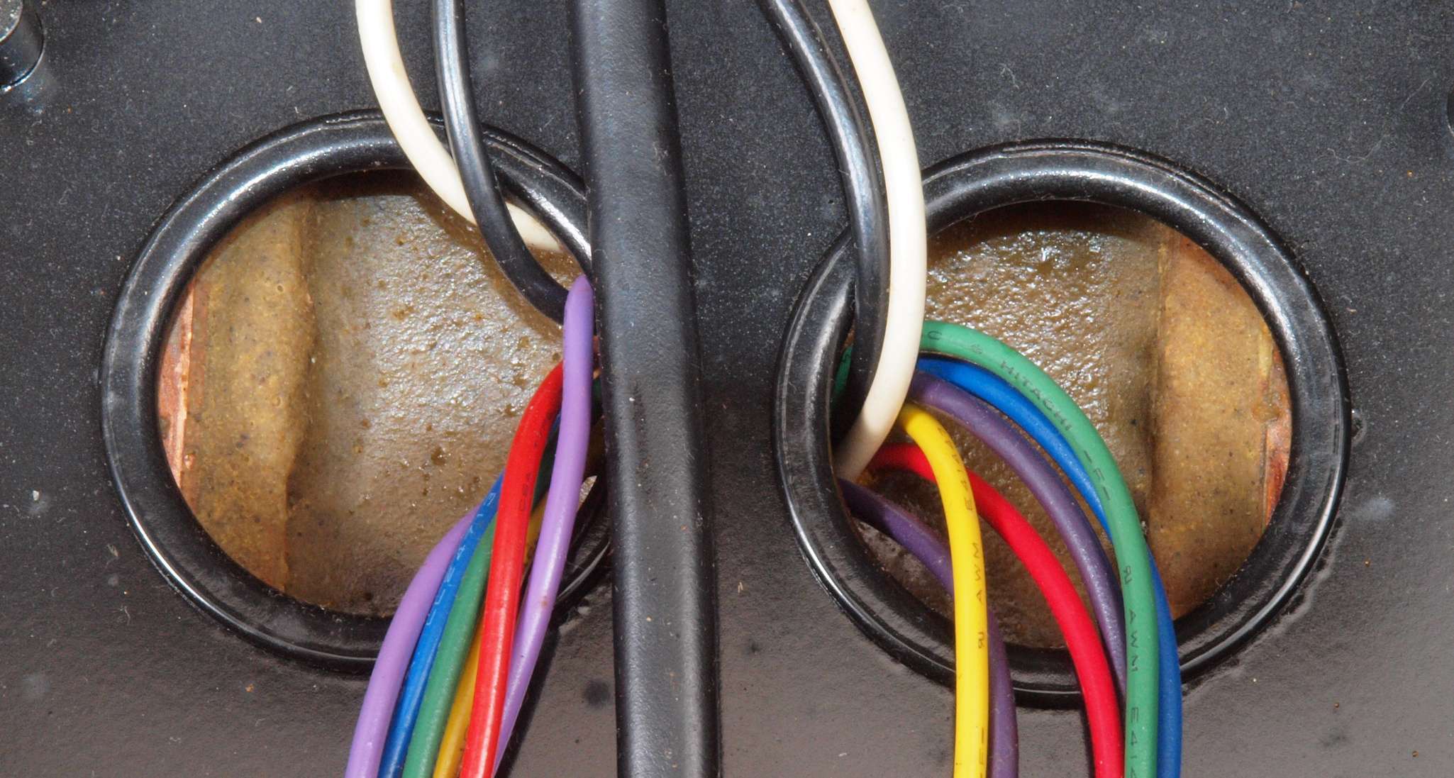 | C9A. 修理中 3Pプラグにケーブル取り付。差し込み固定が一般ですが、時計方向に巻き付けると良い、反対側。 上の白線=巻き付いた端側、 下のK線=挿入した側。止めビスは未締結です。 これで差し込み固定の3倍位接触面積が増し、接触抵抗が低くなる。 |