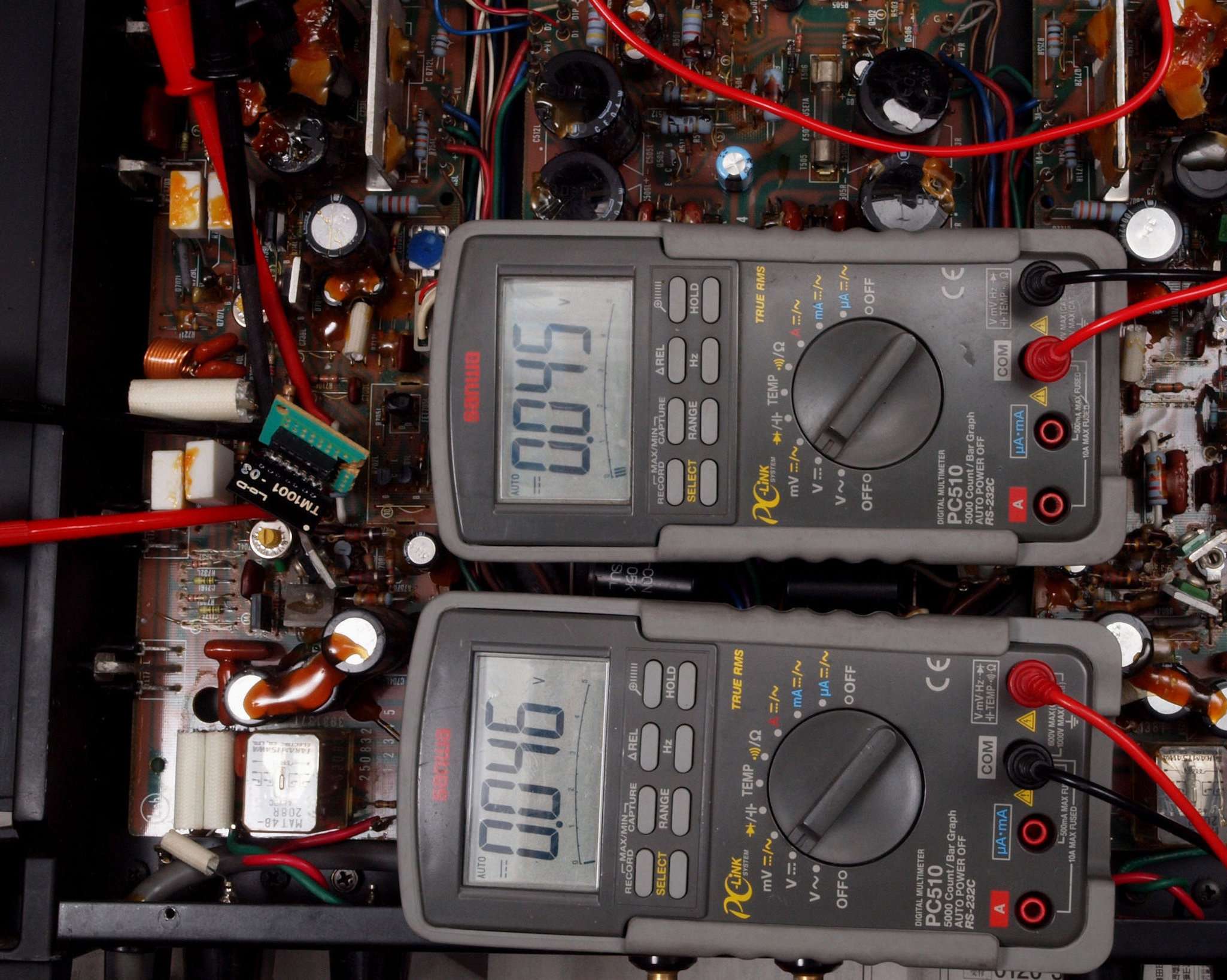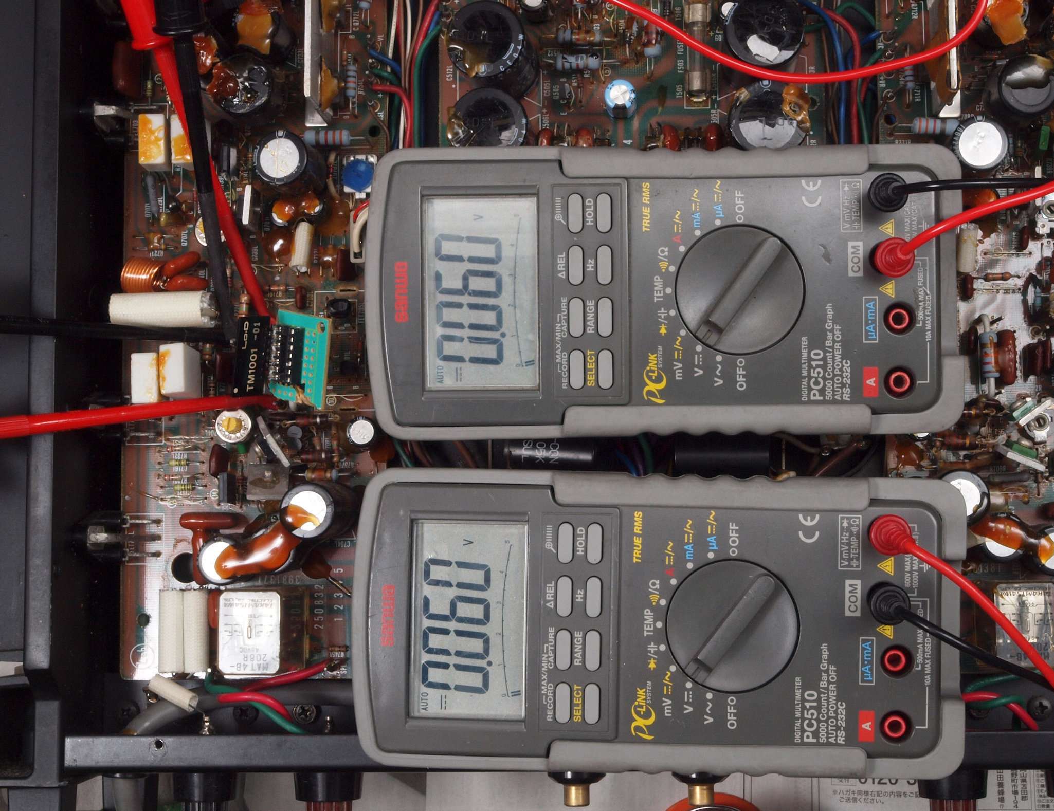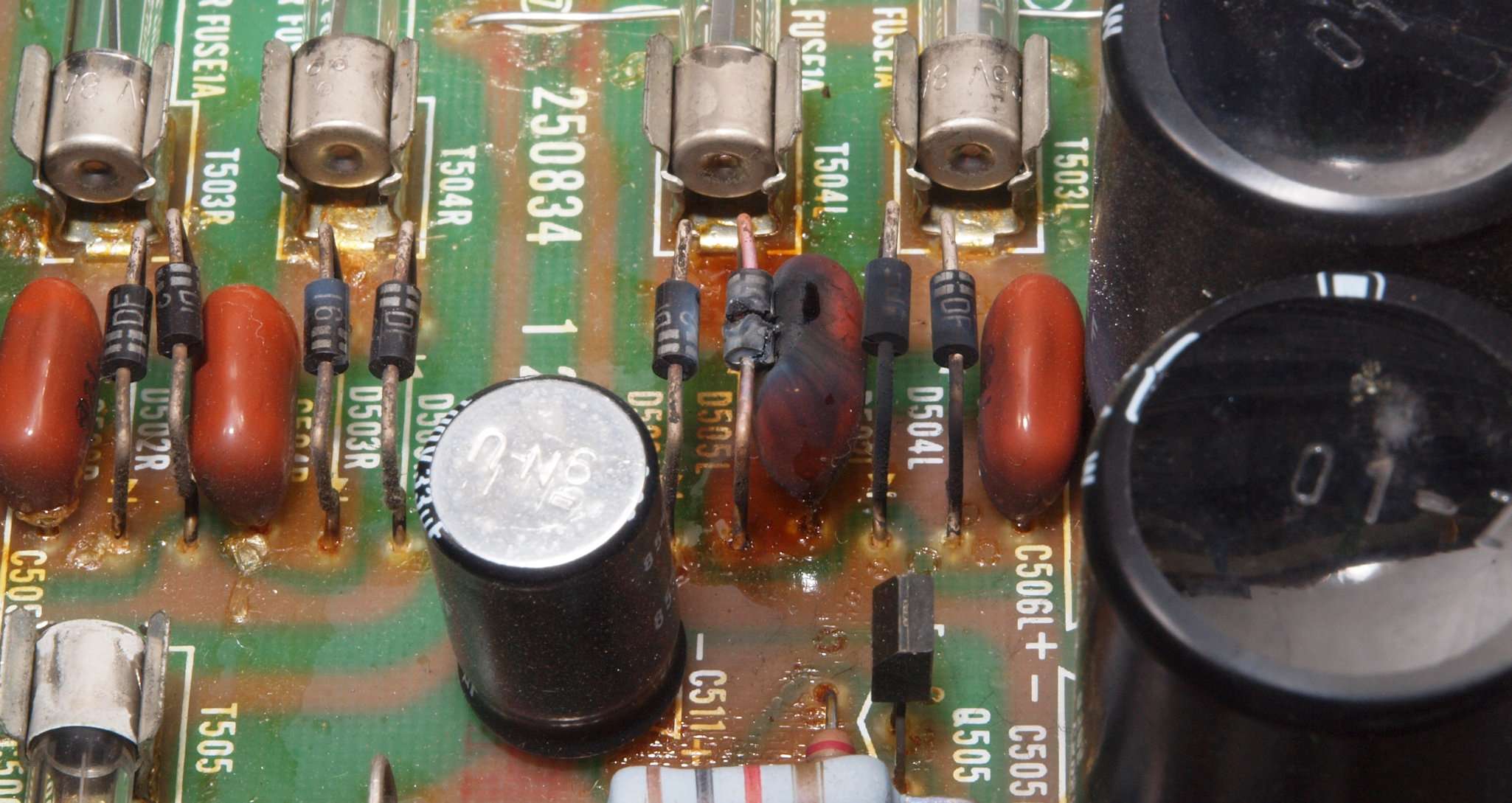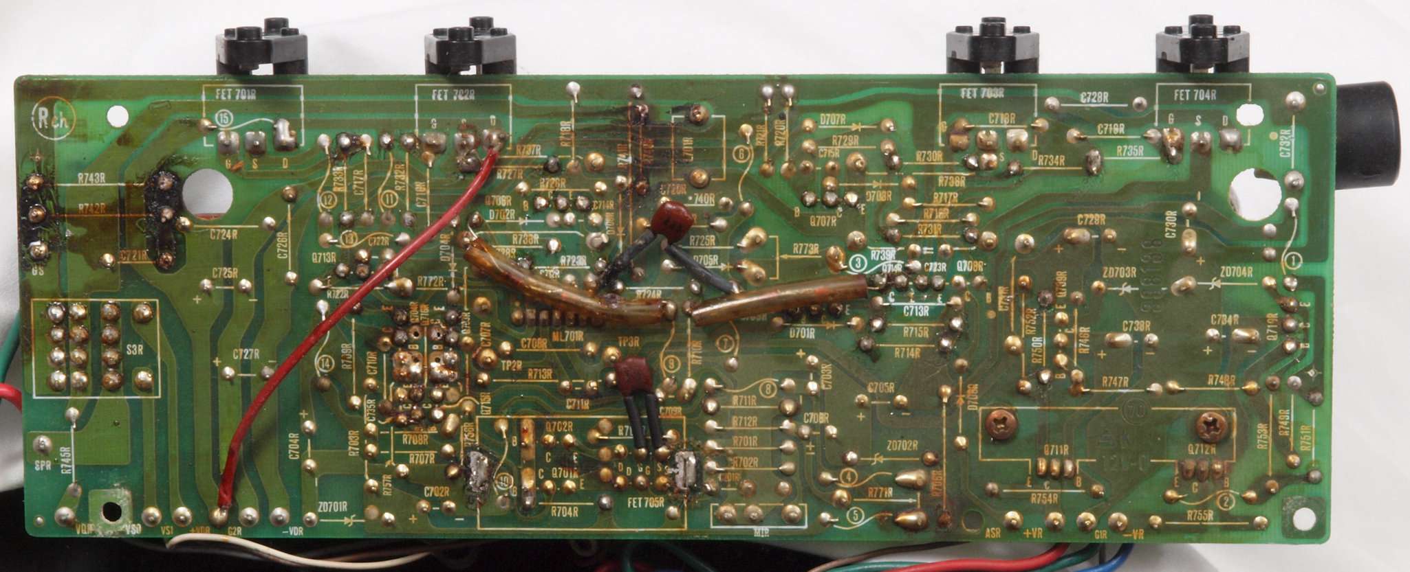 | C. 修理状況。 画像をクリックすると、大きく(横幅2050ドット)表示されます。 C11. 修理前 R側ドライブ基板。 |