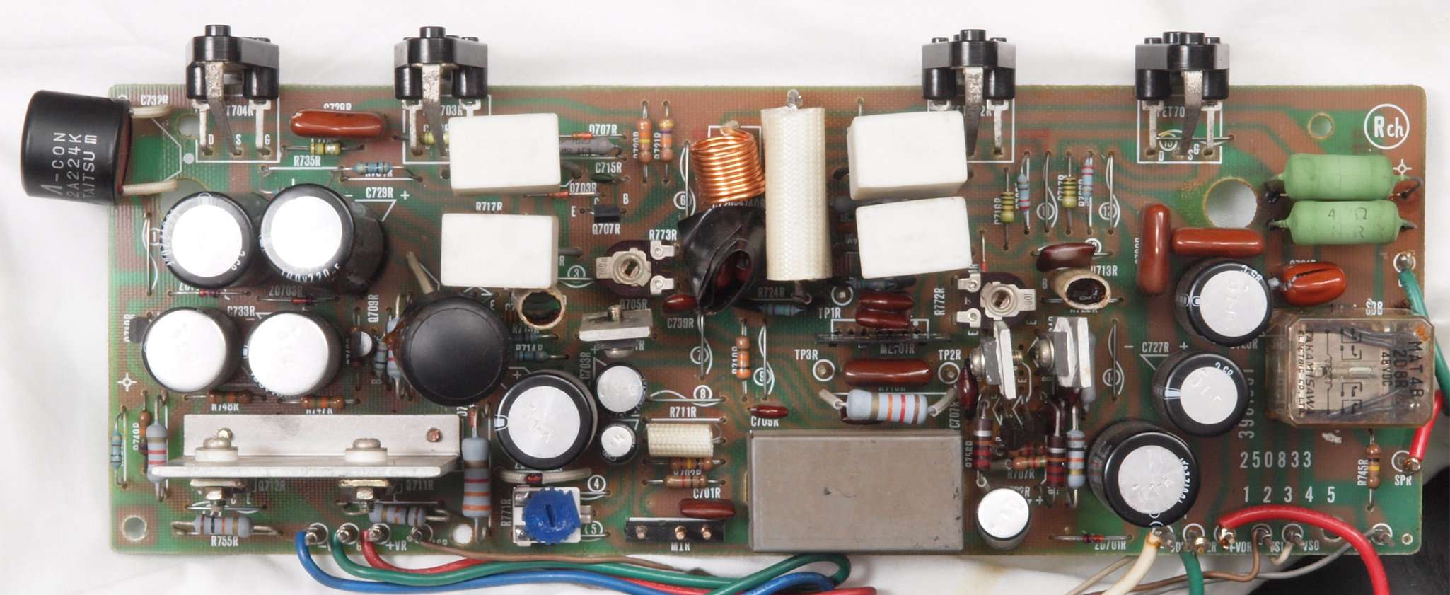 | C12. 修理後 R側ドライブ基板。 初段FET(電界効果トランジスター)、バランス・バイアス調整用半固定VR3個、SP接続リレー交換 ヒューズ入り抵抗全部、電解コンデンサー11個、足黒TR(トランジスター)6個交換。 |