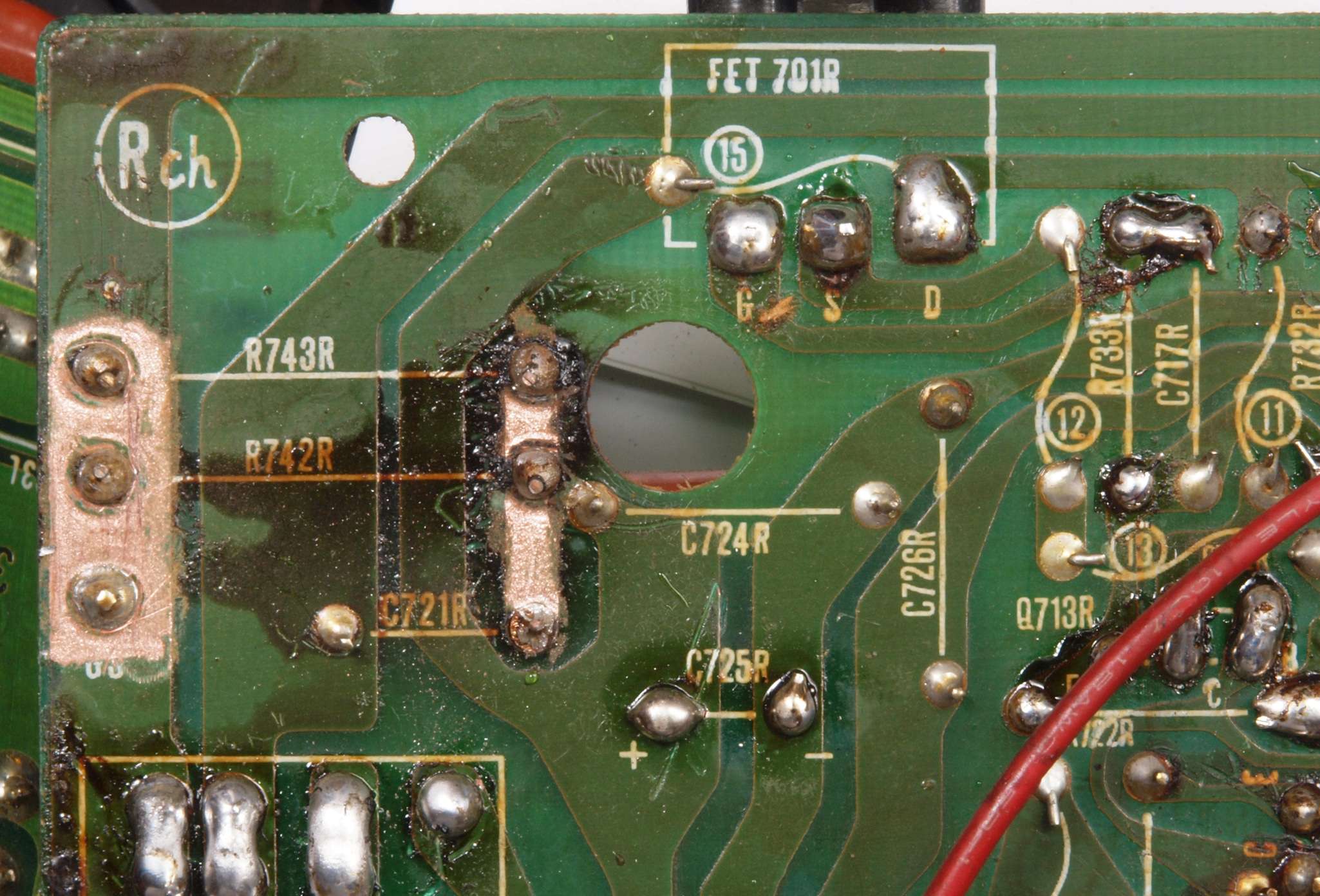 | C15. 修理中 R側ドライブ基板裏 SP出力フイルター回路の足の銅箔を広げる。 |