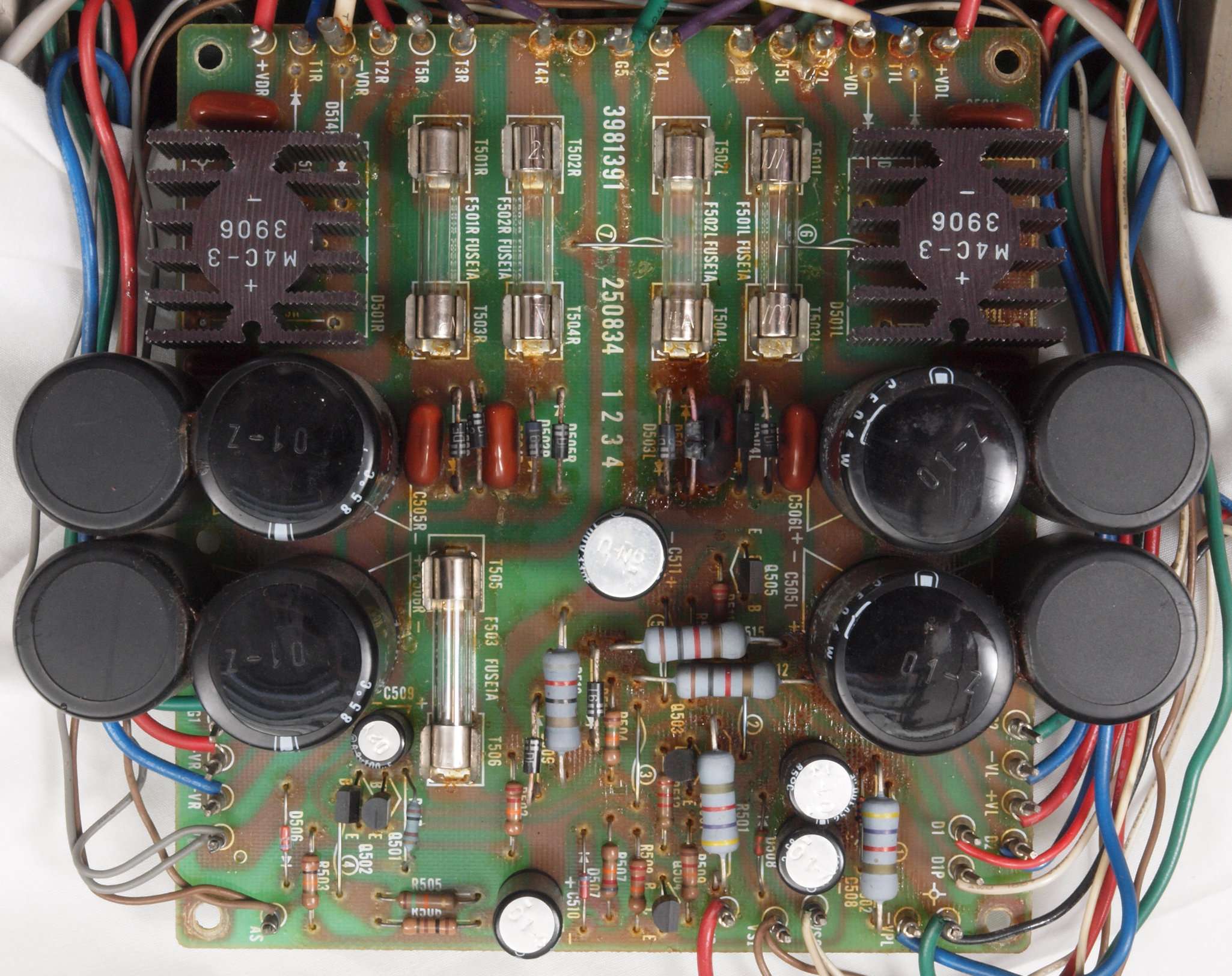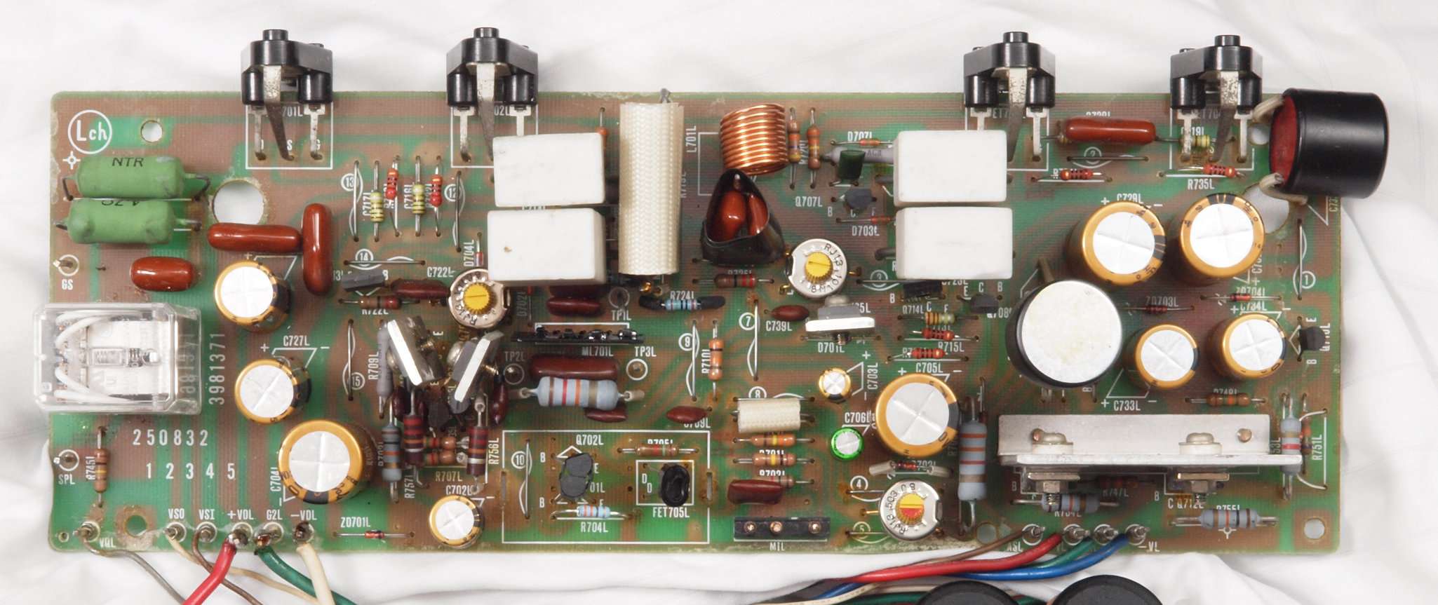 | C22. 修理後 L側ドライブ基板。 初段FET(電界効果トランジスター)、バランス/バイアス調整用半固定VR3個、SP接続リレー交換 ヒューズ入り抵抗全部、電解コンデンサー11個、足黒TR(トランジスター)6個交換。 |