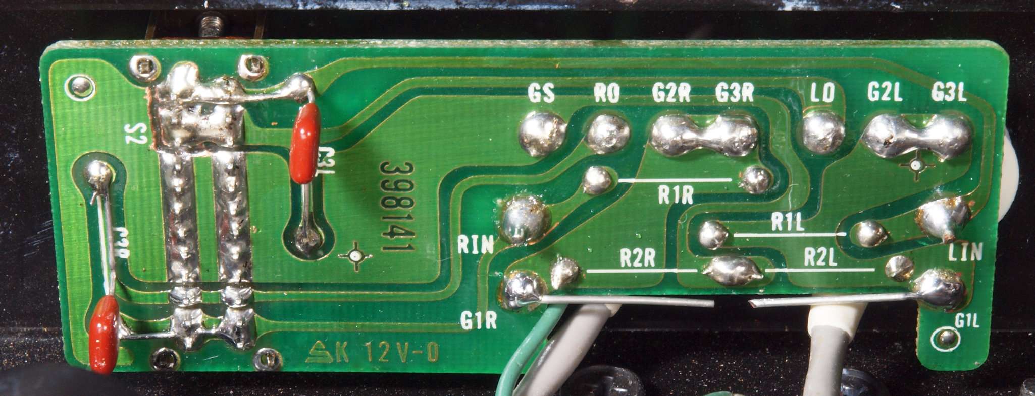 | C69. 修理(半田補正)後 入力RCA端子基板裏 半田を全部やり直す。 フイルムコンデンサー2個増設。 |