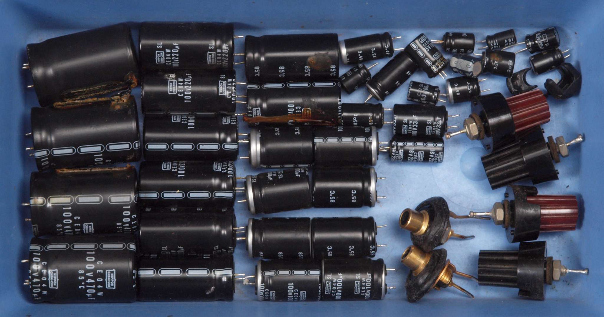 | A51. 点検中 電解コンデンサー外観比較、100μ/100V |