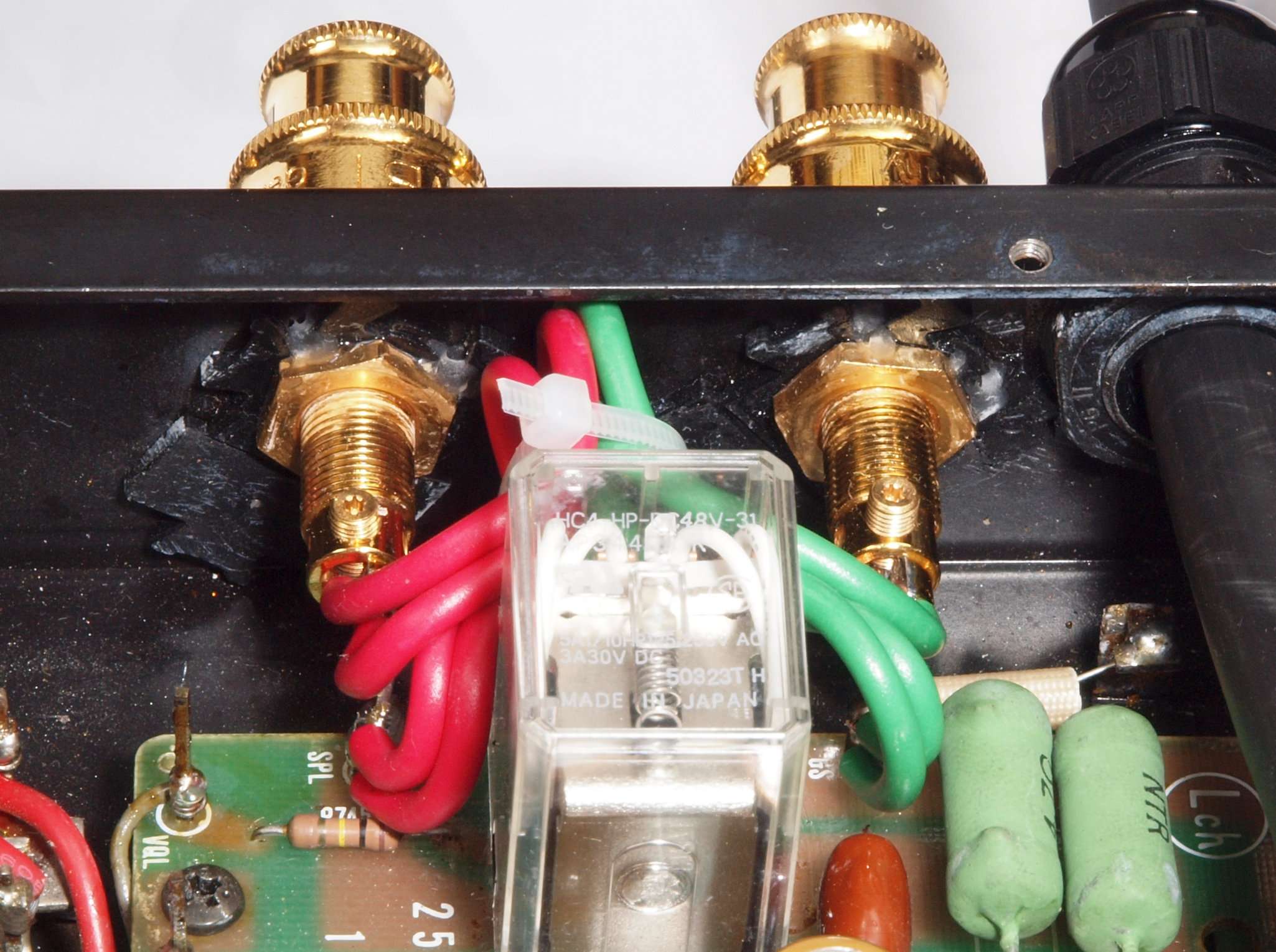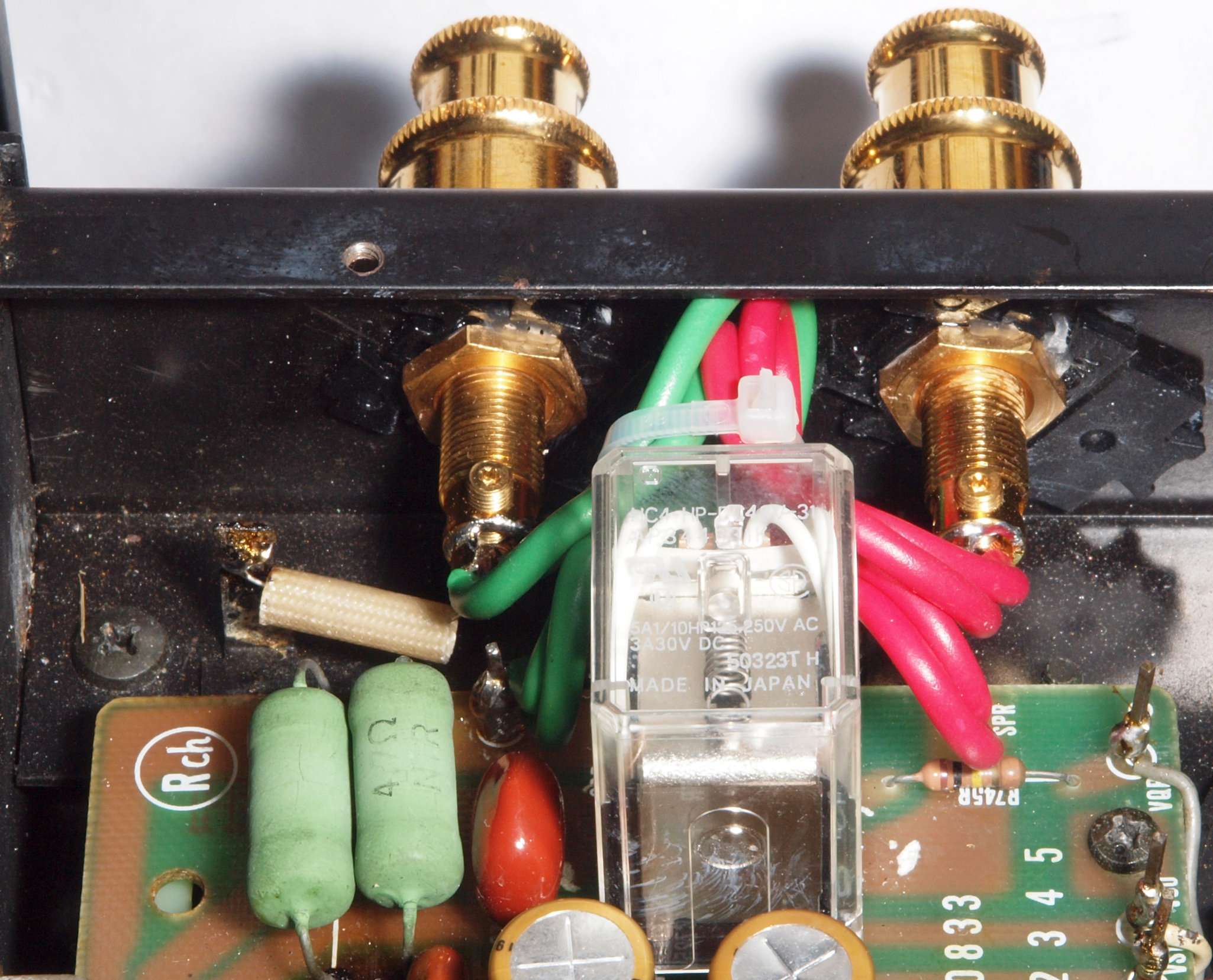 | C76. 修理後 R−SP端子裏配線。 WBTのネジ止めを生かし、ネジ止め接続+半田接続のW配線にした。理由はこちら。 白く着いているのは湿度が高かった為、接着材の蒸気、やがて消えます。 |