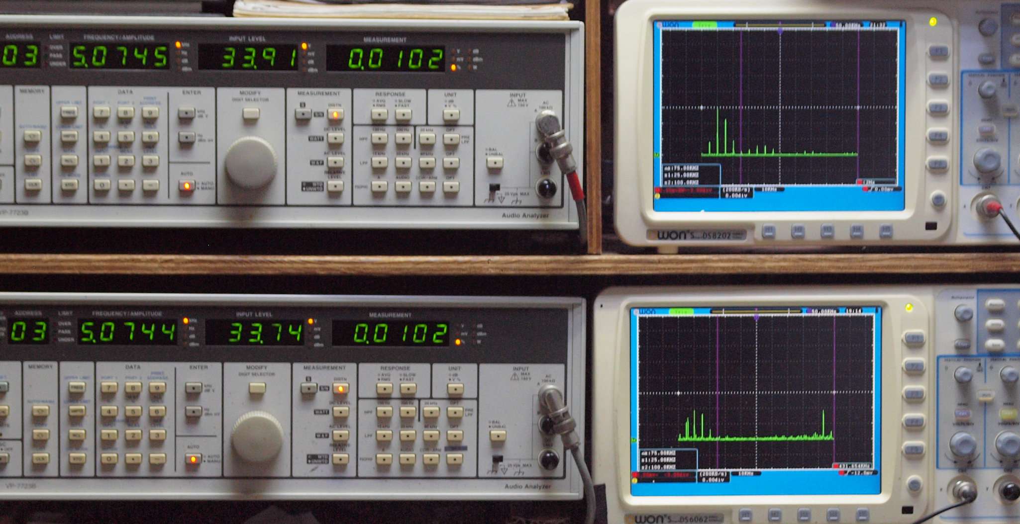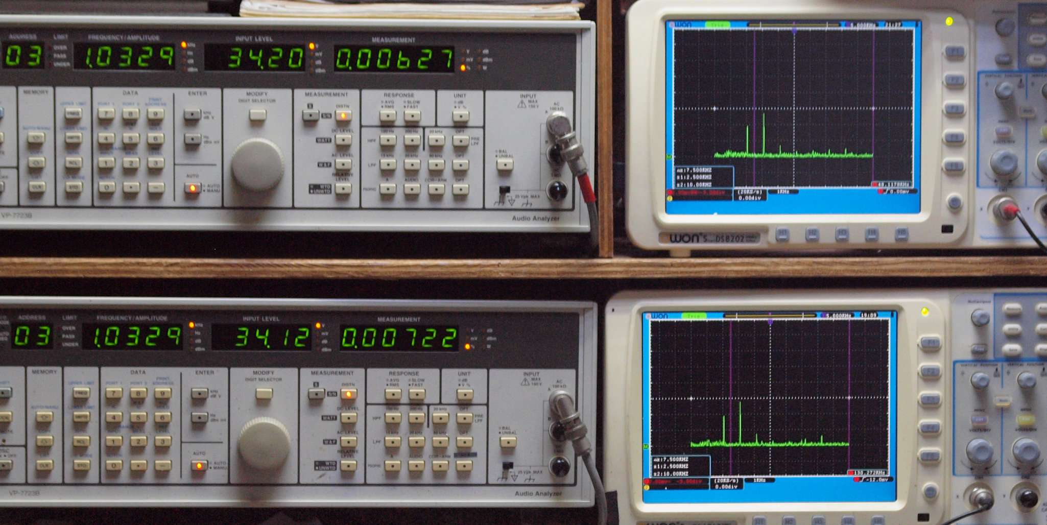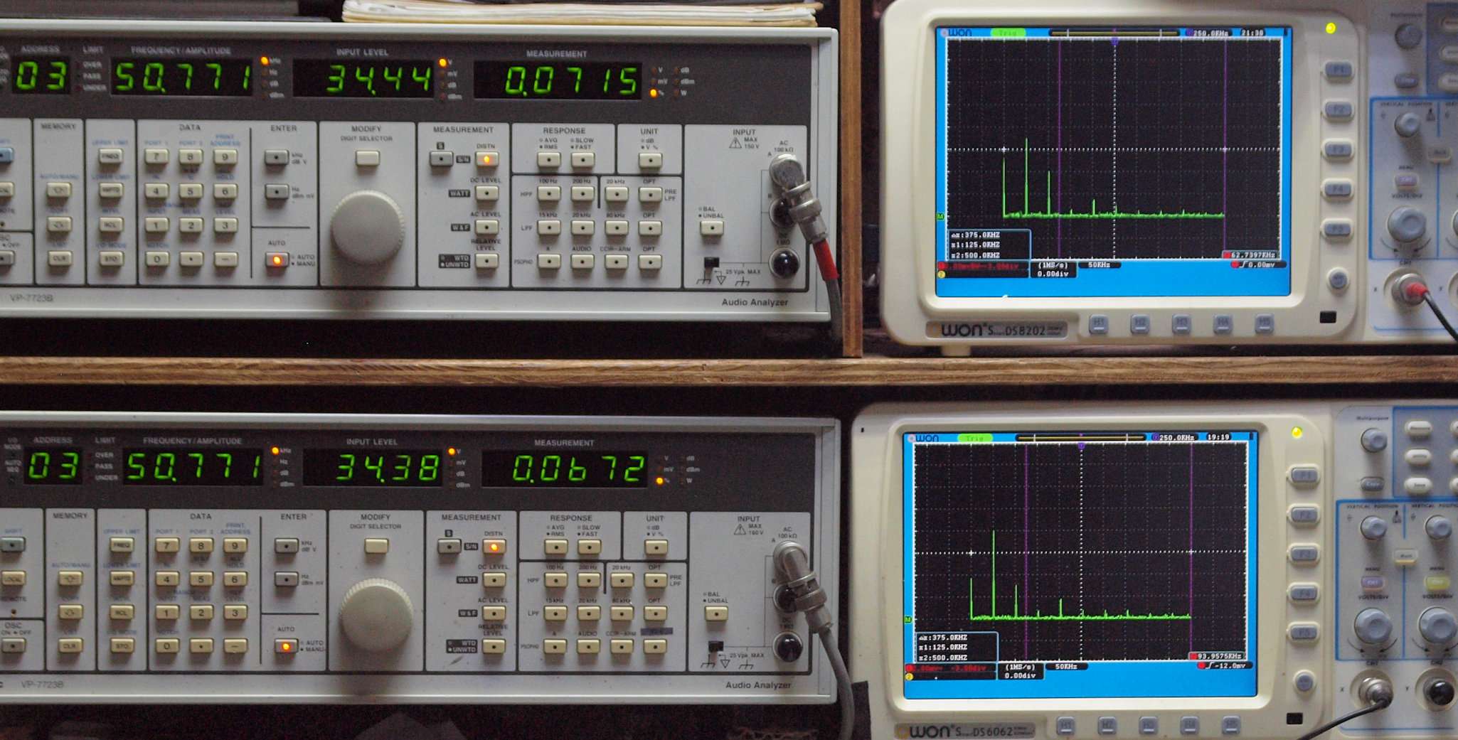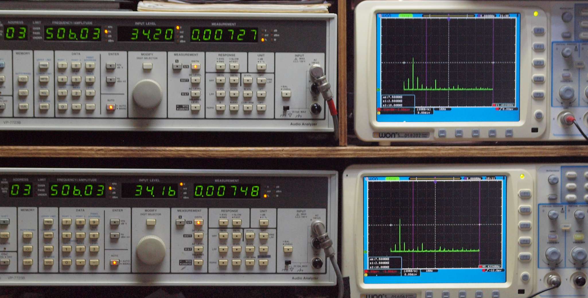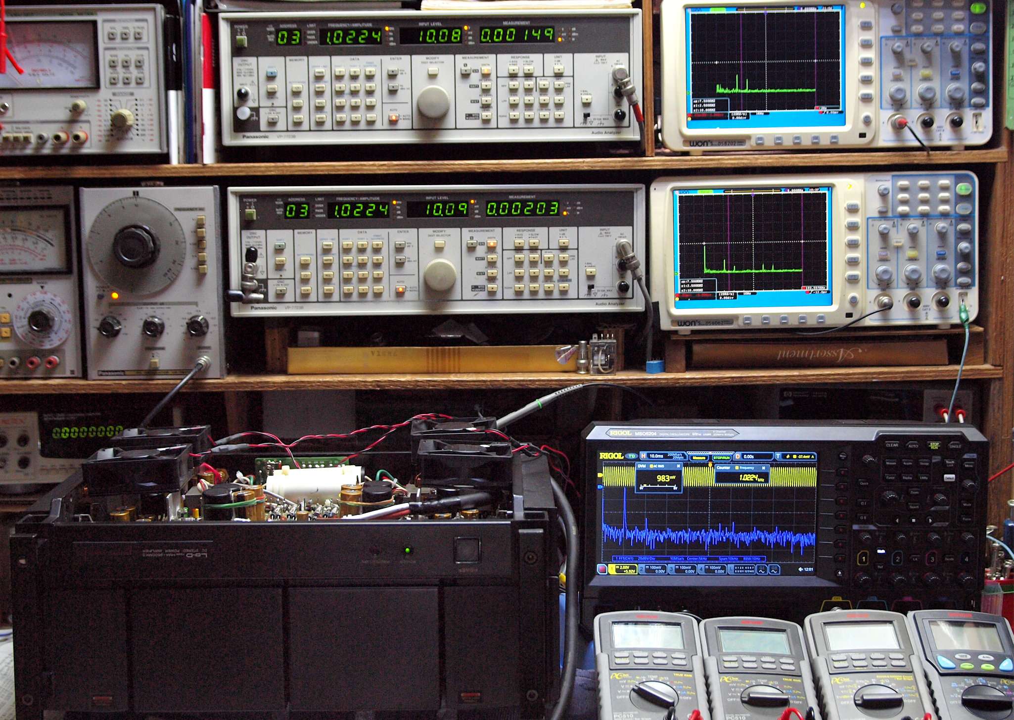 | E. 測定・調整。 画像をクリックすると、大きく(横幅2050ドット)表示されます。 E0. 出力・歪み率測定・調整 「見方」。 上段中 右側SP出力を「Audio Analyzer Panasonic VP−7723B」により測定。 表示LED、 左端=メモリーNo、 中左=周波数測定、 中右=出力電圧測定、 右端=歪み率測定。 上段右端 VP−7723Bの基本波除去出力を「owon SDS8202(200MHZ)」で「FFT分析」表示。 下段中 左側SP出力を「Audio Analyzer Panasonic VP−7723B」により測定。 表示LED、 左端=メモリーNo、 中左=周波数測定、 中右=出力電圧測定、 右端=歪み率測定。 下段右端 VP−7723Bの基本波除去出力を「owon SDS6062(200MHZ)」で「FFT分析」表示。 下段左端 オーディオ発振器 VP−7201A より50Hz〜100kHzの信号を出し(歪み率=約0.003%)、ATT+分配器を通し、AMPに入力。 よって、ダイアル設定出力レベルより低なります。測定機器の仕様や整備の様子はこちら、「VP−7723B」「VP−7201A」。 FFT画面の見方はこちら。 |