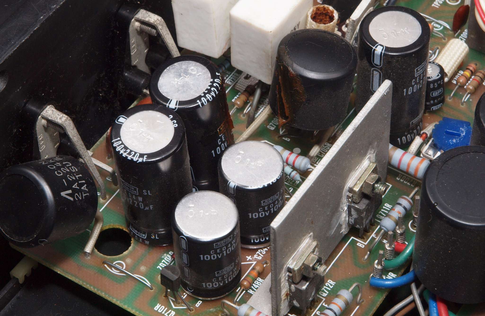 | CE2. 交換した部品、下のビニールが剥けた電解コンデンサー。 |