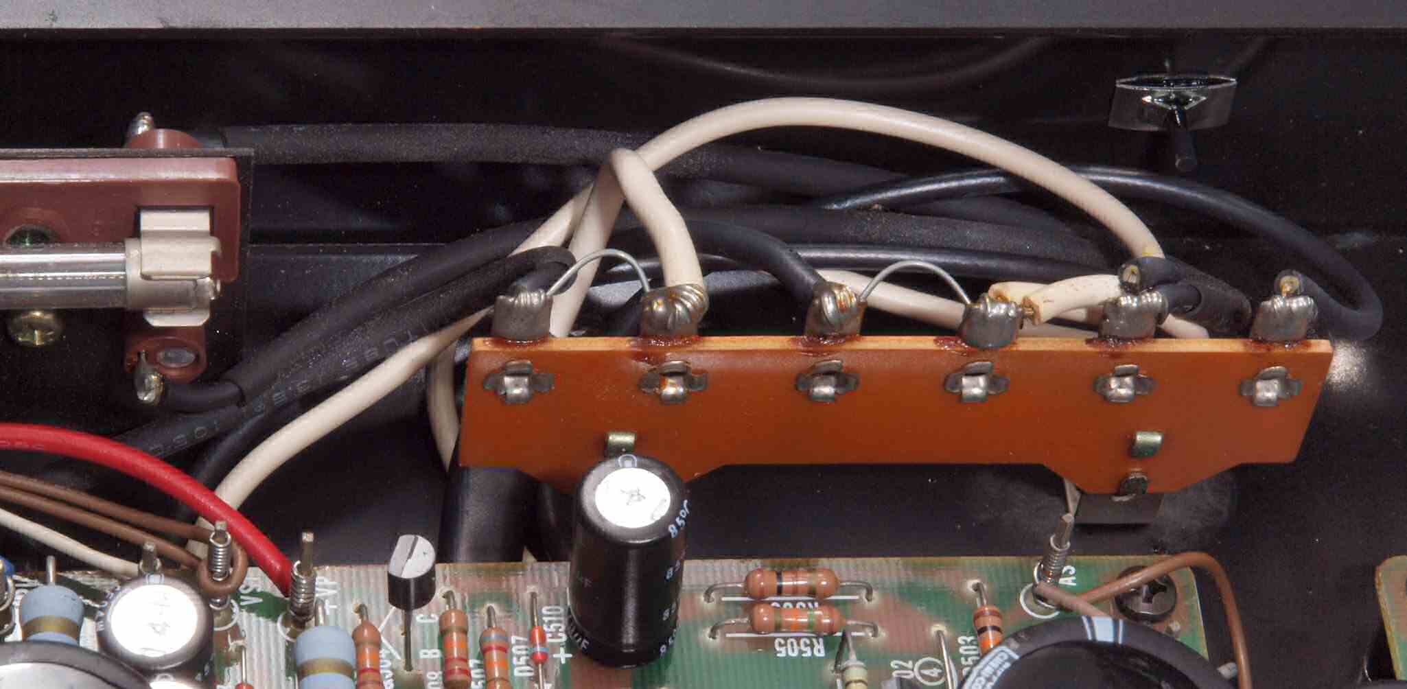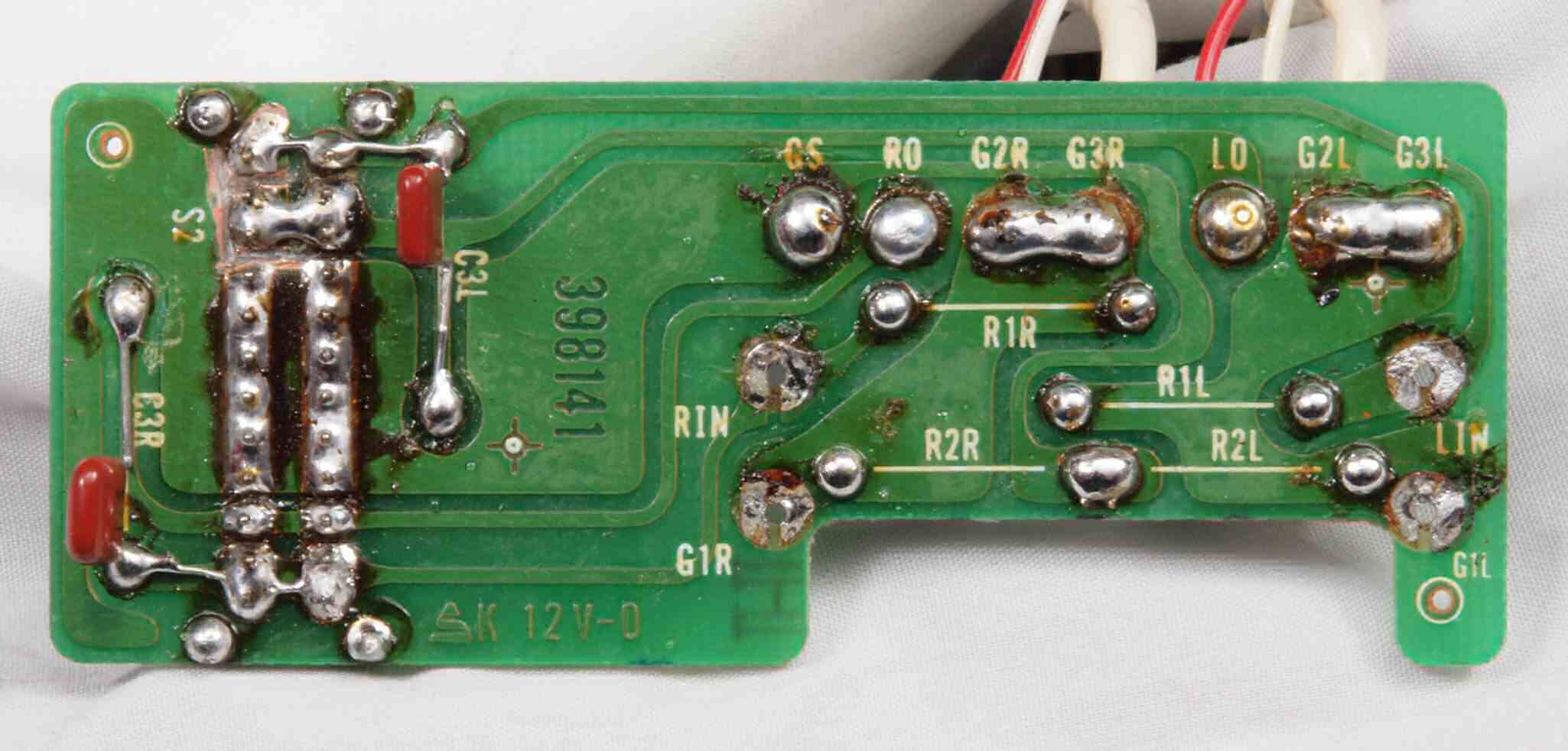C75. 修理(半田補正)後 入力RCA端子基板裏  半田を全部やり直す。 フイルムコンデンサー2個増設。