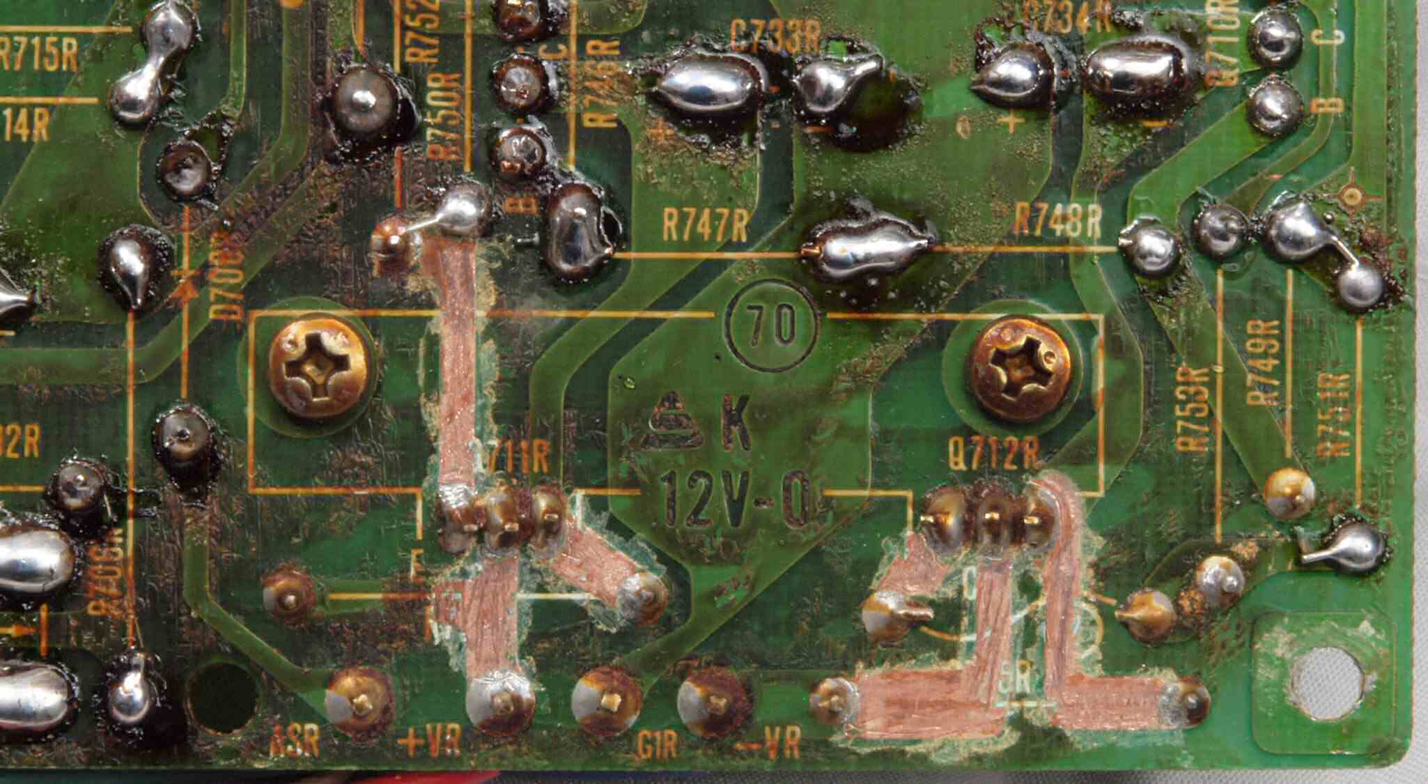C14. 修理中 R側ドライブ基板裏 定電圧TR(トランジスター)の足の銅箔を広げる。