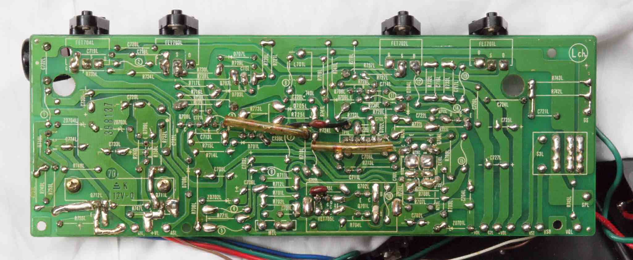 C74. 修理中 入力RCA端子基板裏 L側もW−SWにする為、基板改造。