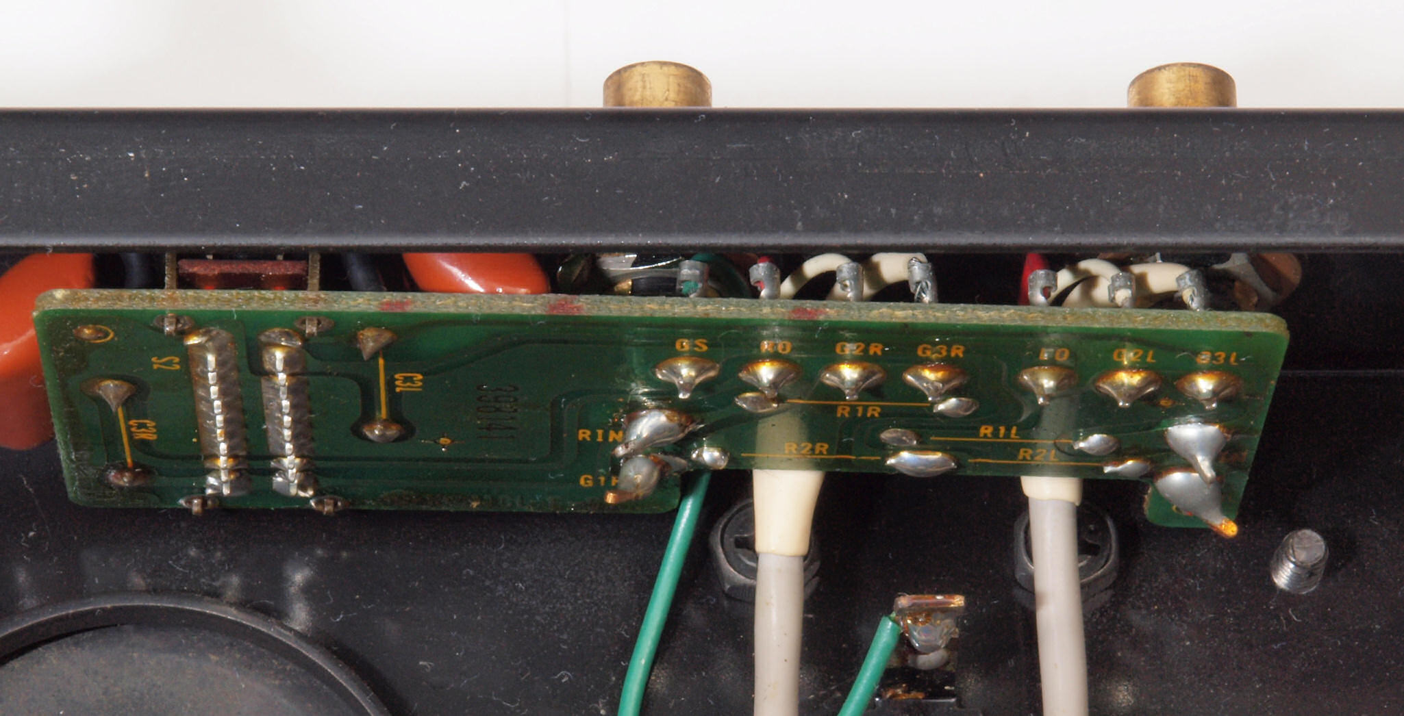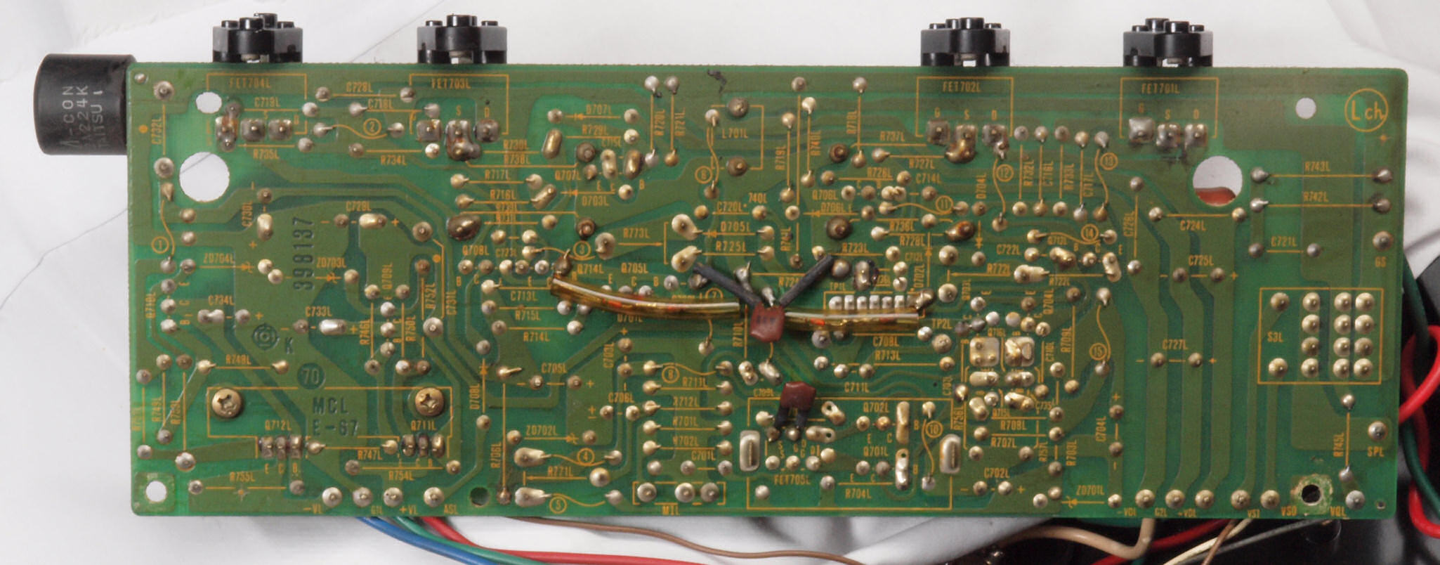 C782. 修理中 入力RCA端子基板取付裏、少し基板が斜めに取り付け。