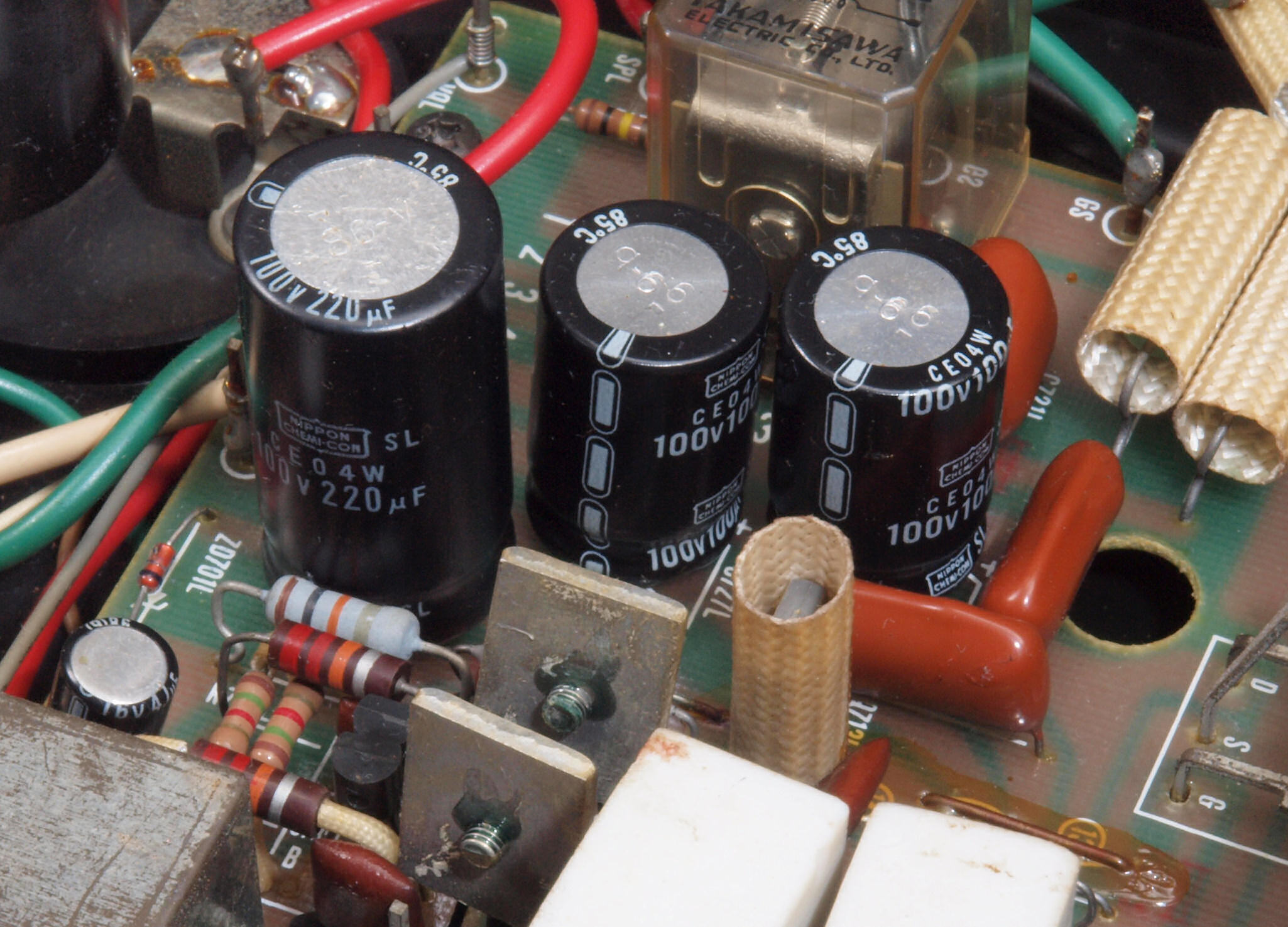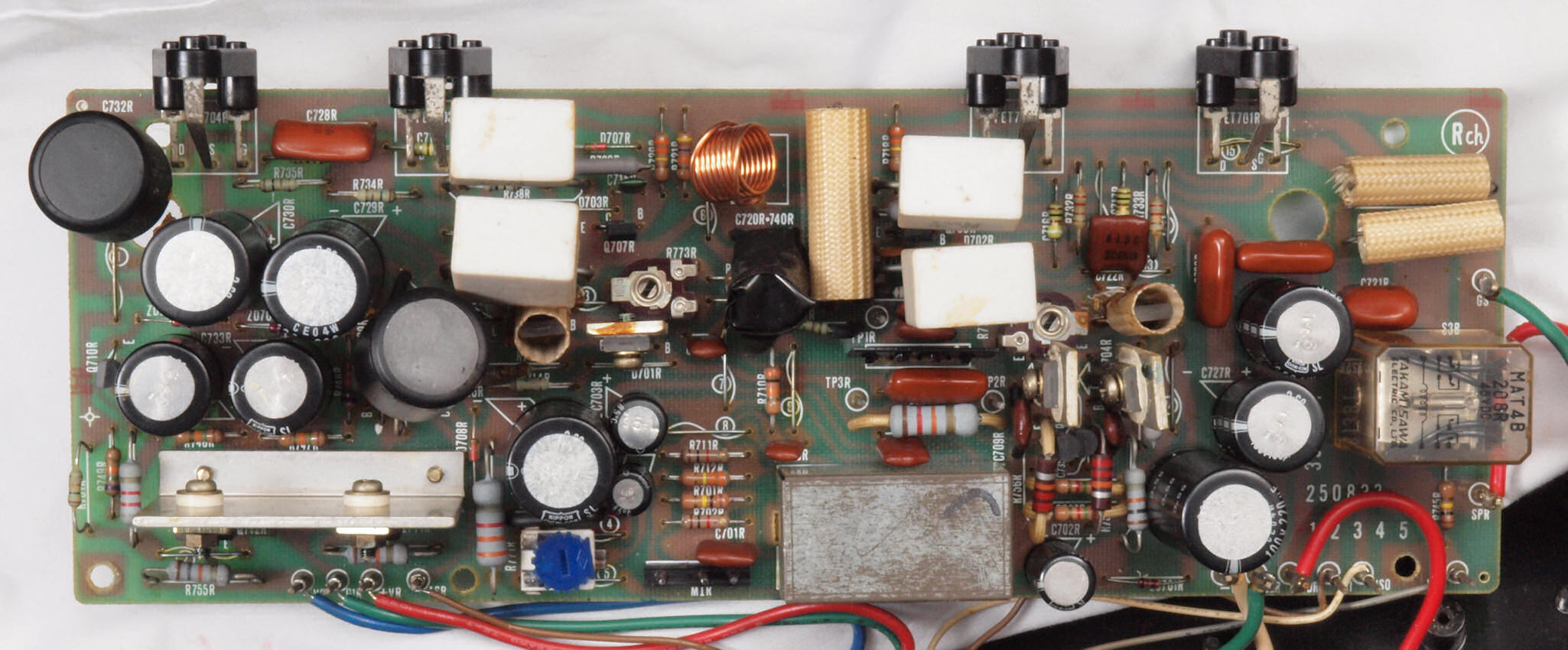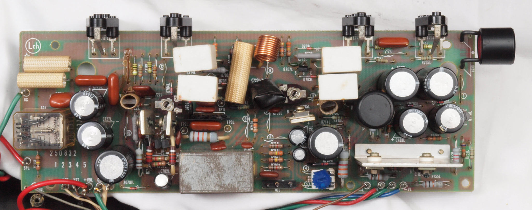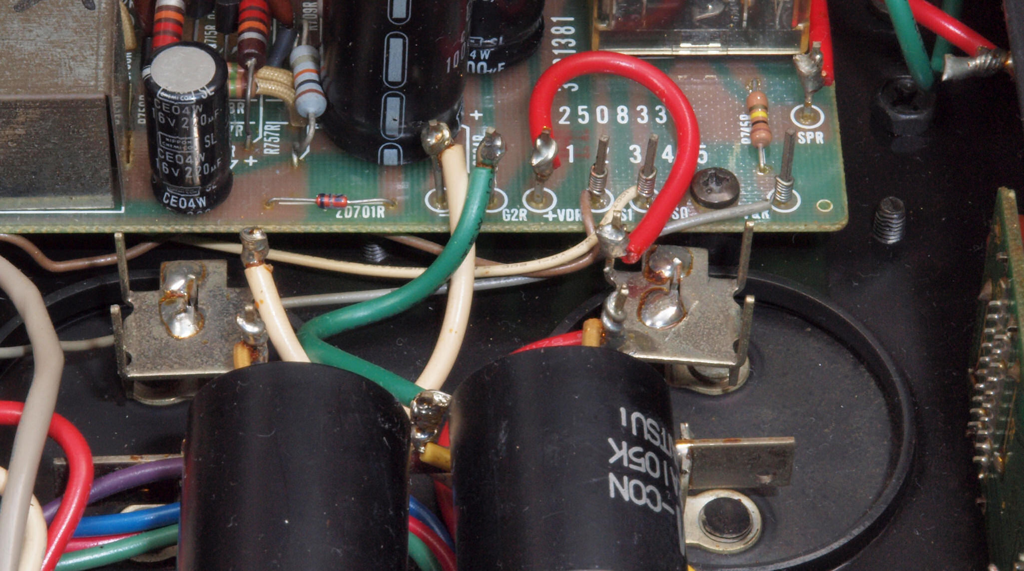 AA2. 点検中 左右アンプ基板の電解コンデンサーが異なる! 製造時からか? 上=右側基板220μF/16V、上=左側基板47μF/25V。