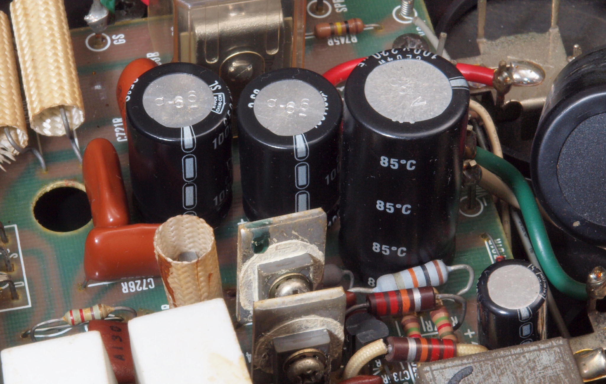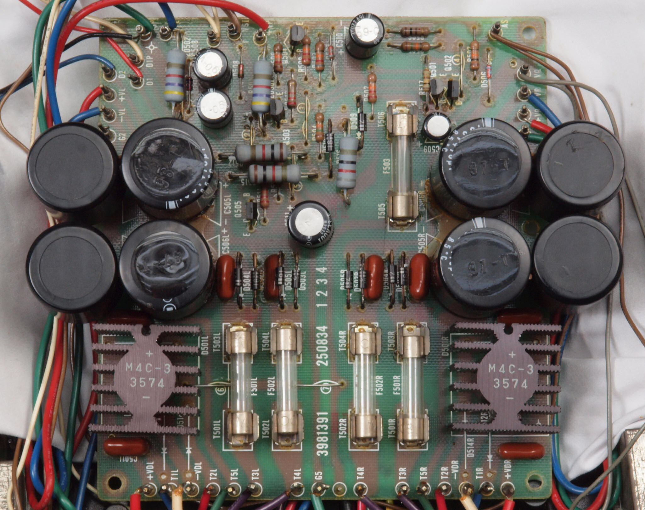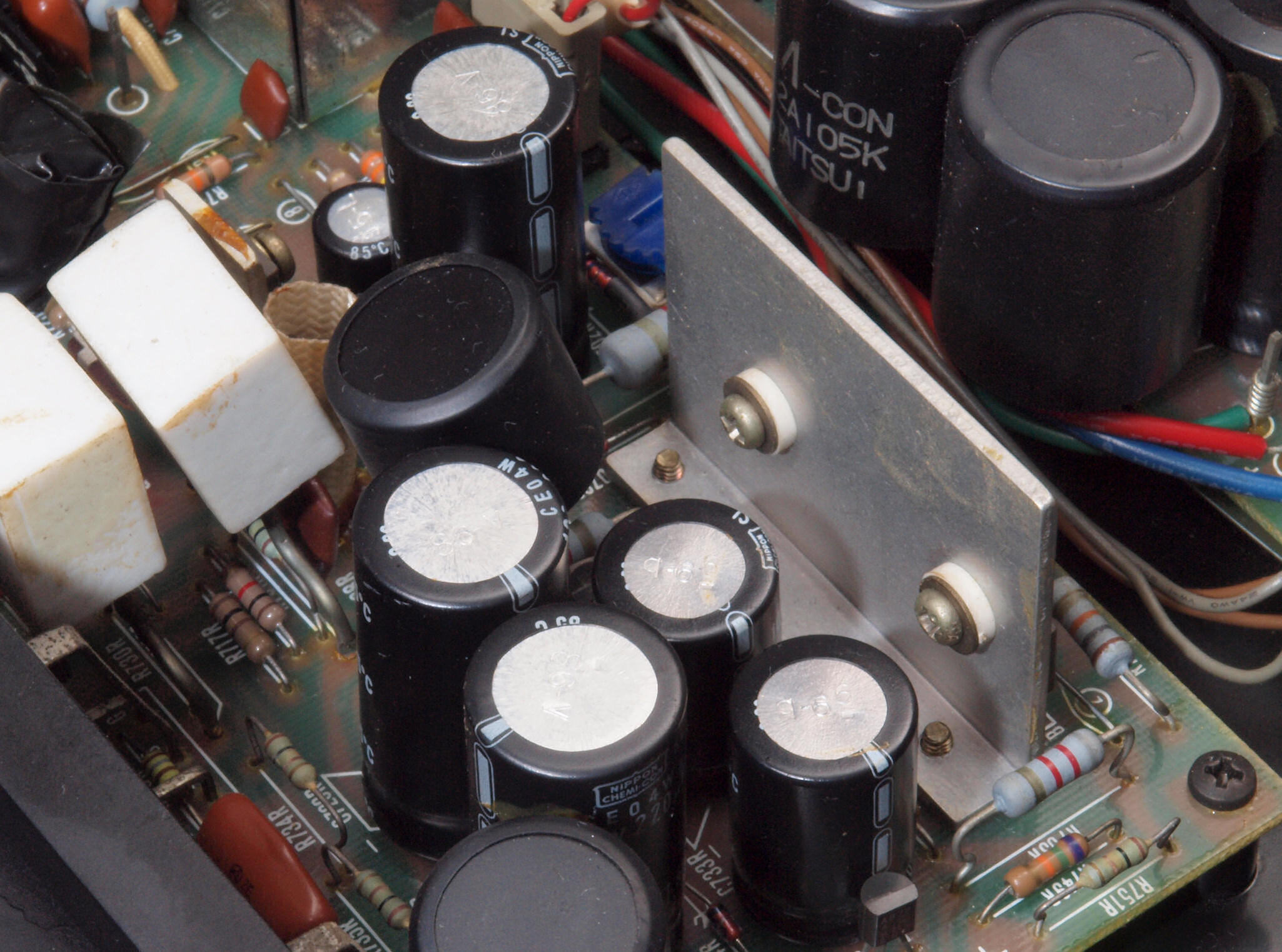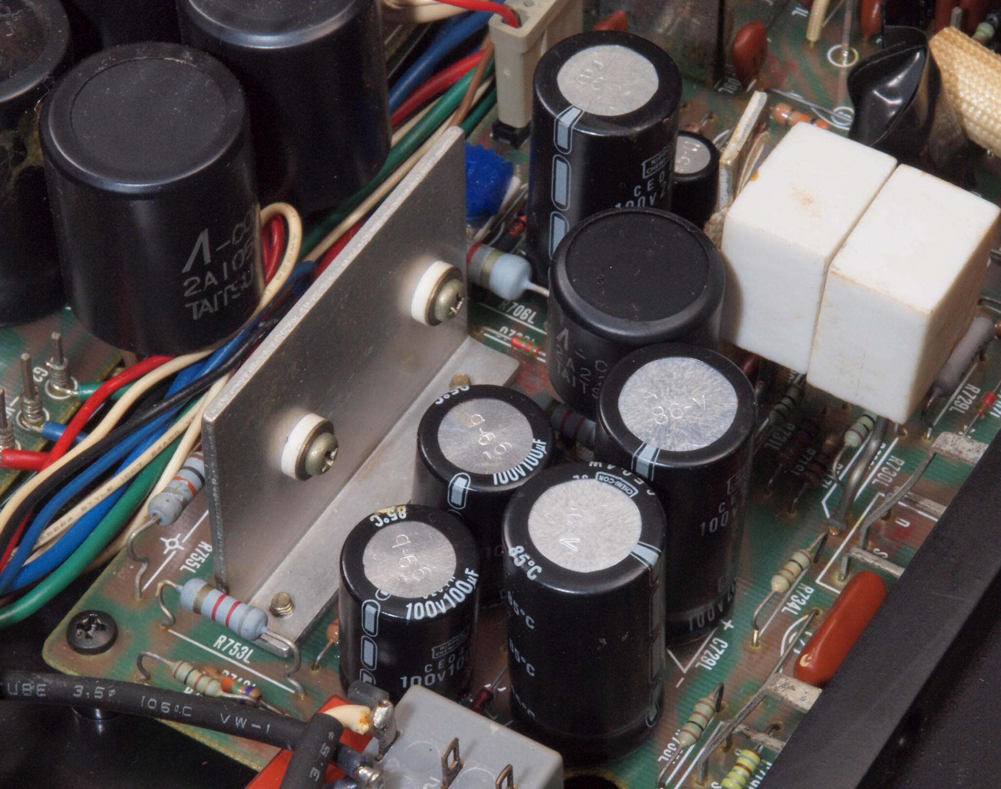 AA2. 点検中 左右アンプ基板の電解コンデンサーが異なる! 製造時からか? 上=右側基板220μF/16V、上=左側基板47μF/25V。