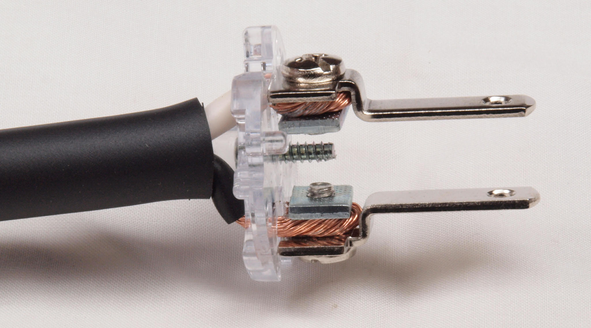 CBC. 修理中 3Pプラグにケーブル取り付。差し込み固定が一般ですが、時計方向に巻き付けると良い、反対側。