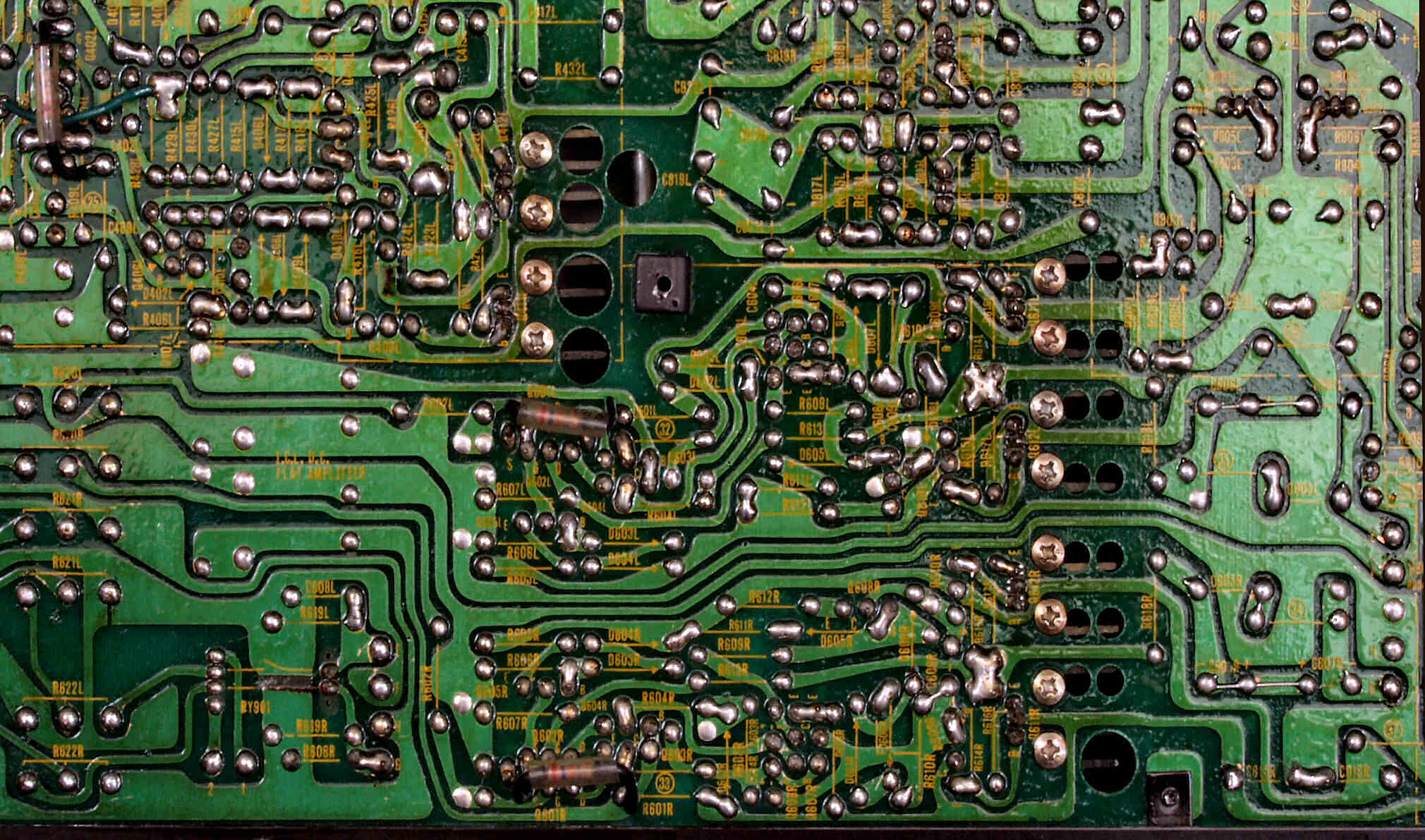 C2D. 修理(半田補正)後 EQ−HEAD-AMP部基板裏。  全ての半田をやり修す。