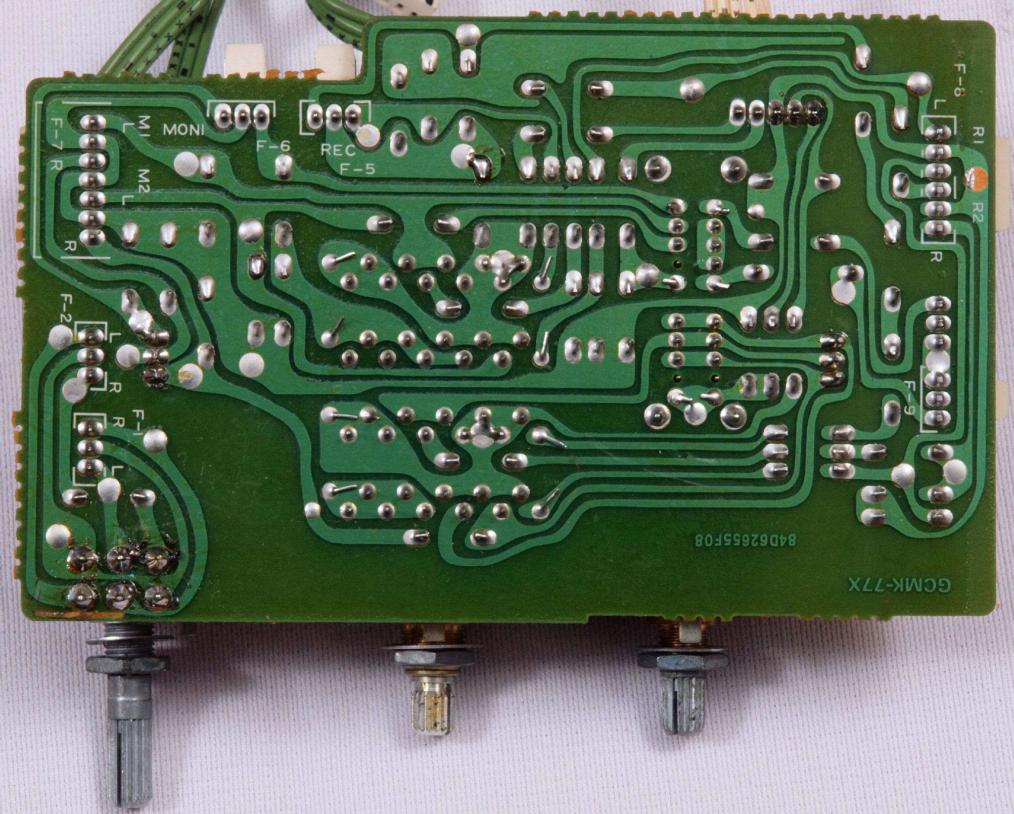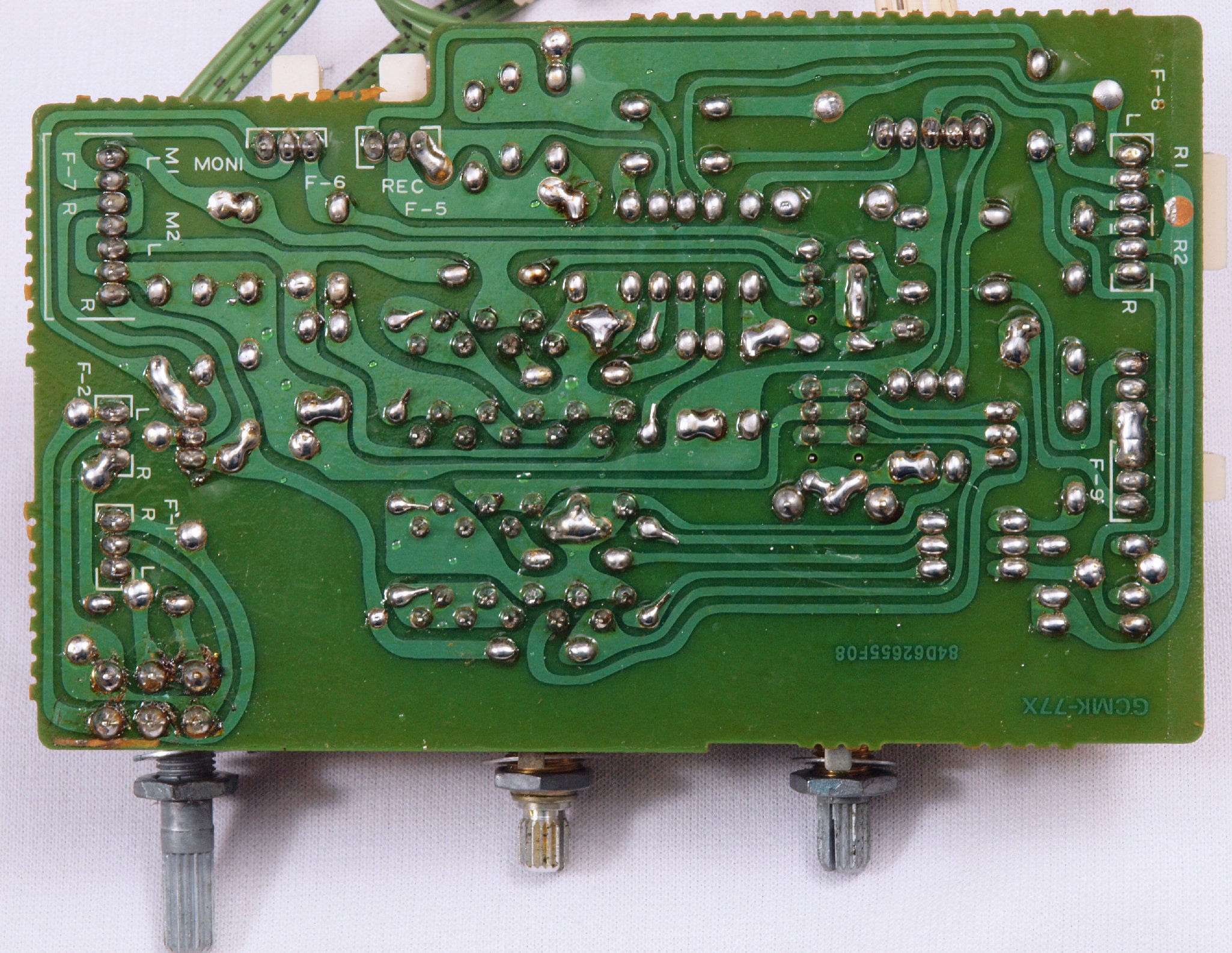 | C532. 修理前 BALANCE_VR、TAPE_MONITOR_SW基板裏。 | ||||||||||||||||||||||||||||||||||||||||||
