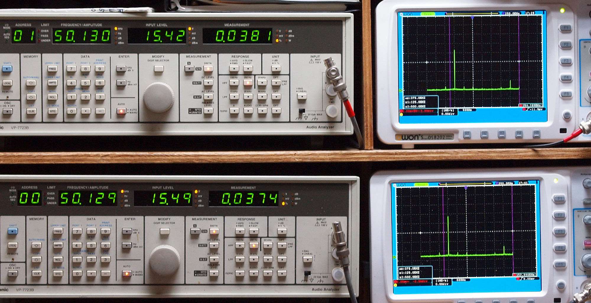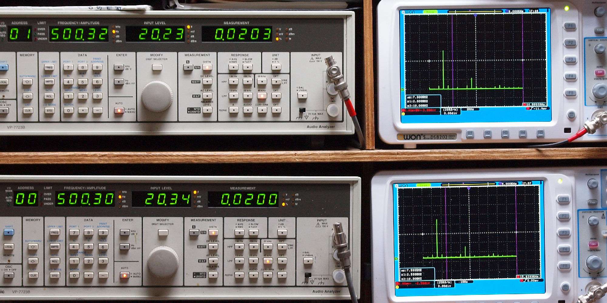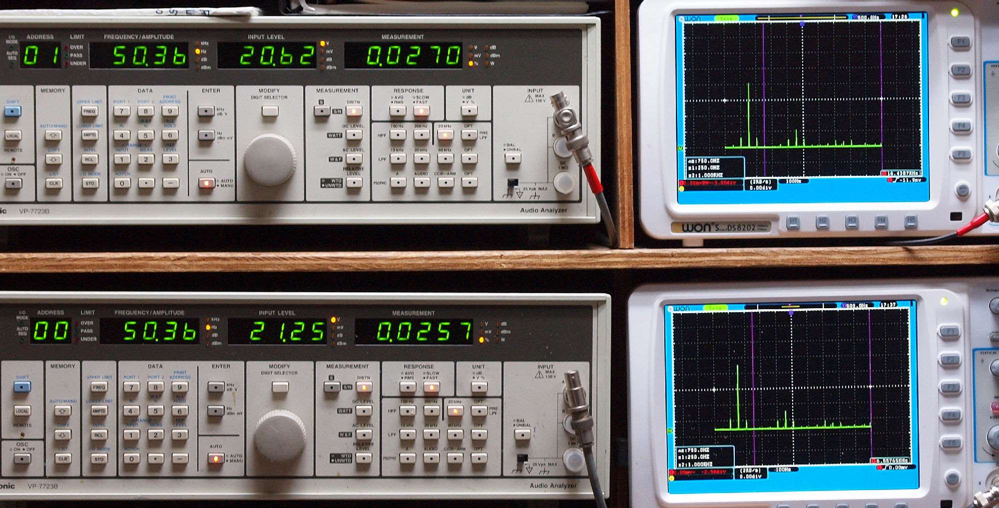 | E. 測定・調整。 画像をクリックすると、大きく(横幅2050ドット)表示されます。 E1. 出力・歪み率測定・調整 「見方」。 上段中 右側SP出力を「Audio Analyzer Panasonic VP−7723B」により測定。 表示LED、 左端=メモリーNo、 中左=周波数測定、 中右=出力電圧測定、 右端=歪み率測定。 上段右端 VP−7723Bの基本波除去出力を「owon SDS8202(200MHZ)」で「FFT分析」表示。 下段中 左側SP出力を「Audio Analyzer Panasonic VP−7723B」により測定。 表示LED、 左端=メモリーNo、 中左=周波数測定、 中右=出力電圧測定、 右端=歪み率測定。 下段右端 VP−7723Bの基本波除去出力を「owon SDS6062(200MHZ)」で「FFT分析」表示。 下段左端 オーディオ発振器 VP−7201A より50Hz〜100kHzの信号を出し(歪み率=約0.003%)、ATT+分配器を通し、AMPに入力。 よって、ダイアル設定出力レベルより低くなります。測定機器の仕様や整備の様子はこちら、「VP−7723B」「VP−7201A」。 FFT画面の見方はこちら。 |