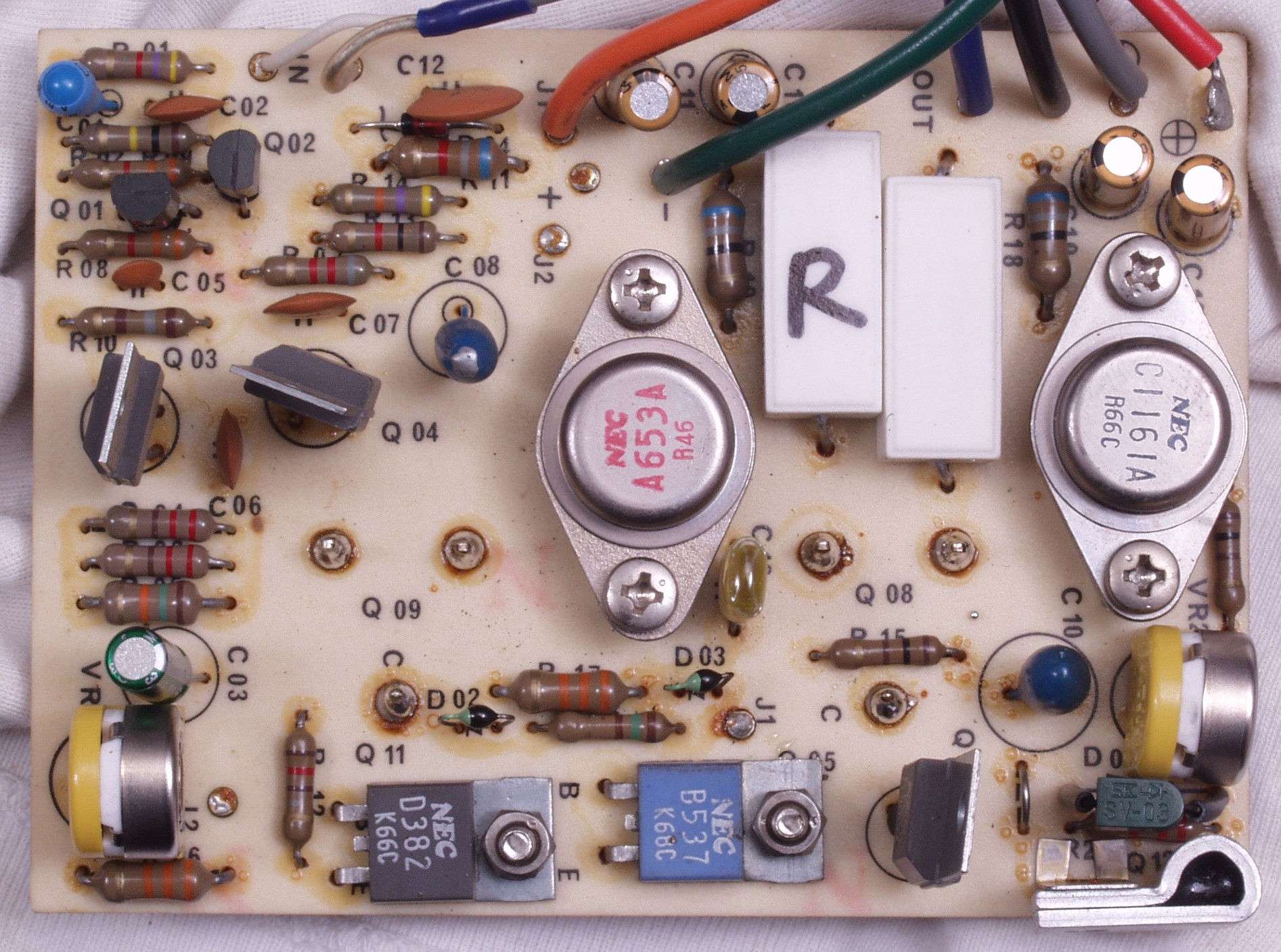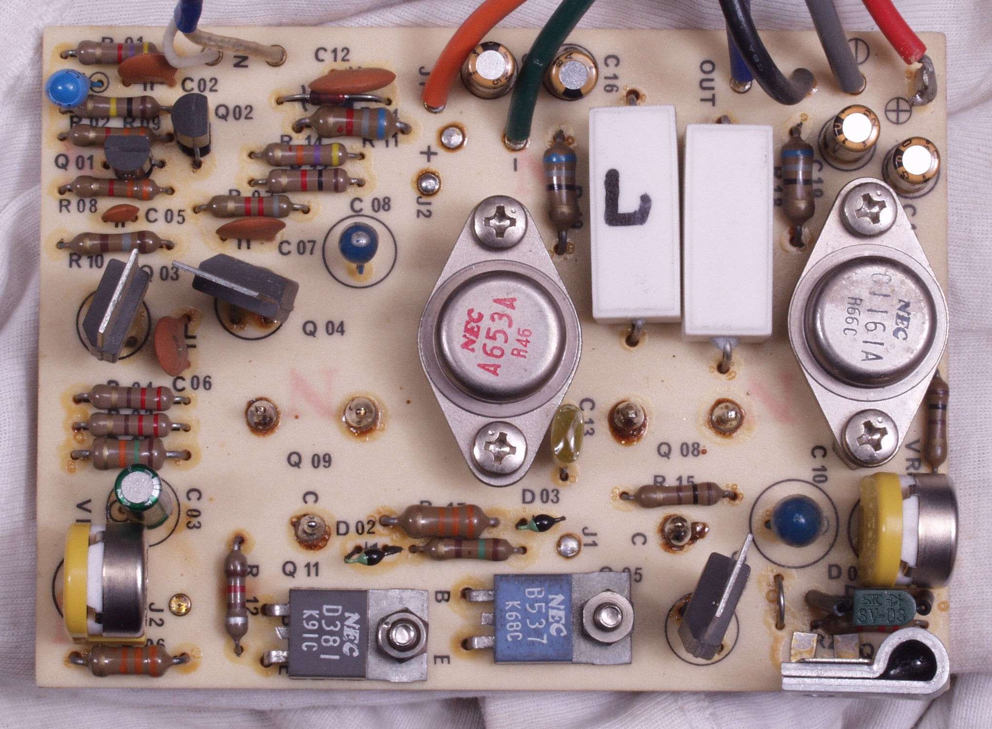 | C−2B.修理後 左終段基板 半固定VR2個、電解コンデンサー5個、フイルムコンデンサー、TR(トランジスター)2個交換 |