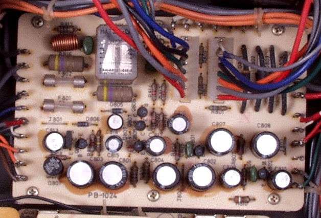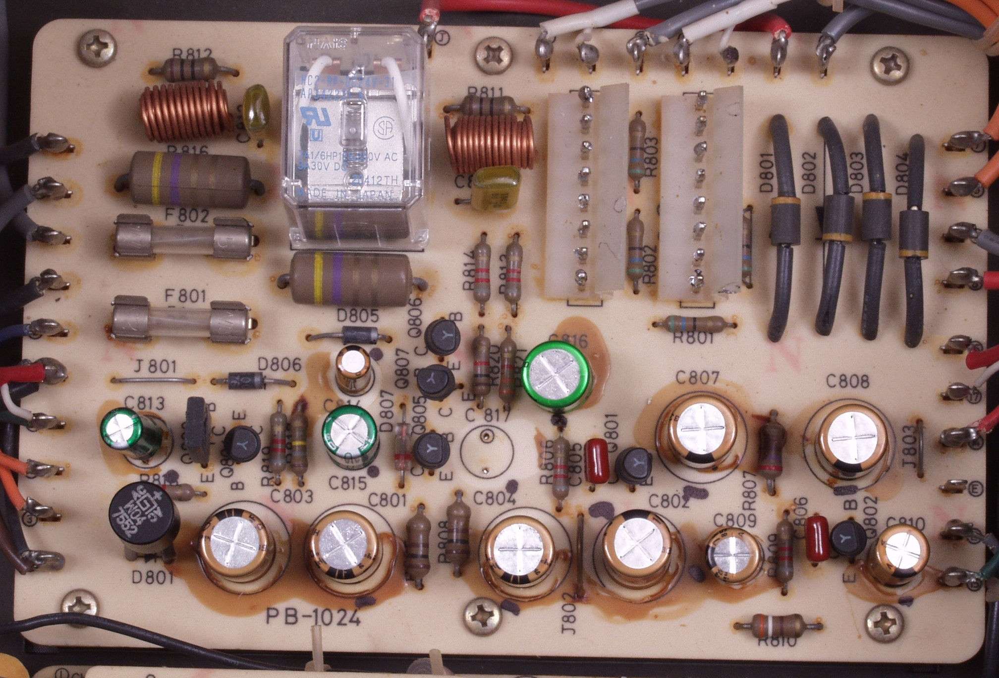| C−3B.修理後 電源・プロテクト基板 SP接続リレー、電解コンデンサー12個、フイルムコンデンサー4個交換 |