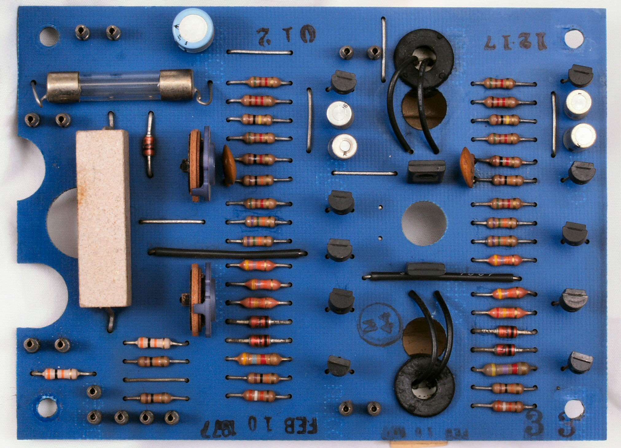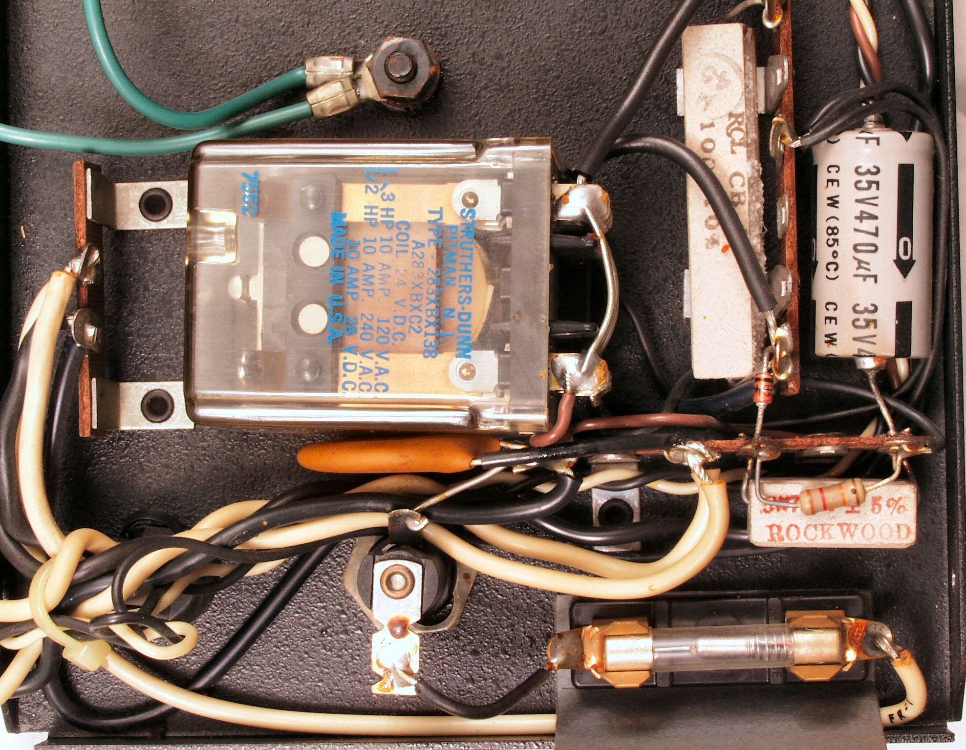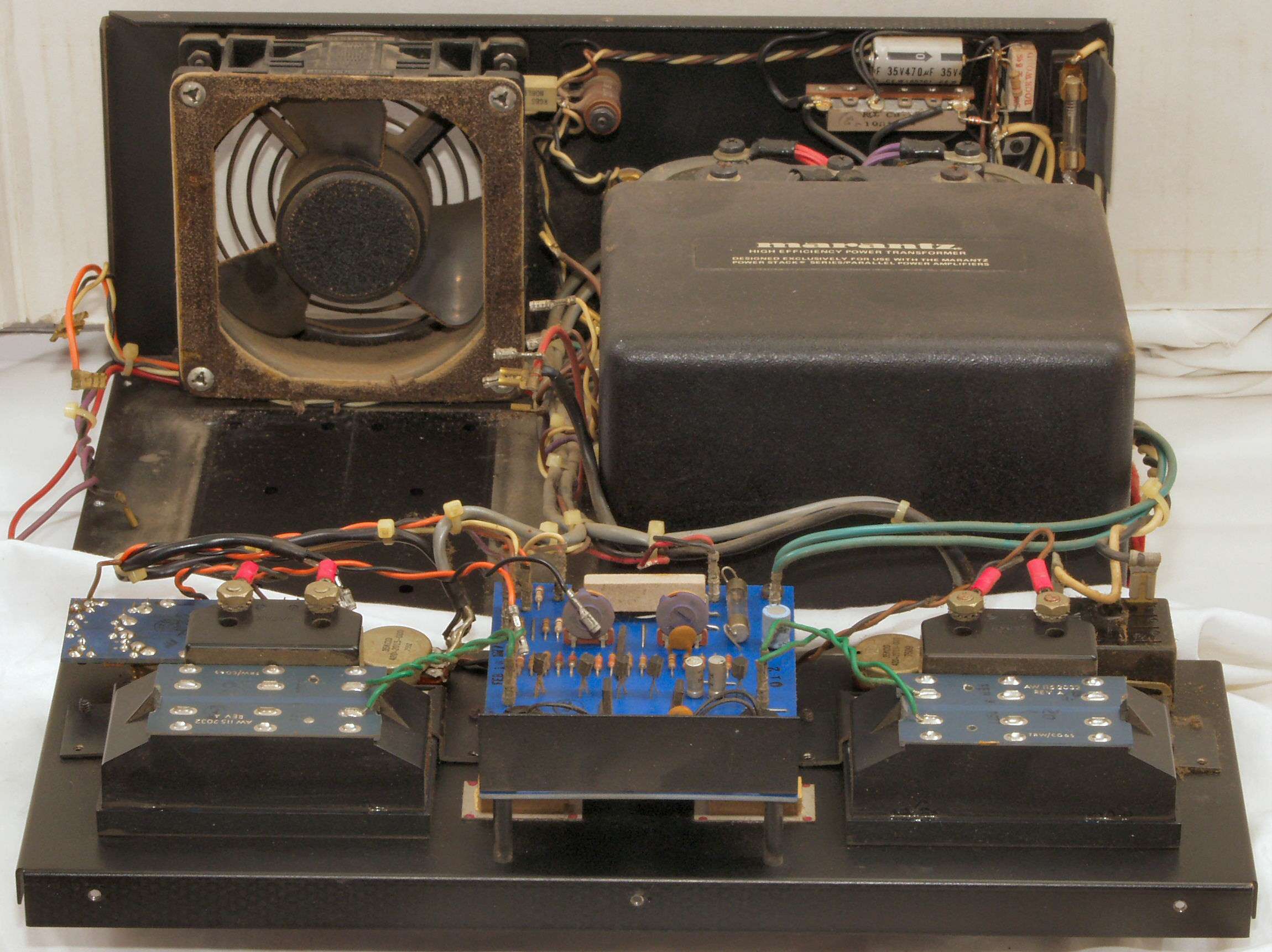 R31. 修理(交換)後 電源の電源ブロック電解コンデンサー。フイルムコンデンサー2個、ヒューズ4個追加。