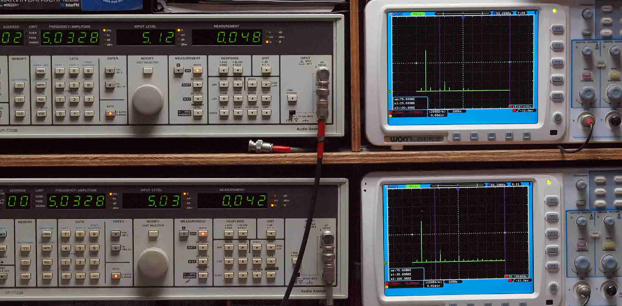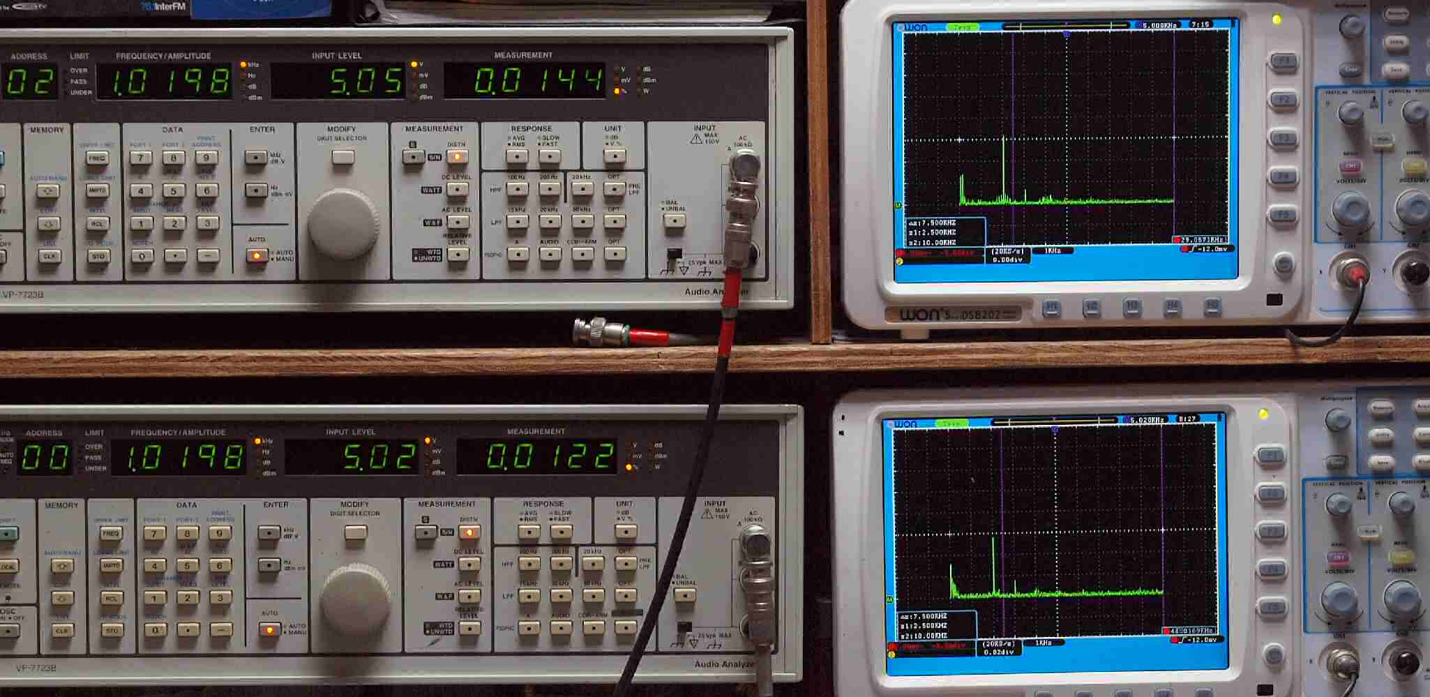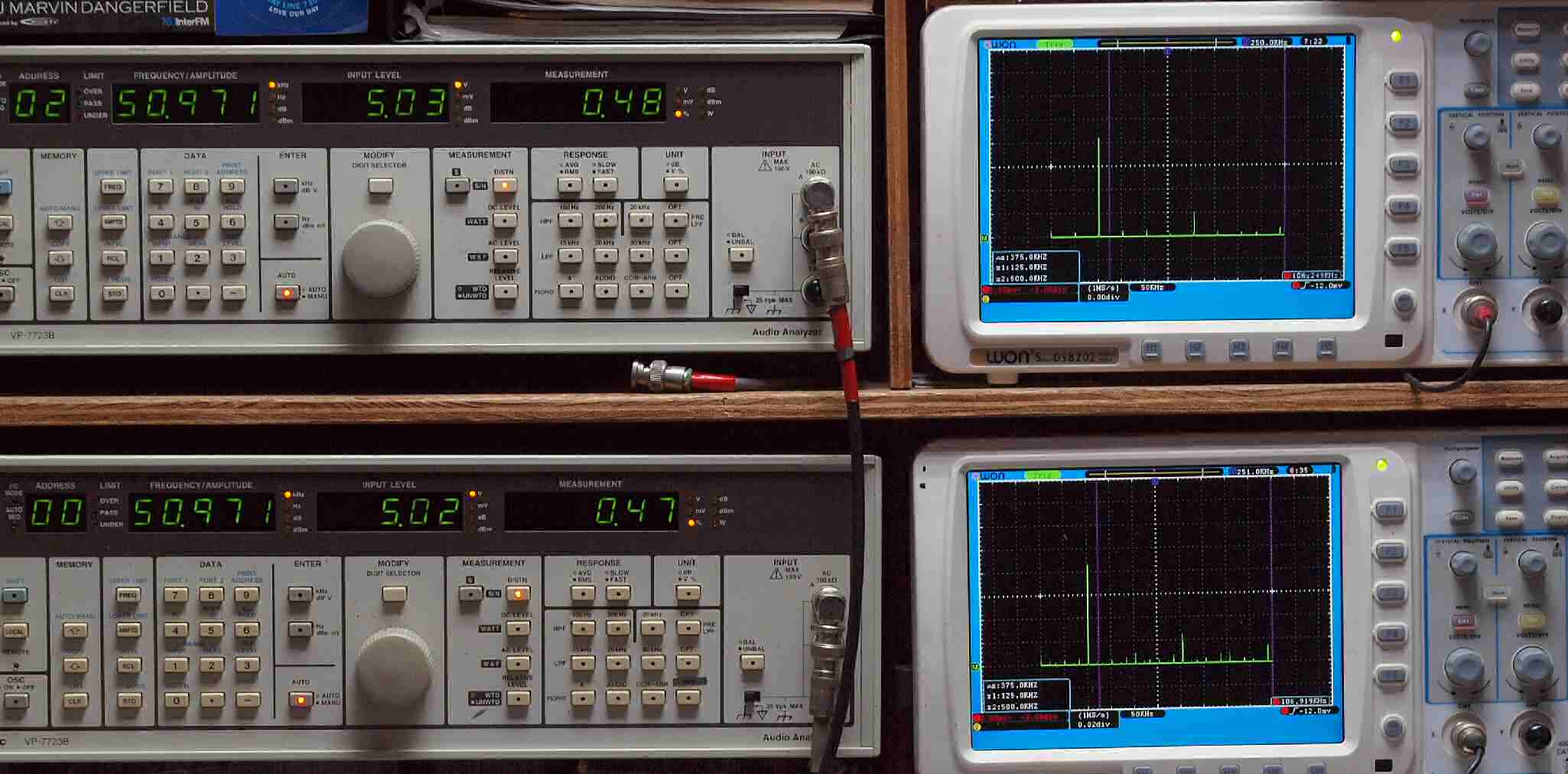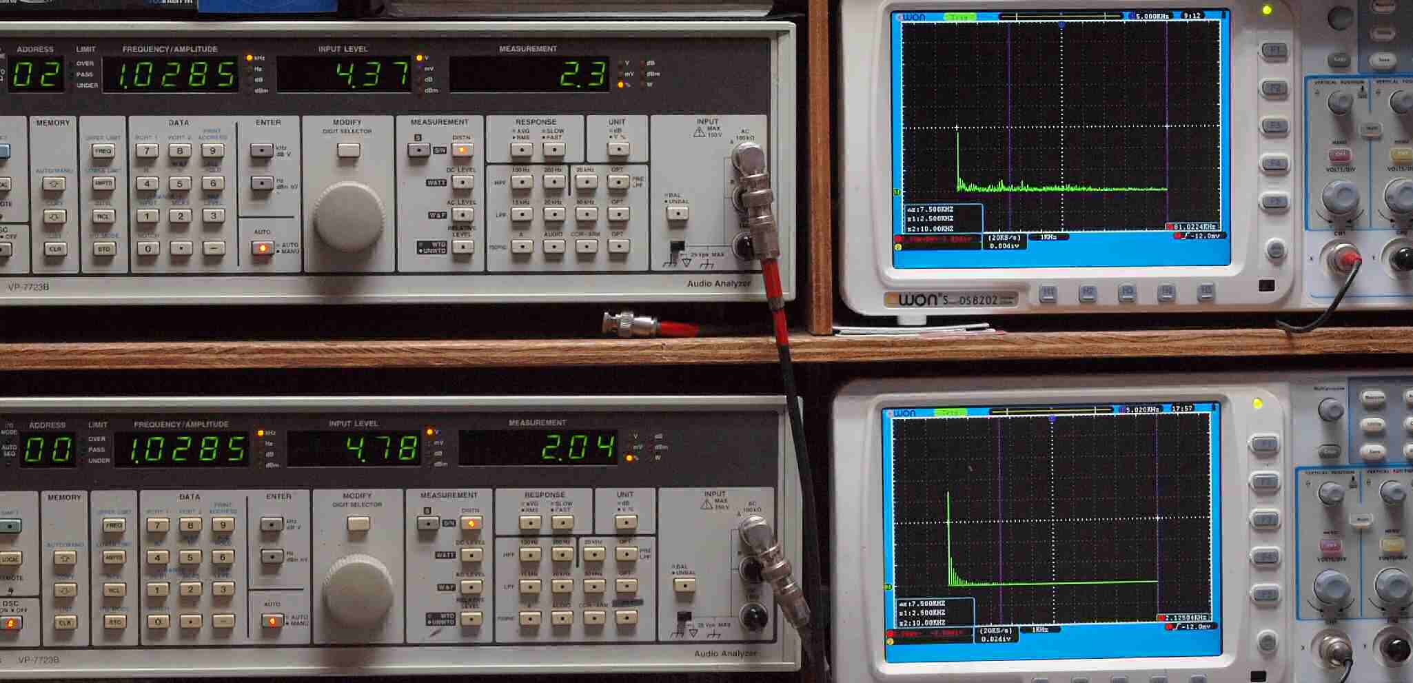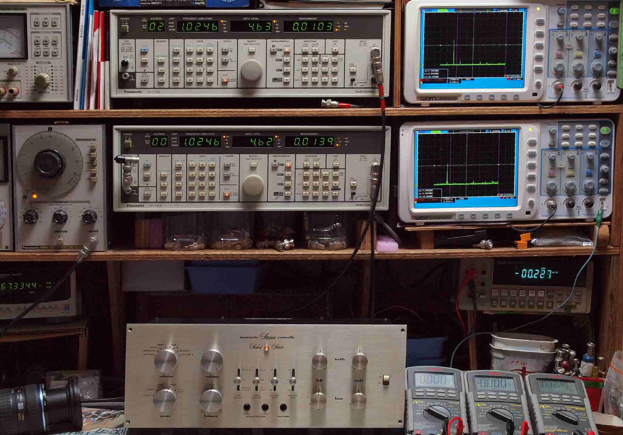 | E. 調整・測定。 画像をクリックすると、大きく(横幅2050ドット)表示されます。 E1. 出力・歪み率測定・調整。 「見方」。 上段中 右側出力を「Audio Analyzer Panasonic VP−7723B」により測定。 表示LED、 左端=メモリーNo、 中左=周波数測定、 中右=出力電圧測定、 右端=歪み率測定。 上段右端 VP−7723Bの基本波除去出力を「owon SDS8202(200MHZ)」で「FFT分析」表示。 下段中 左側出力を「Audio Analyzer Panasonic VP−7723B」により測定。 表示LED、 左端=メモリーNo、 中左=周波数測定、 中右=出力電圧測定、 右端=歪み率測定。 下段右端 VP−7723Bの基本波除去出力を「owon SDS6062(200MHZ)」で「FFT分析」表示。 下段左端 オーディオ発振器 VP−7201A より50Hz〜100kHzの信号を出し(歪み率=約0.003%)、ATT+分配器を通し、AMPに入力。 よって、ダイアル設定出力レベルより低くなります。測定機器の仕様や整備の様子はこちら、「VP−7723B」「VP−7201A」。 FFT画面の見方はこちら。 |