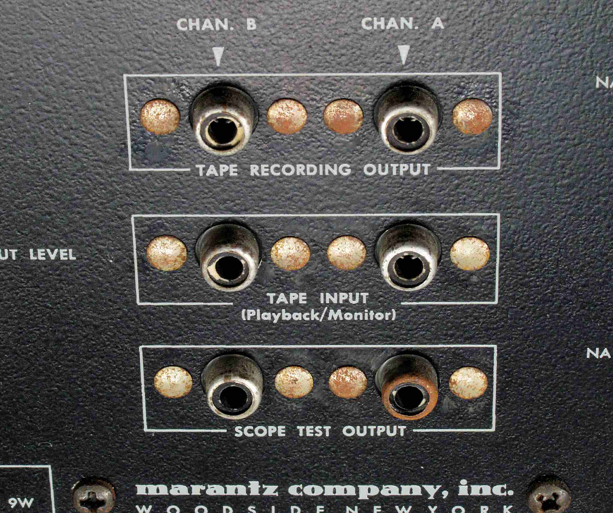 | A73. 点検中 TAPE入出力RCA端子郡、RL出力RCA端子郡、センター出力RCA端子郡。 テフロン絶縁仕様に交換可能。 |