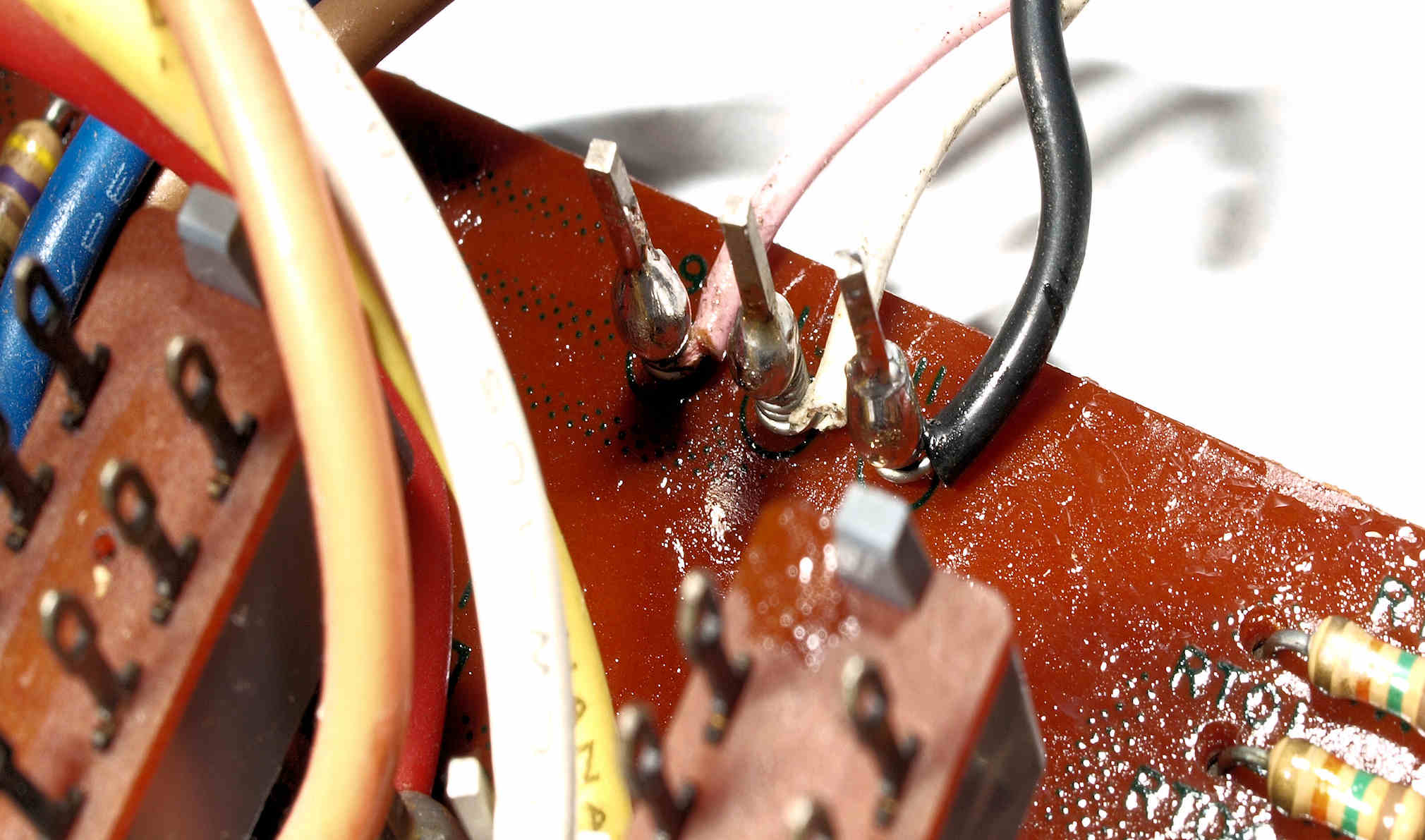 | CB6. 完成EQ・AMP・TR(トランジスター)基板裏、コート液を塗り、乾燥後。 | ||||||||||||||||||||||||||||||||||